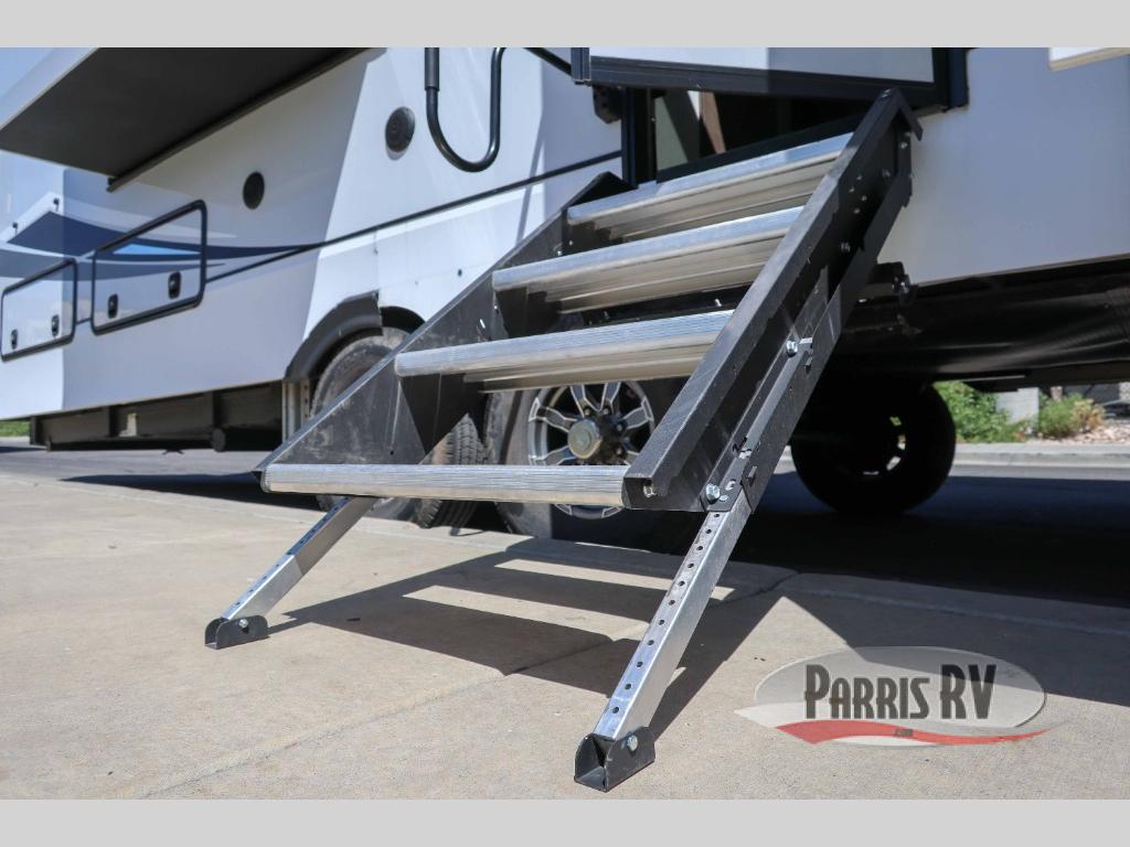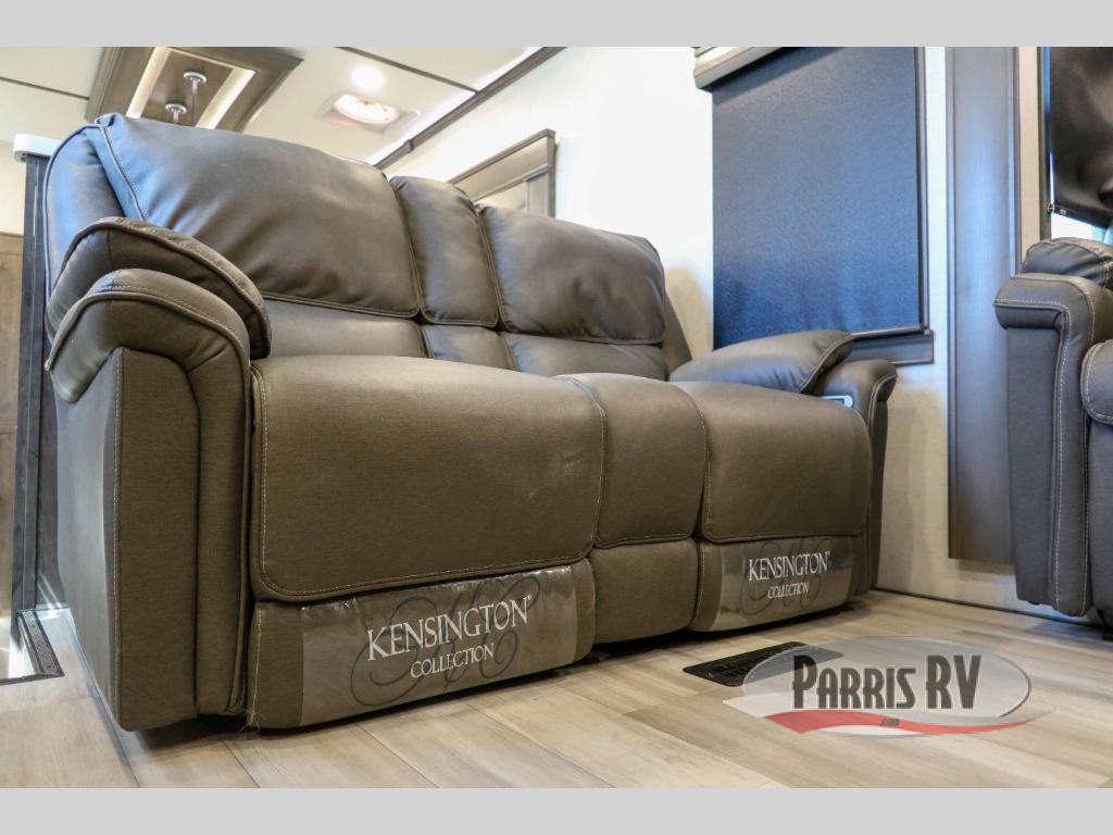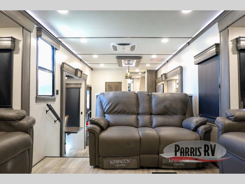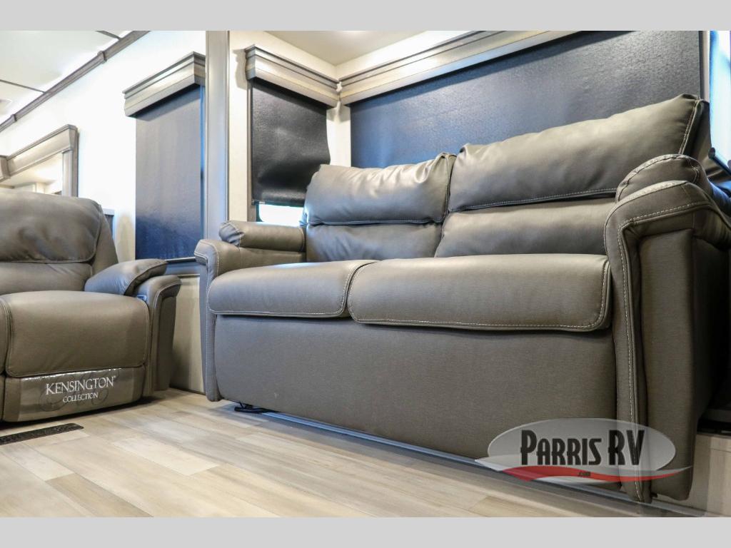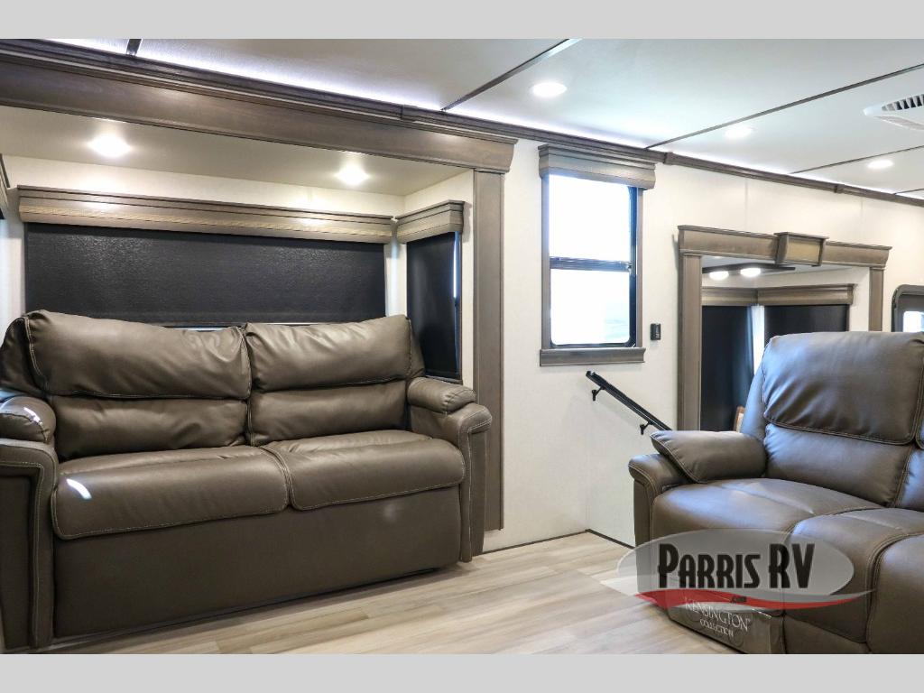 One of the most intriguing features on this Paradigm fifth wheel is the 48" x 115" basement pull-out tray because it can easily transport two kayaks! This unit also has some other extremely useful features scattered all throughout, like the preparations for a dishwasher in the kitchen, the under-step shoe storage, the dual recliner love seat in the front living room, and the pull-out fireplace at the front entertainment center. There are two Smart HDTVs in this unit so that you can enjoy a movie at the end of a long day, and the king-size bed is going to be ultra relaxing.