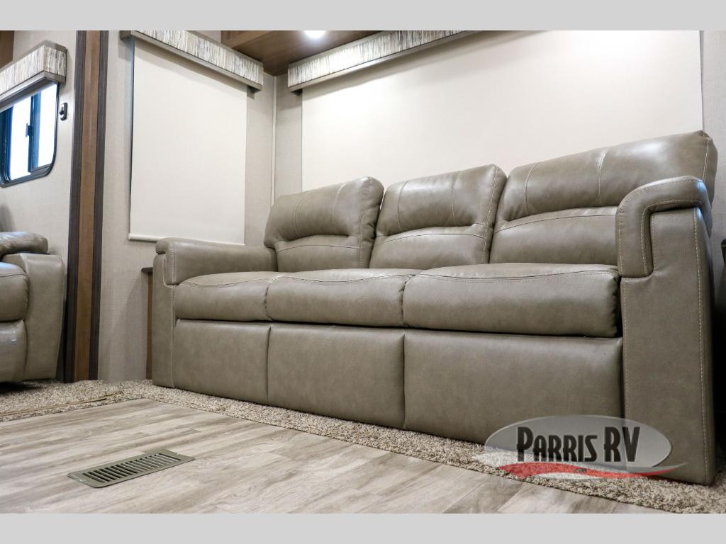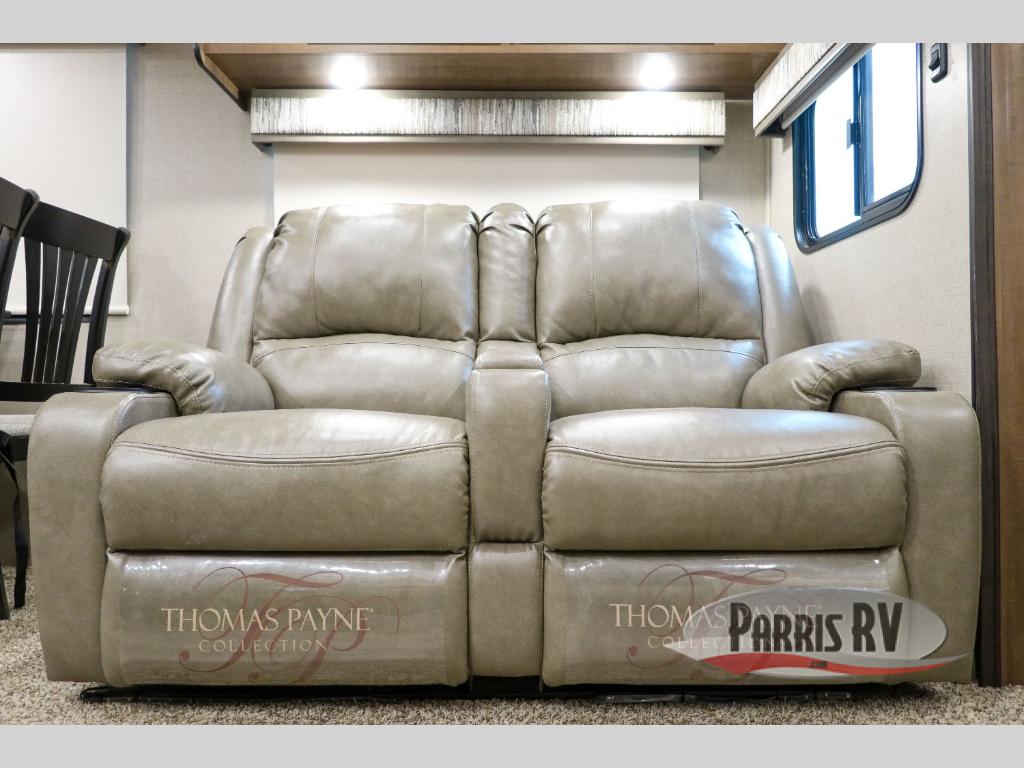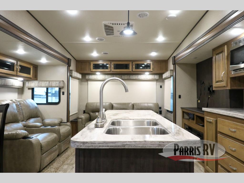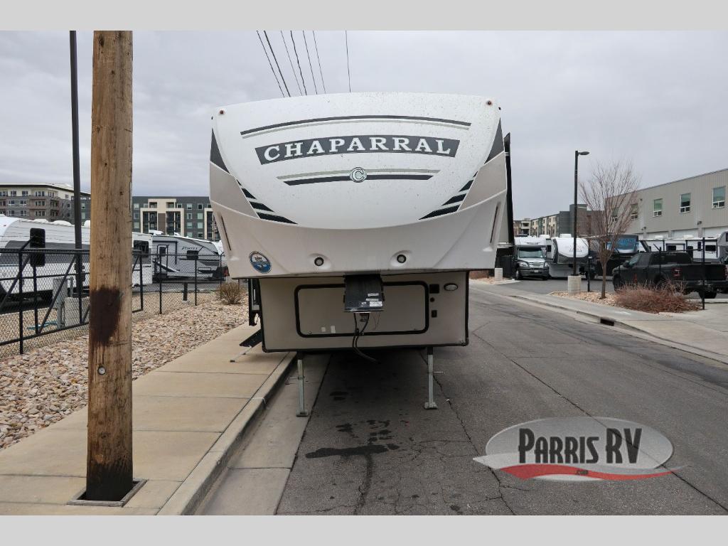 This Chaparral Lite fifth wheel features triple slides and a rear living layout where you can easily entertain a guest or two. Relax on the theater seats while watching a movie at the entertainment center or take a rest on the tri-fold hide-a-bed sofa. The island with barstools will provide more counter space when prepping dinner, and the kids can take a seat as they help. Along the interior wall in the kitchen you will find a residential pantry where you can stock up on your dry/canned goods. The bathroom has two entry doors, one from the hallway and one from the private master suite. For a truly enjoyable and relaxing camping trip, you will want this model!