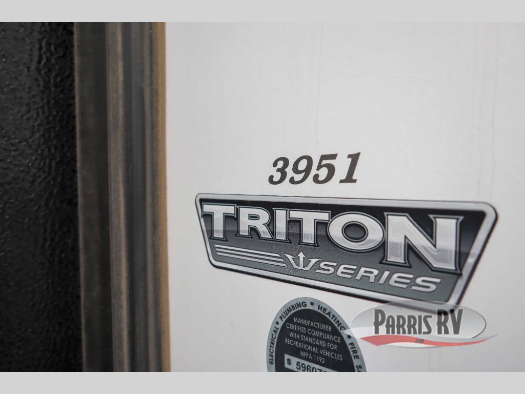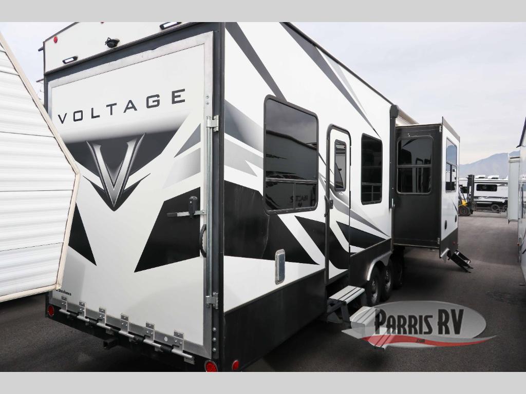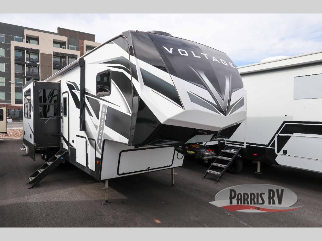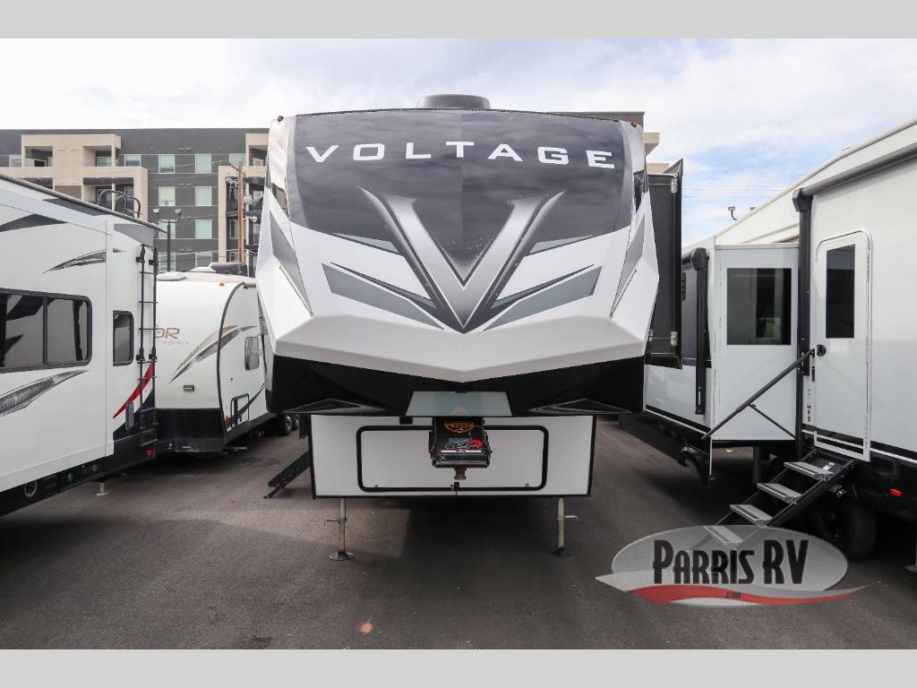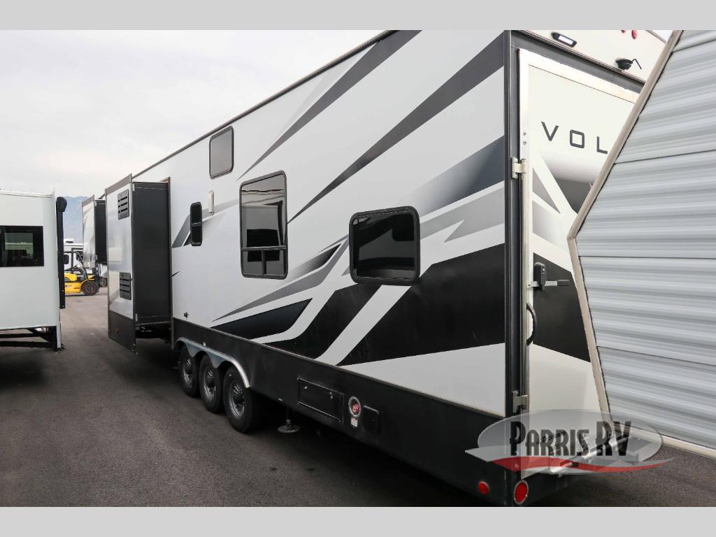 The Dutchmen Voltage Triton toy hauler finally proves that you can have luxury and value together! The six-point auto leveling system and Onan 5.5kW gas generator are a great start, and the top-notch features continue on into the garage with the indoor/outdoor speakers, pull-down screen, Tuff Ply flooring, and 2,500-LB tie downs. All throughout the interior, you will constantly find features that will enhance your camping experience, like the 7' slide boxes that provide more head space and the oversized windows that allow you to catch glimpses of your surroundings while you walk about the interior. The pleated night shades, residential duvet covers, and residential furniture give the Triton a home-like atmosphere, and the Triton has also been prepped for cable/satellite at your convenience.