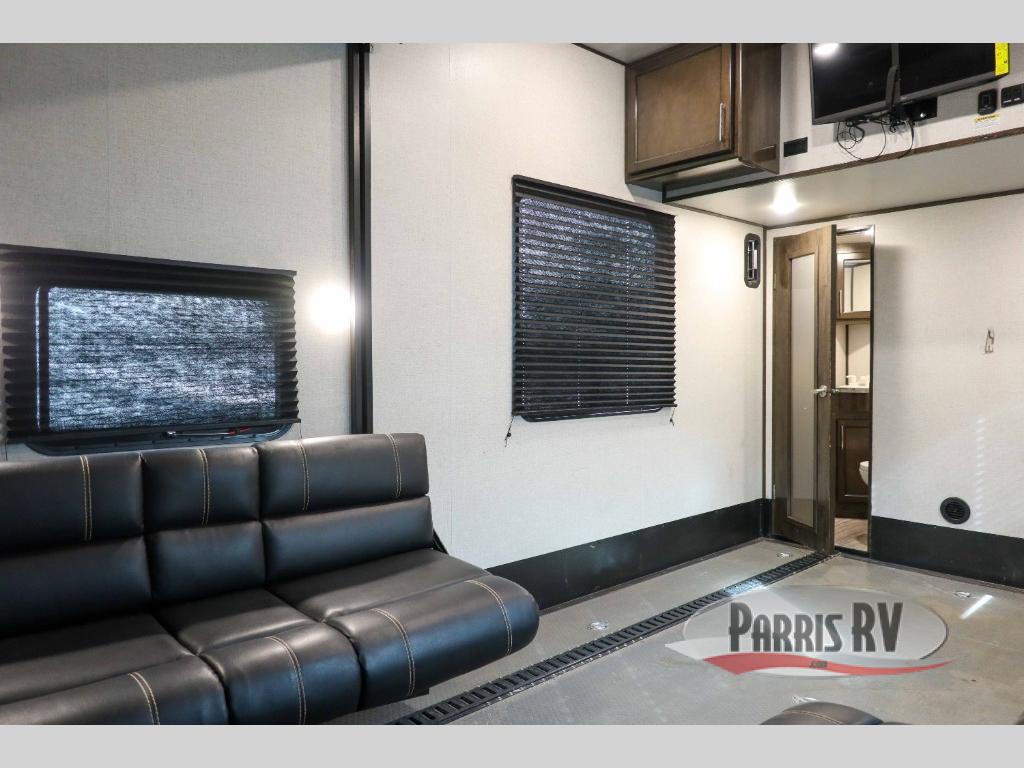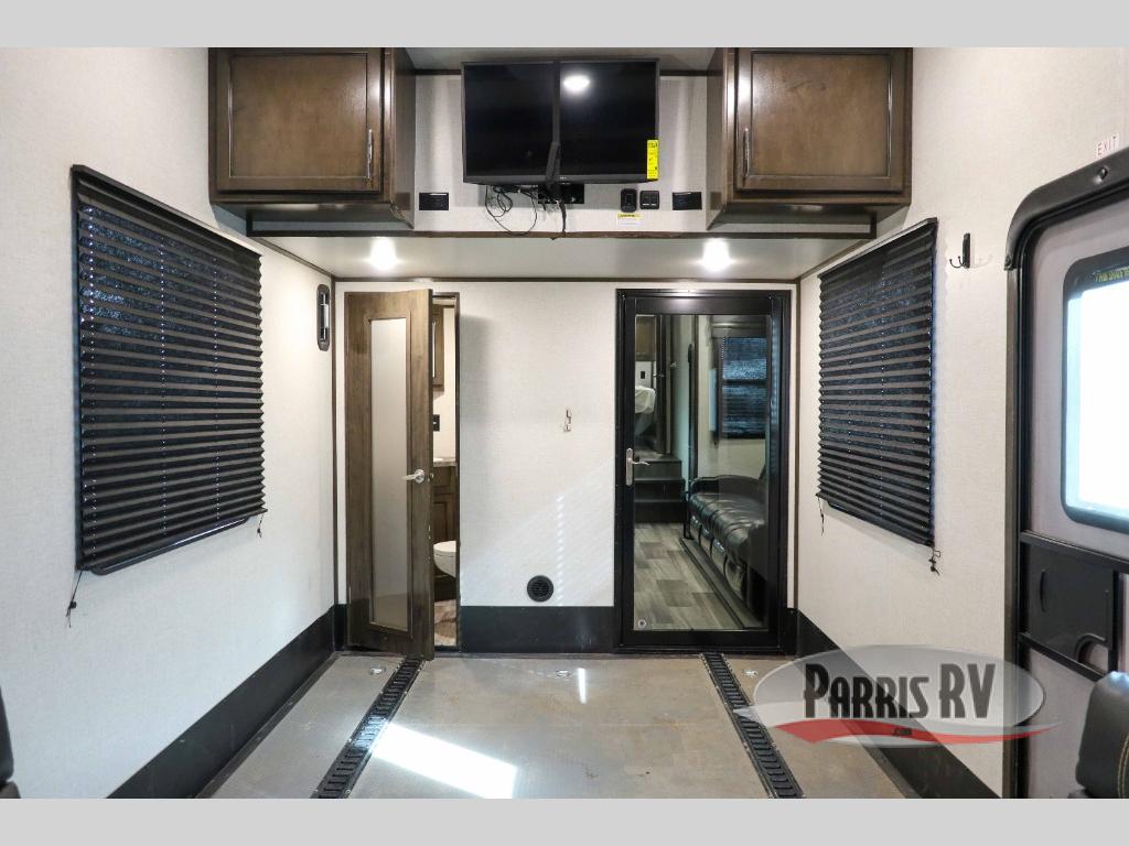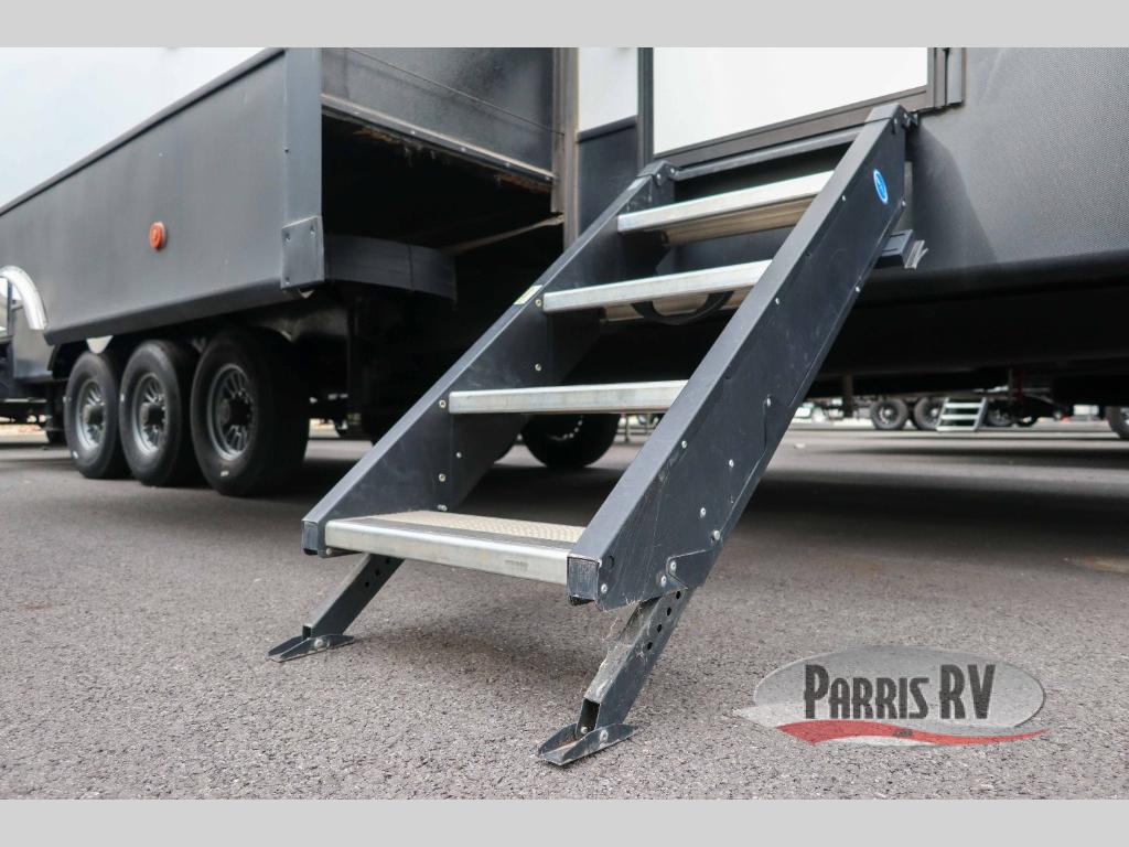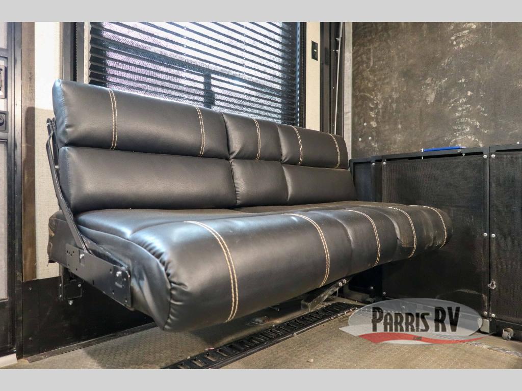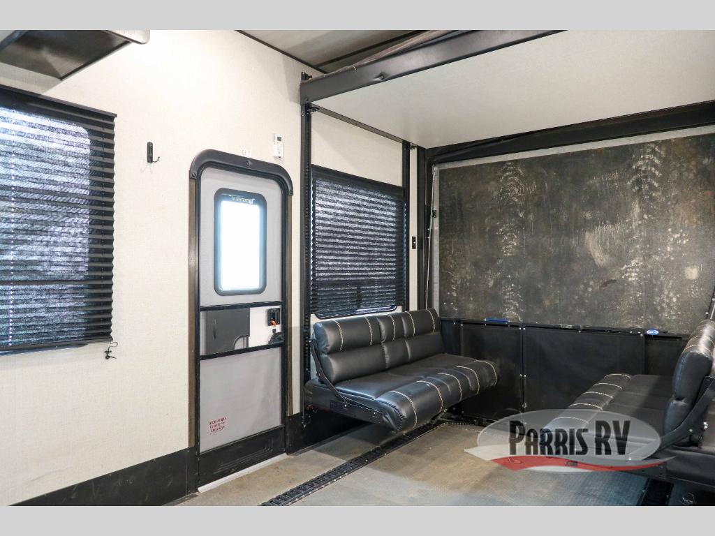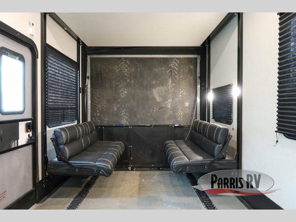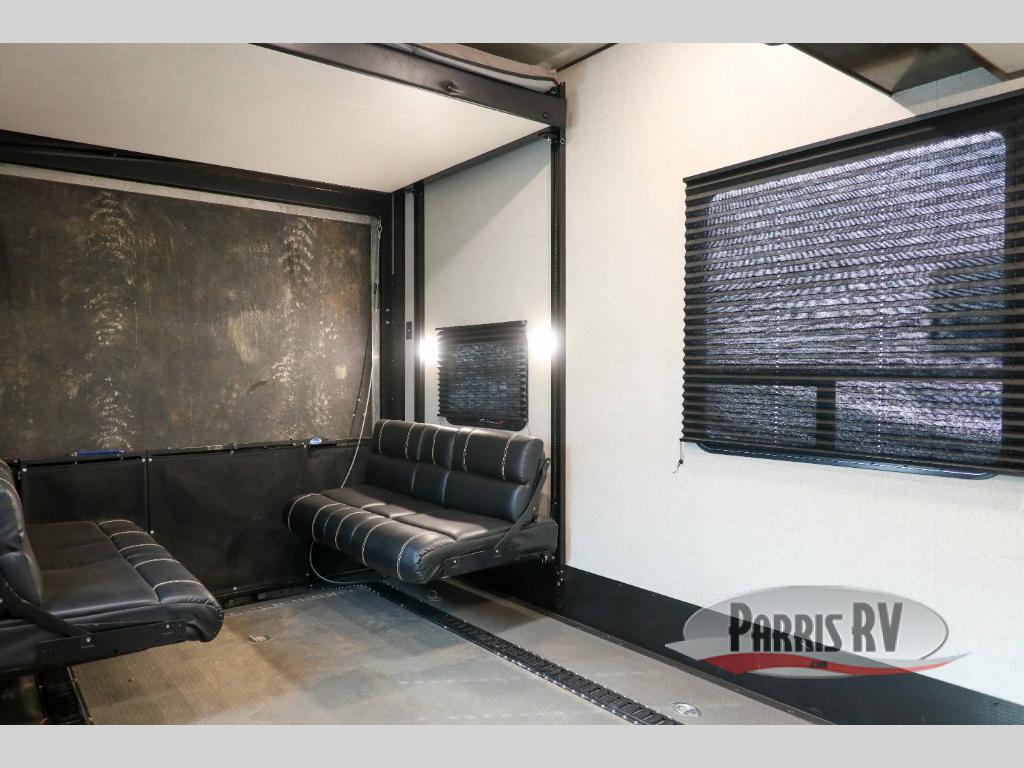 When you need to get away and take the toys out for a weekend of fun, take this Voltage Triton toy hauler with you! You will be so grateful to find a pass-through storage on top of the 15' separate garage so that you can bring even more gear. The garage has a half bathroom, the second exterior entry door, a power bunk, a twin-size loft, and a set of opposing sofas with table that will double as private bedroom for your guests or kids. There is also an excellent sleeping space for you up front with the master suite, and the opposing slides in the main living area are what will provide you with a comfortable environment to relax or cook a meal.