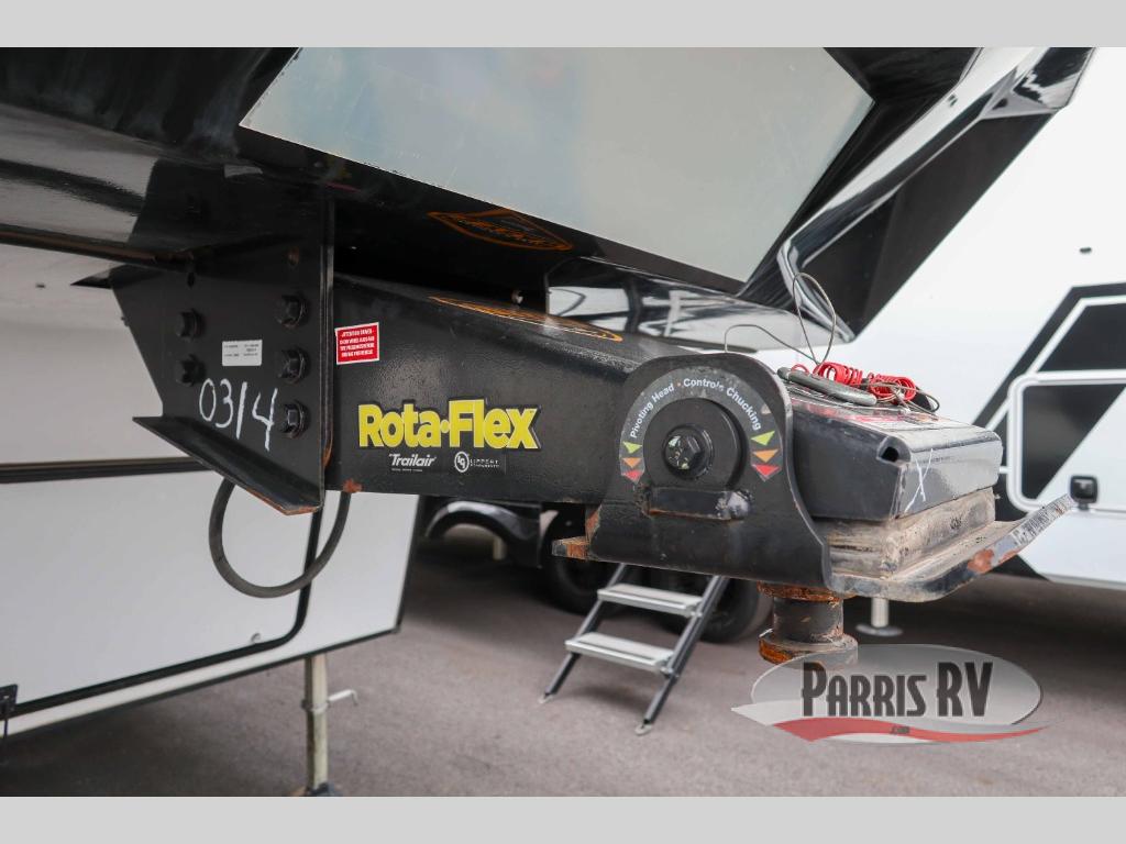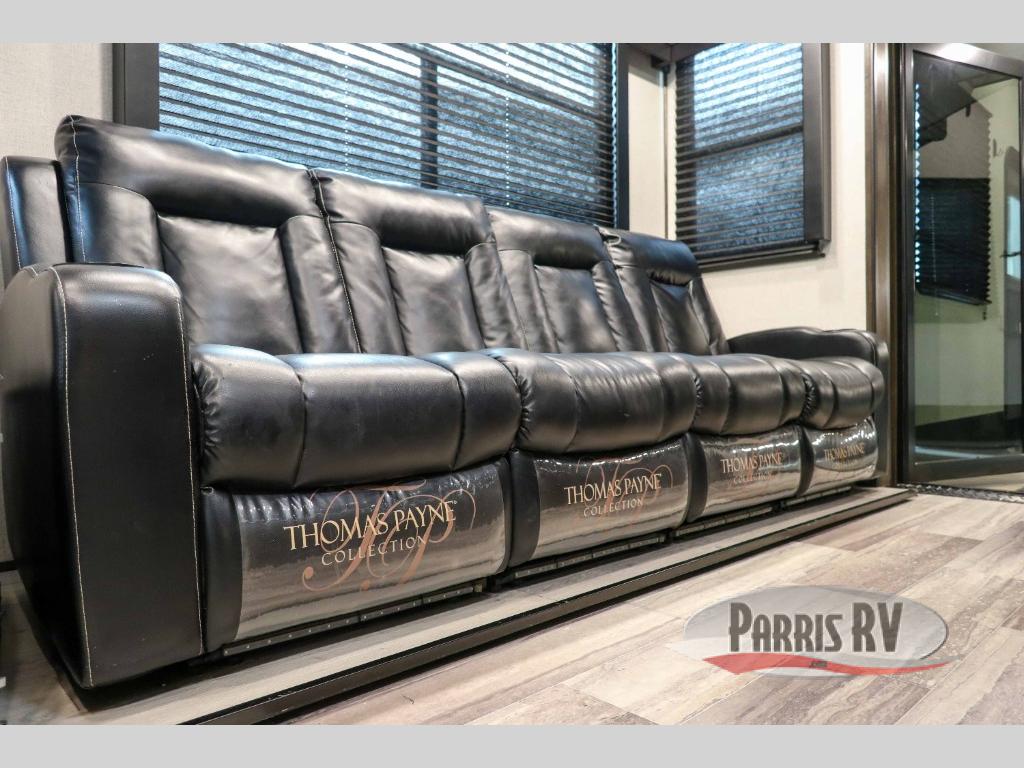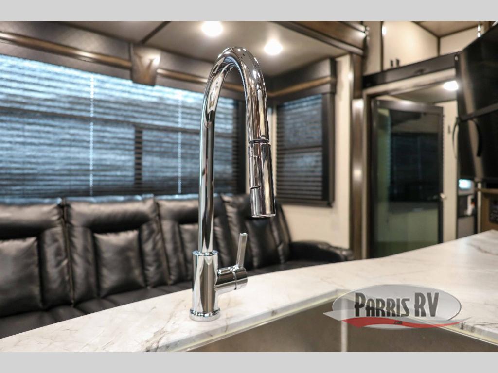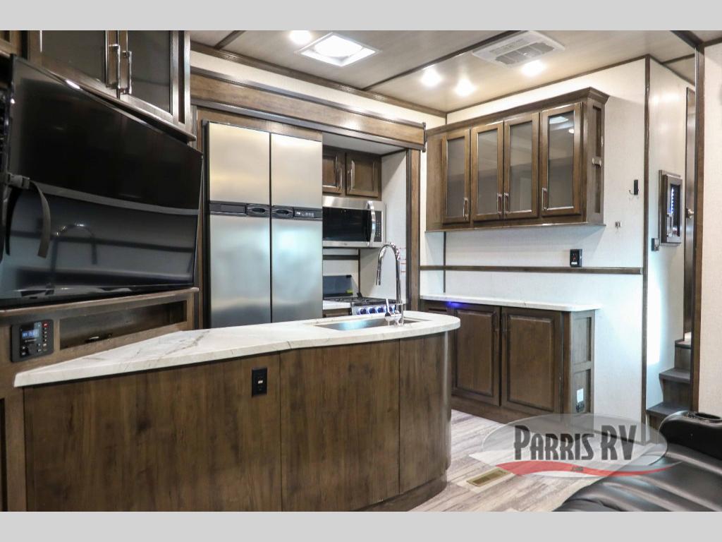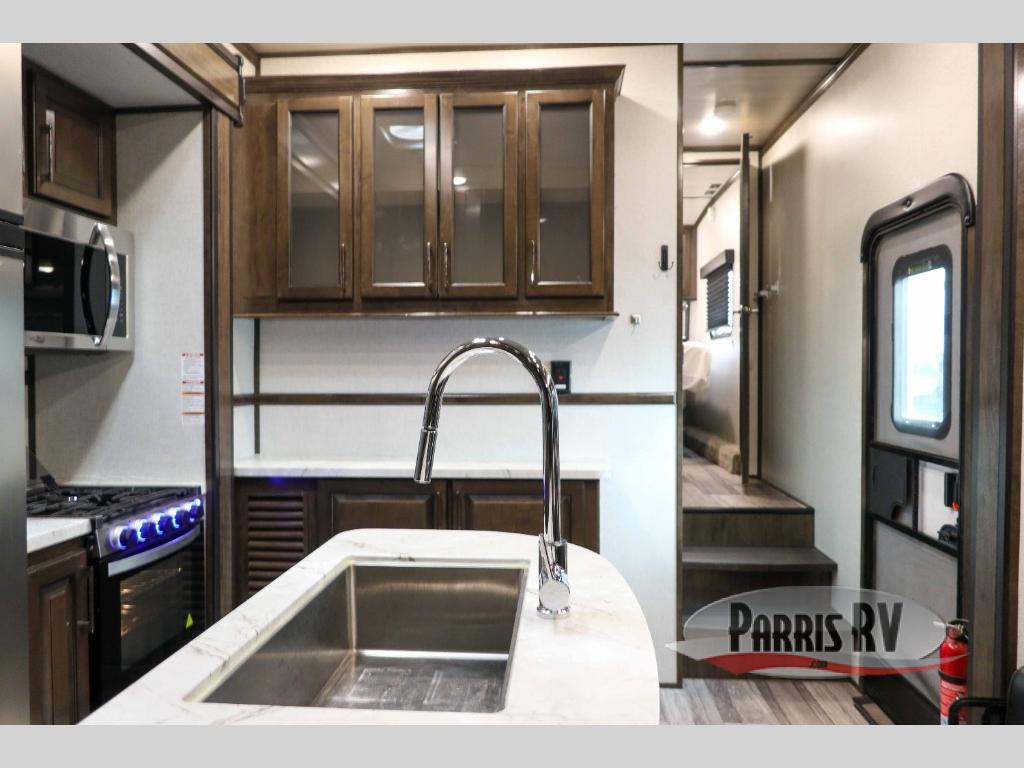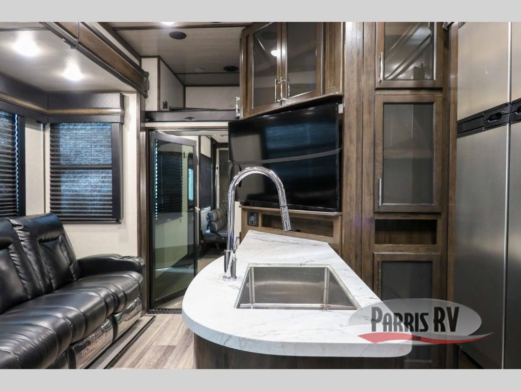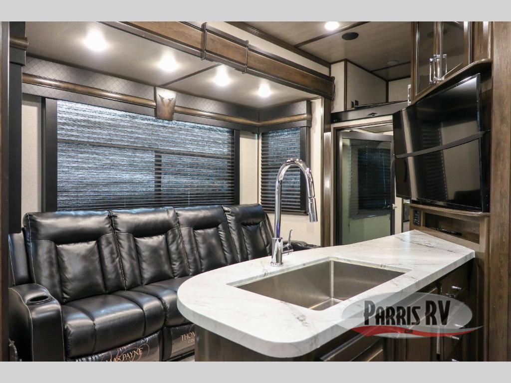 When you need to get away and take the toys out for a weekend of fun, take this Voltage Triton toy hauler with you! You will be so grateful to find a pass-through storage on top of the 15' separate garage so that you can bring even more gear. The garage has a half bathroom, the second exterior entry door, a power bunk, a twin-size loft, and a set of opposing sofas with table that will double as private bedroom for your guests or kids. There is also an excellent sleeping space for you up front with the master suite, and the opposing slides in the main living area are what will provide you with a comfortable environment to relax or cook a meal.