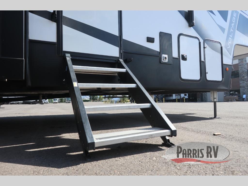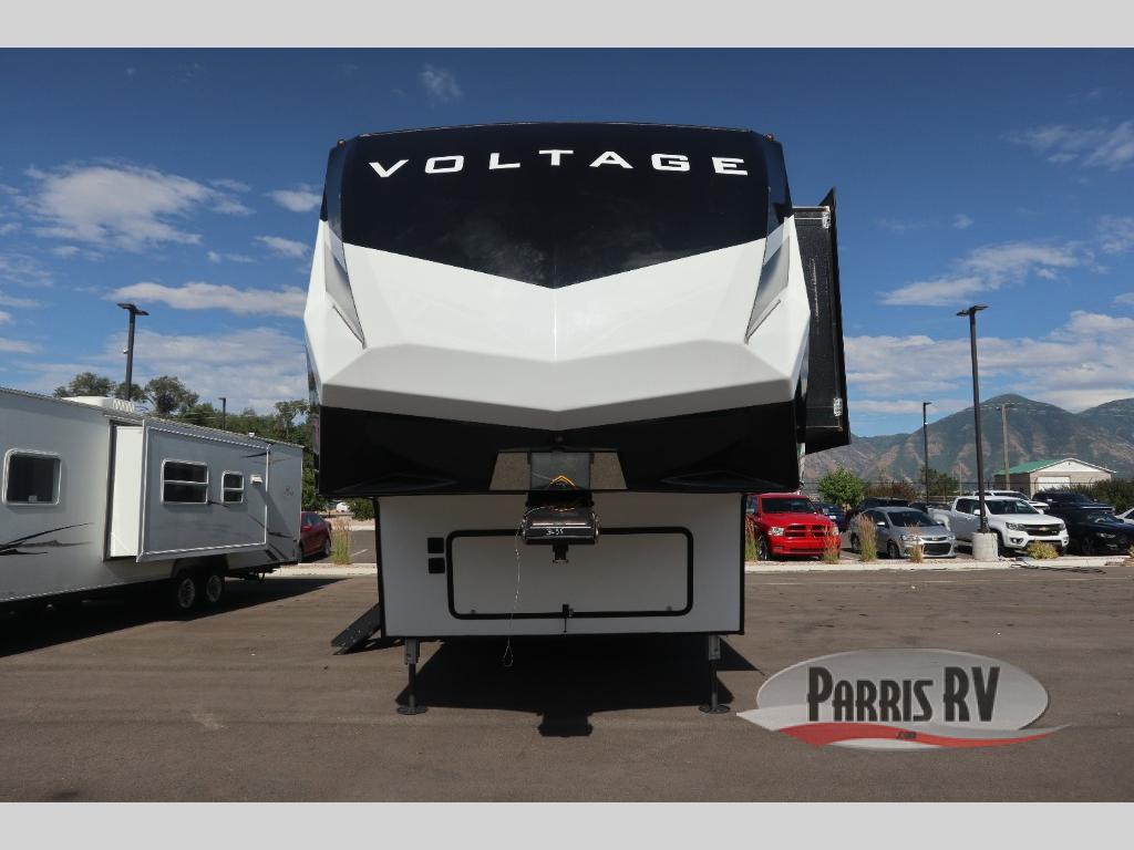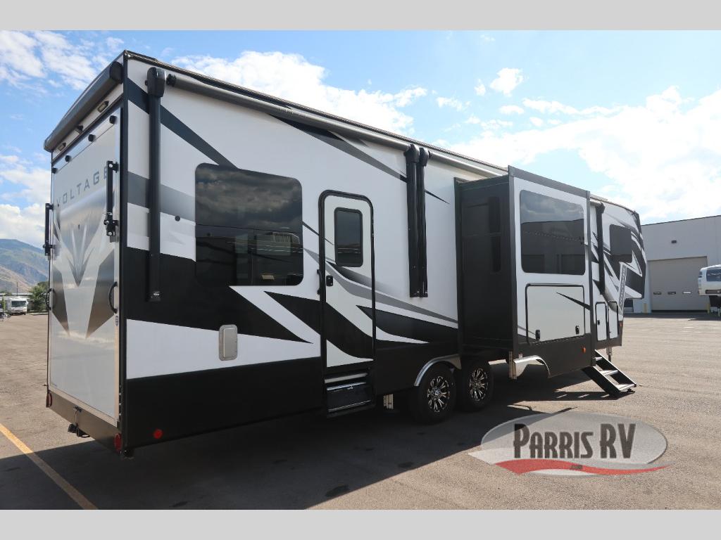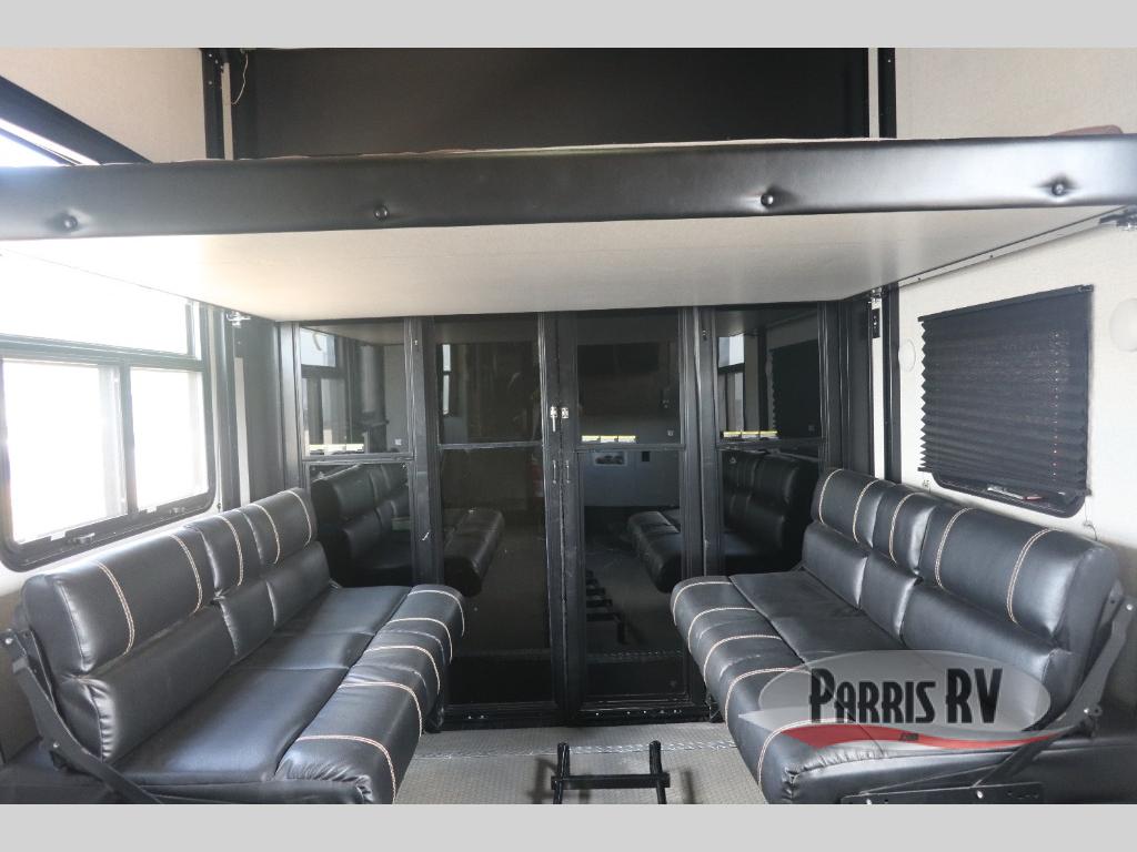 This Voltage toy hauler is going to change the way you look at camping! First of all, there is a master suite with a king-size bed up at the front, and there is even more sleeping space back in the garage with the twin-size loft, Happi-Jack power bunk, and opposing sofas. Not only is there plenty of sleeping space, but there is also plenty of entertainment with the garage TV, the 50" LCD HDTV in the living area, and the exterior entertainment center. Because of the two entry doors, you can quickly and easily access either the garage or the main living area, and you can also have a great time while you are outside because the two electric awnings with LED lights will keep the rain drops off of your head.
