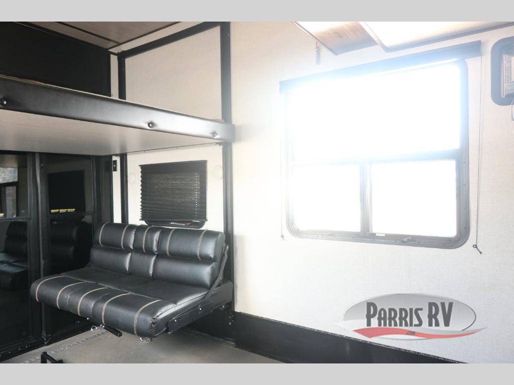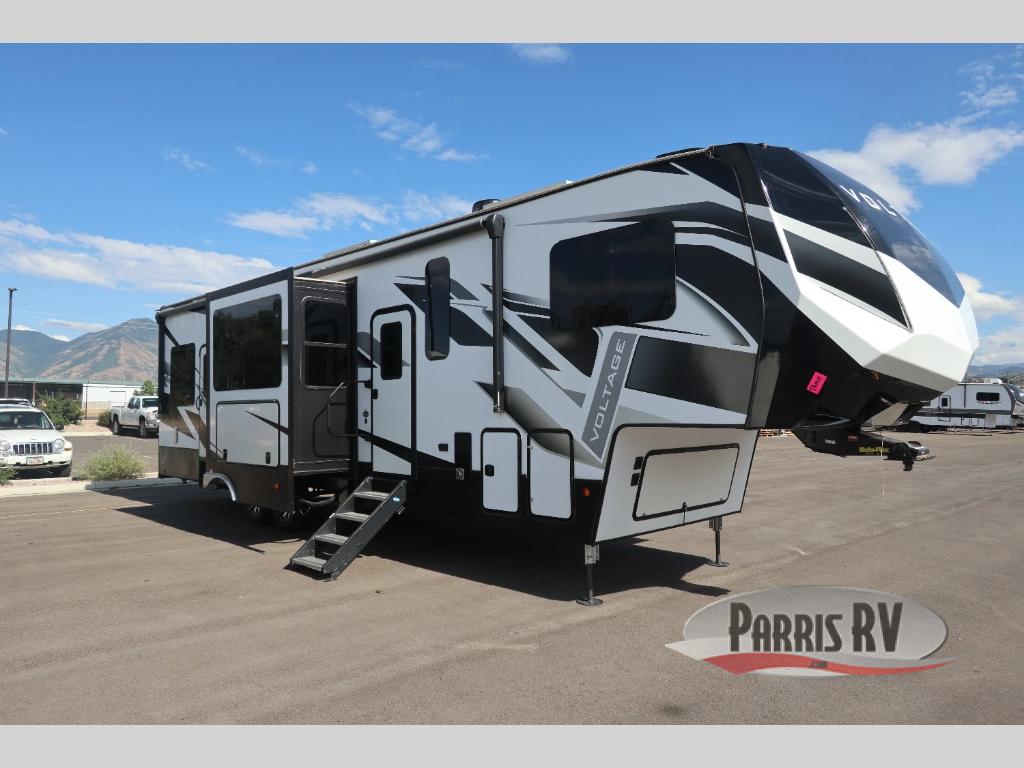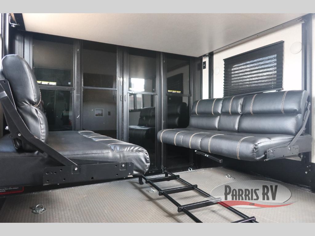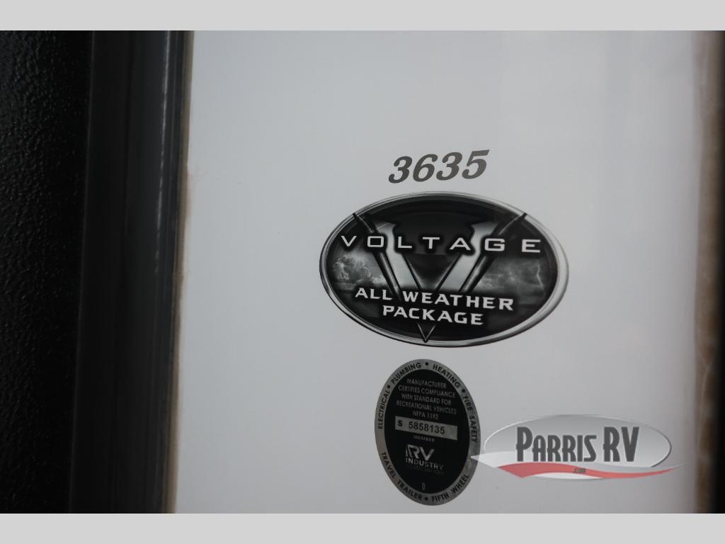 This Voltage toy hauler is going to change the way you look at camping! First of all, there is a master suite with a king-size bed up at the front, and there is even more sleeping space back in the garage with the twin-size loft, Happi-Jack power bunk, and opposing sofas. Not only is there plenty of sleeping space, but there is also plenty of entertainment with the garage TV, the 50" LCD HDTV in the living area, and the exterior entertainment center. Because of the two entry doors, you can quickly and easily access either the garage or the main living area, and you can also have a great time while you are outside because the two electric awnings with LED lights will keep the rain drops off of your head.