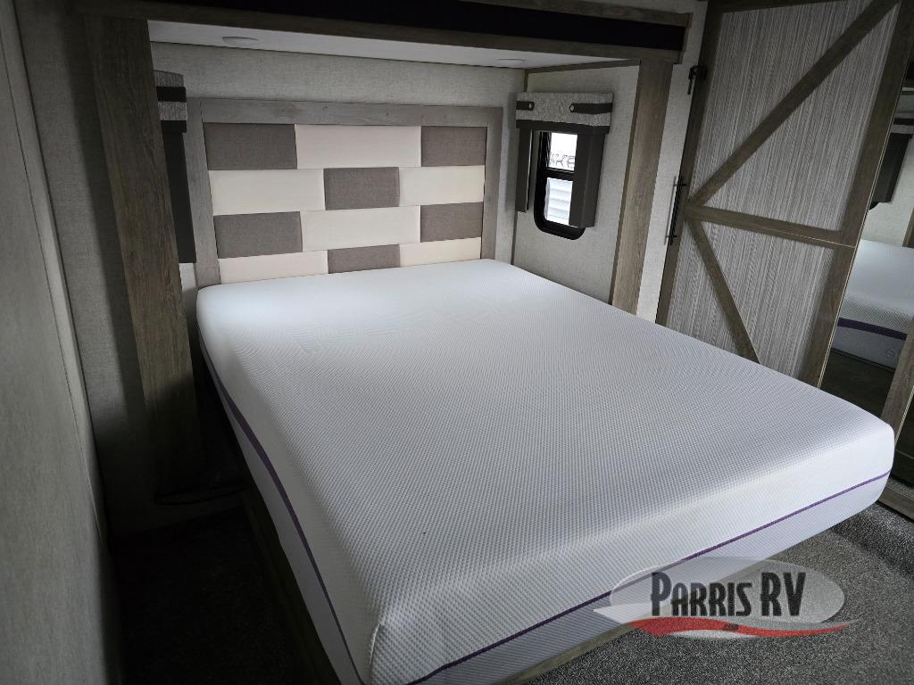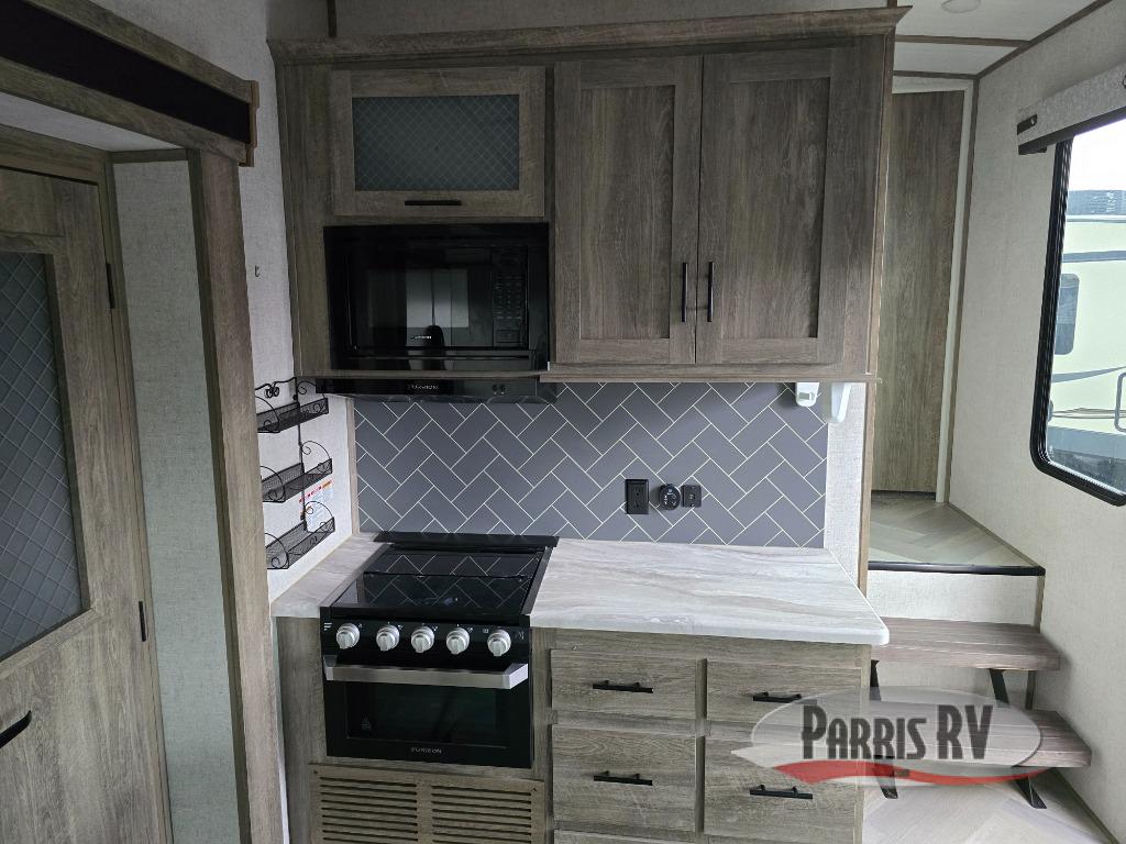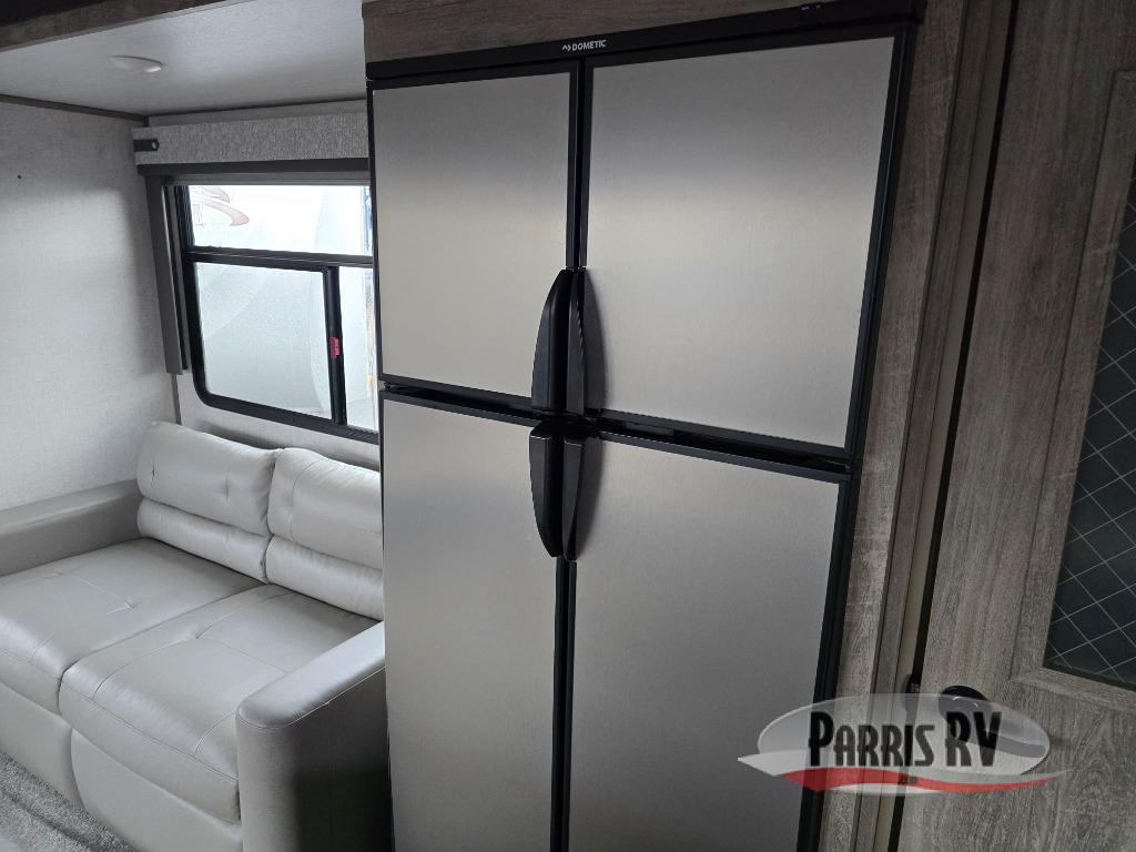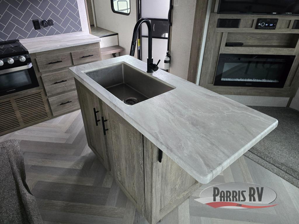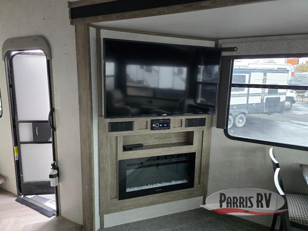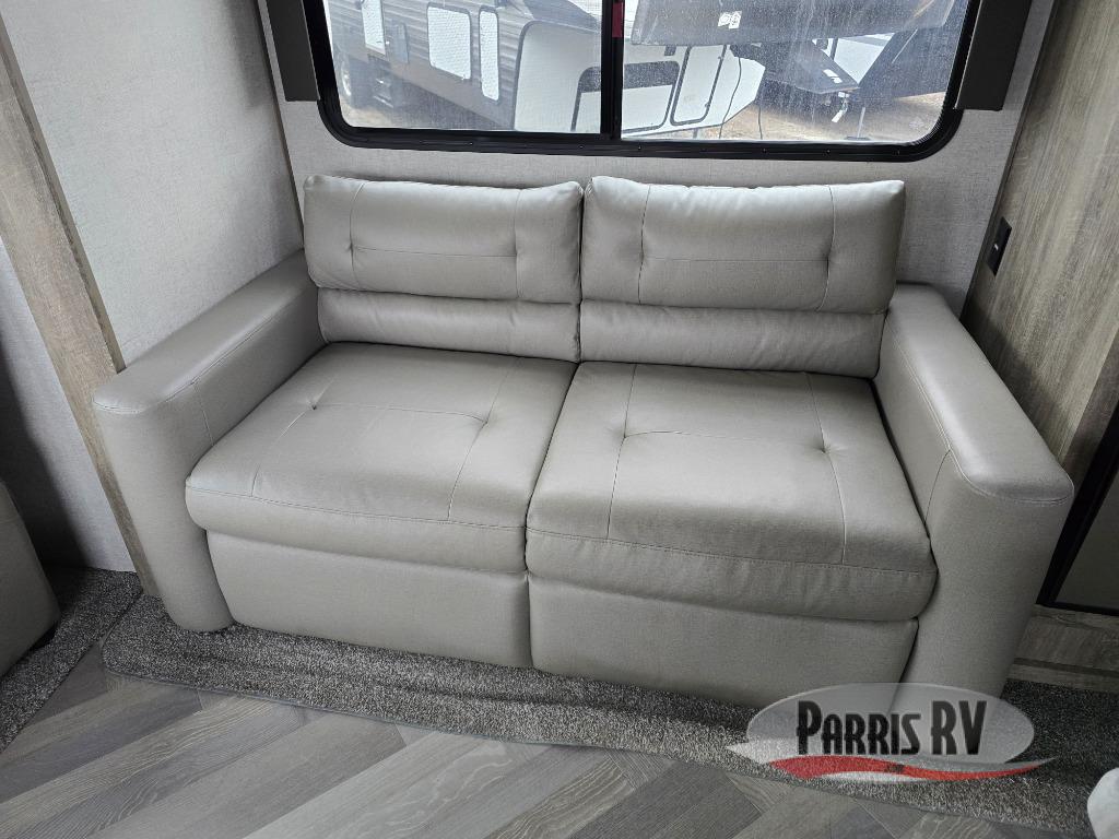 Enjoy the sunshine with panoramic windows throughout this fifth wheel! The rear living area is perfect for relaxing in at night on one of the two chairs or the tri-fold sofa, and maybe you decide to play some games at the free standing dinette while watching the 50" LED TV and enjoying a warm fire from the 32" glass front electric fireplace. The kitchen has an island with a large sink to make clean up easier and a pantry big enough to store everyone's favorite snacks. The full bathroom has a residential walk-in shower with a seat and a skylight above for natural lighting as you get ready. When you're ready to hit the sack, head to the front private bedroom and enjoy a good night's rest on the custom king bed!