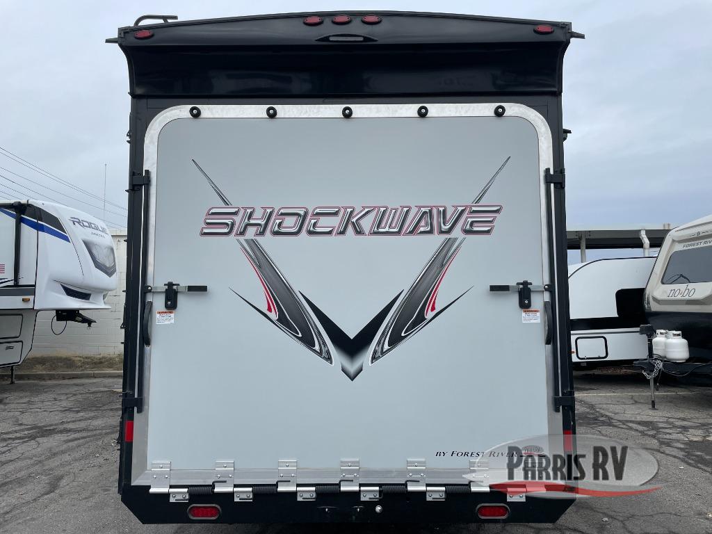 Each Forest River Shockwave DX Series and MX Series travel trailer toy hauler includes a wide body construction, super lube axles, plus an outside shower so you can wash off your riding boots. Inside, you'll enjoy the black chef's high-rise spring faucet make clean-up a breeze, and the 13,500 BTU A/C will keep you cool on those hot summer months. Each model also includes a drive on wheel well on the doorside, a 35 gallon fuel station, plus LED marker and clearance lights to make parking your trailer easier than ever.