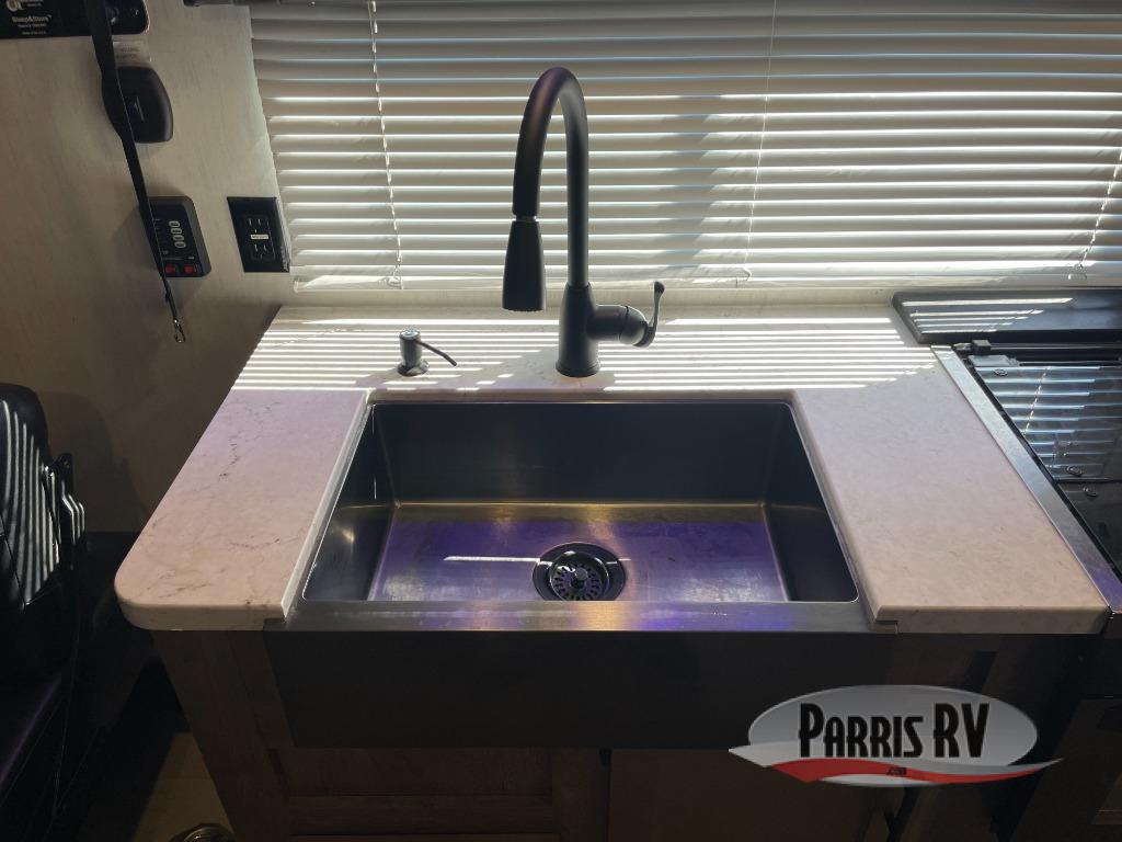 The Vengeance Rogue by Forest River is a budget-friendly toy hauler that you can really get on board with! Some of the features within the Rogue Platinum Package are the zebra shades that will keep light out, a glass shower enclosure, ultracold heated holding tank pads, and much more. There is an outside shower with hot and cold water so you can fill the dogs water bowl or wash the mud from your riding gear, and the enclosed underbelly will allow you to extend your camping season. You will love the look of the residential black stainless steel farm sink, along with the seamless countertops and LED interior lighting with accents.