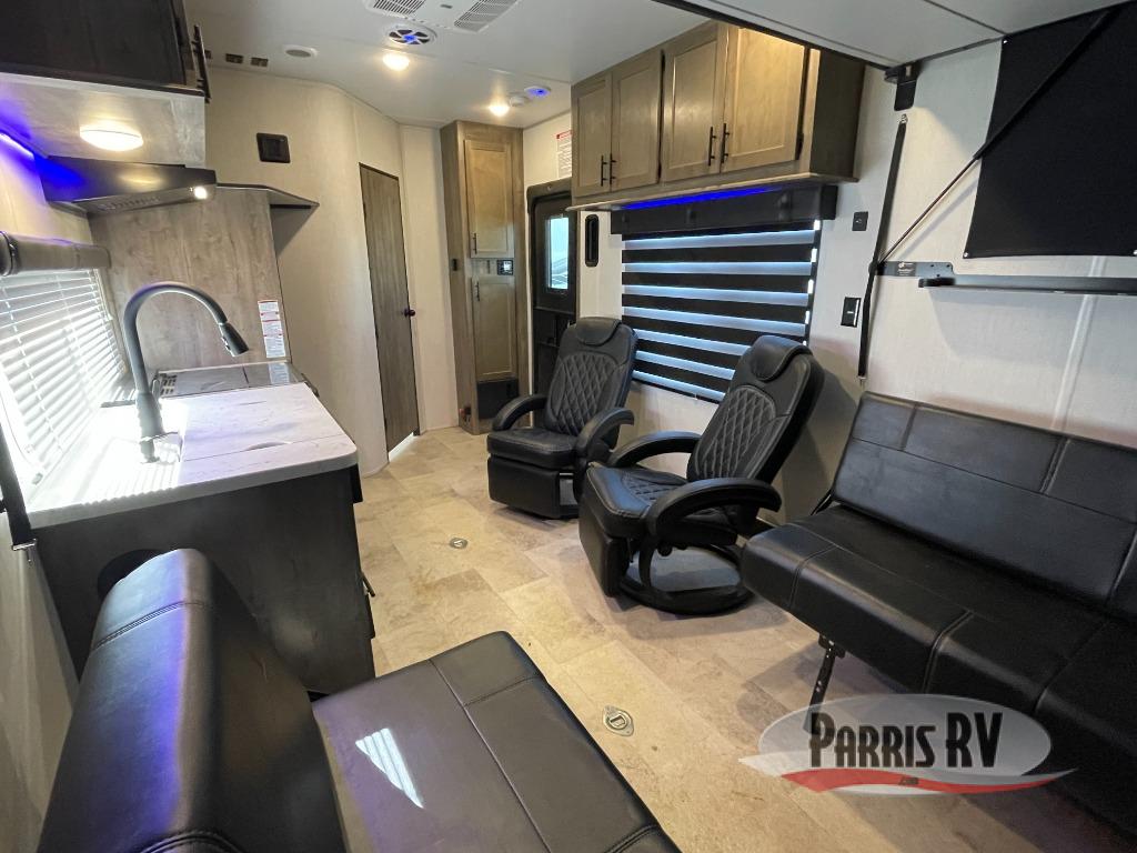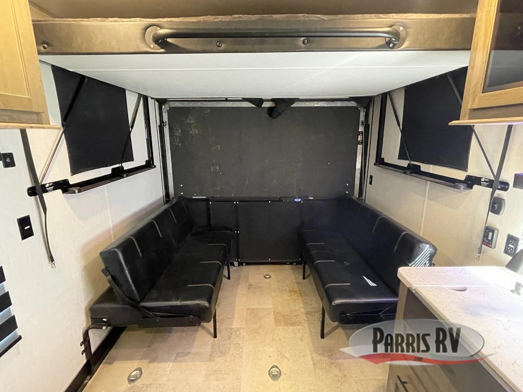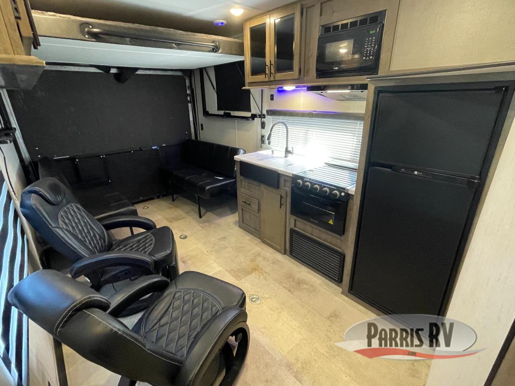 This dual entry toy hauler will keep you happy on every outdoor adventure. Once your dirt bikes are unloaded, relax on the two roll-overs sofas and enjoy lunch before heading out for the day. You can also choose to add two optional lounge chairs for more seating space if needed. The walk-through bath includes a medicine cabinet for your necessities and a linen closet for clean towels, and the front master bedroom includes a Rogue king bed for your comfort.