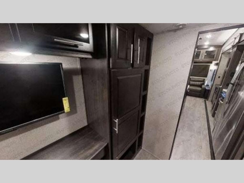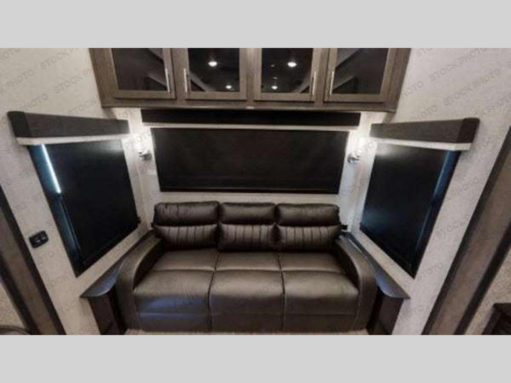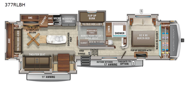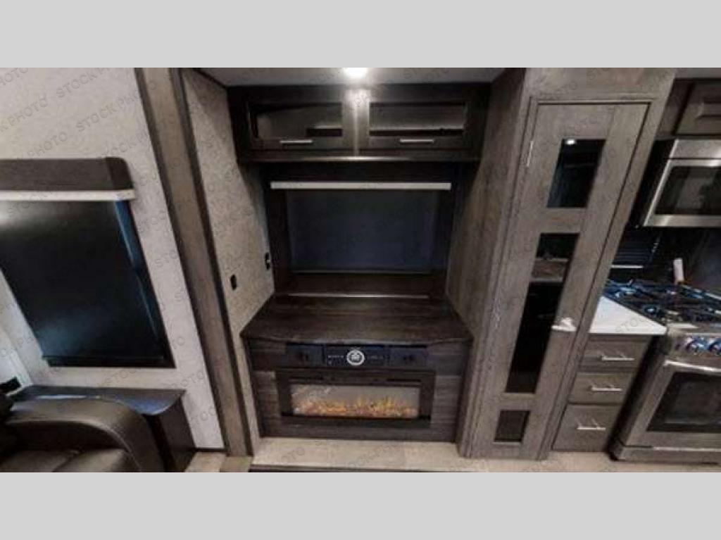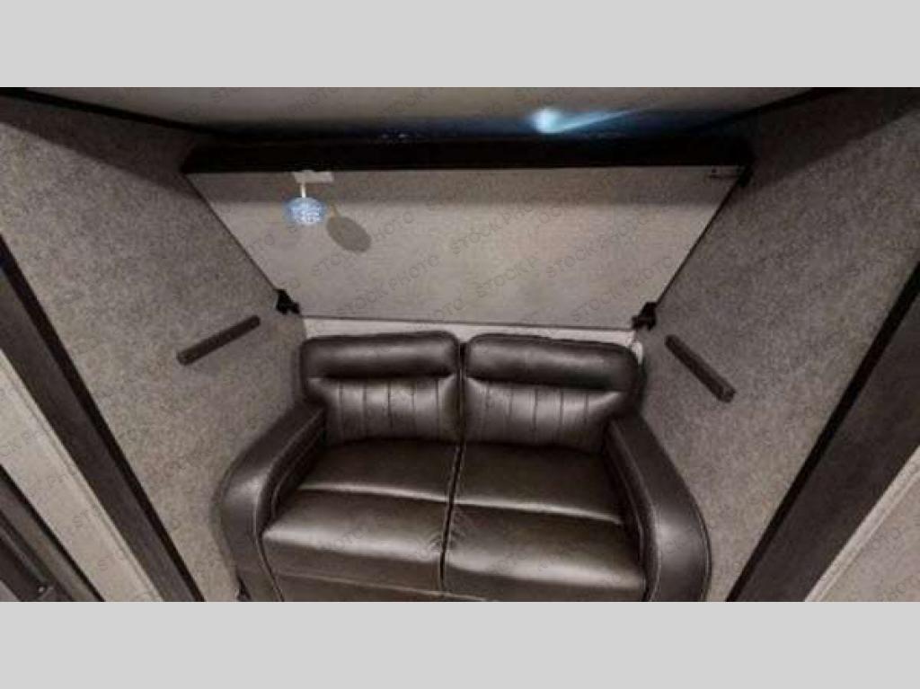 You can bring the whole family with two bedrooms in this fifth wheel! The front private bedroom features a queen bed, a front wall walk-in closet with a hamper and a space prepped to add the optional washer and dryer, and a flip-up dresser with a 32" TV. The second room can be used as a den, an office or a guest room with an overhead loft above a flip-up bunk that has a tri-fold sofa below it, and a desk with a TV. The kitchen is decked out in at-home features like the kitchen island with a double sink and prepped for the optional dishwasher, the large pantry, and a 21 cu. ft. refrigerator to keep your perishables fresh. You can wind down each night by relaxing in the rear living area on either the tri-fold hide-a-bed sofa with flip top side tables to set your drink on or the theater seat which are directly across from the fireplace with a TV on a lift. You can even choose to add the optional tailgate TV next to the outside kitchen with a 17' electric awning with LED lights to keep you protected!