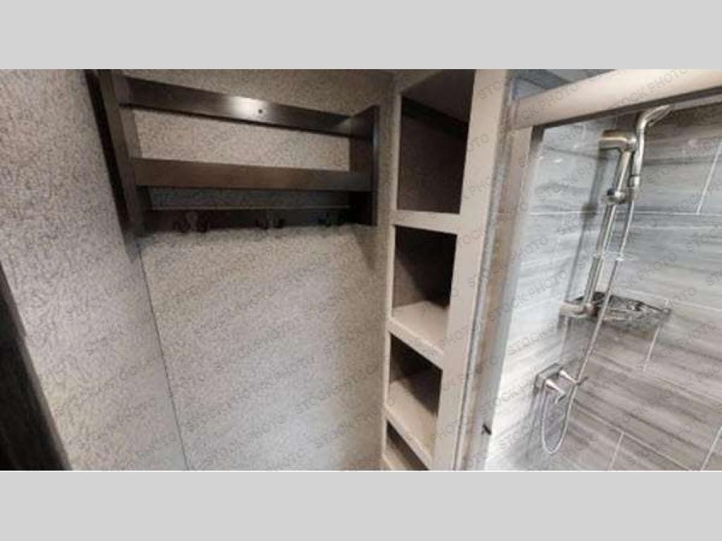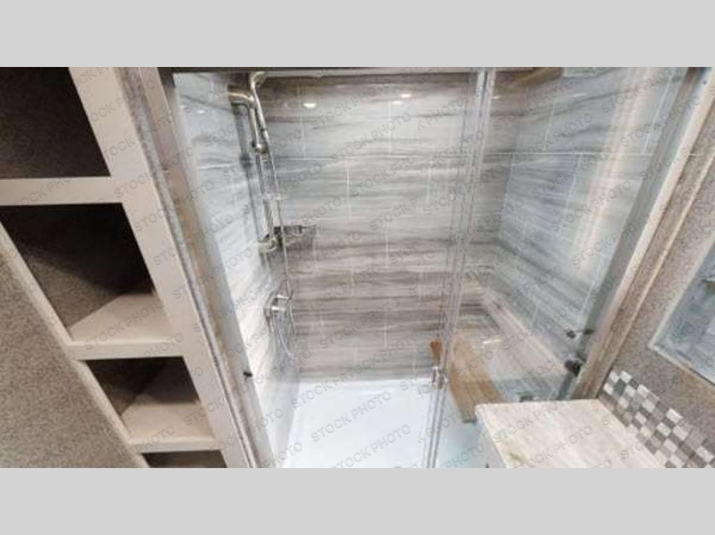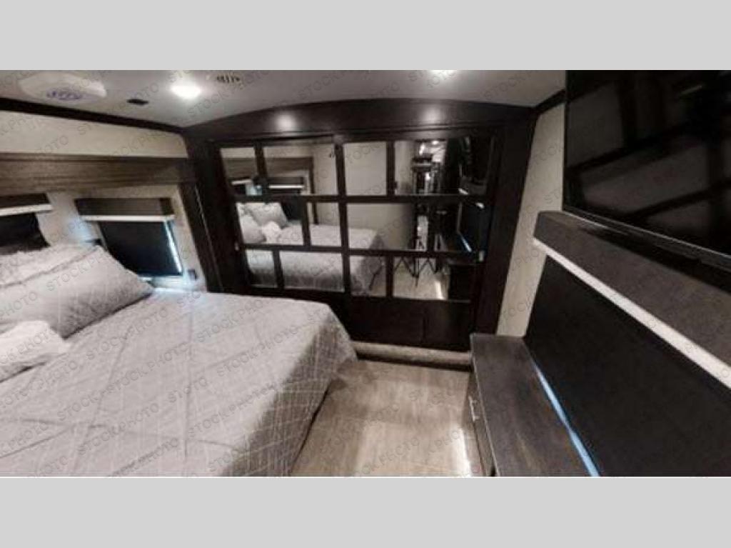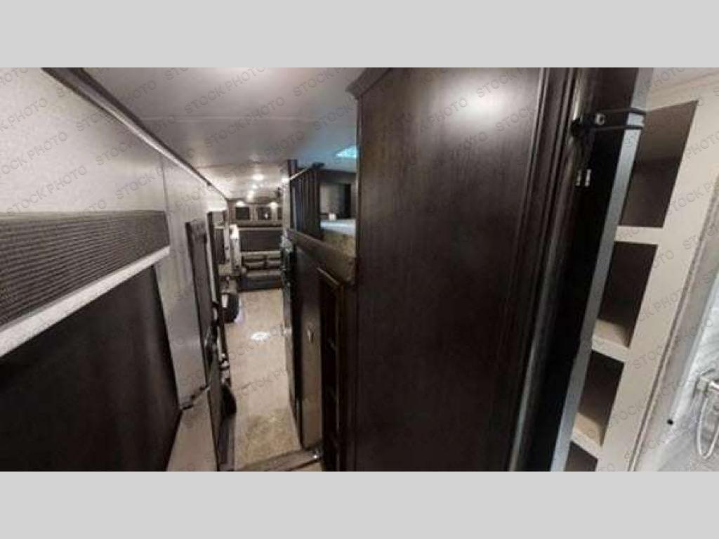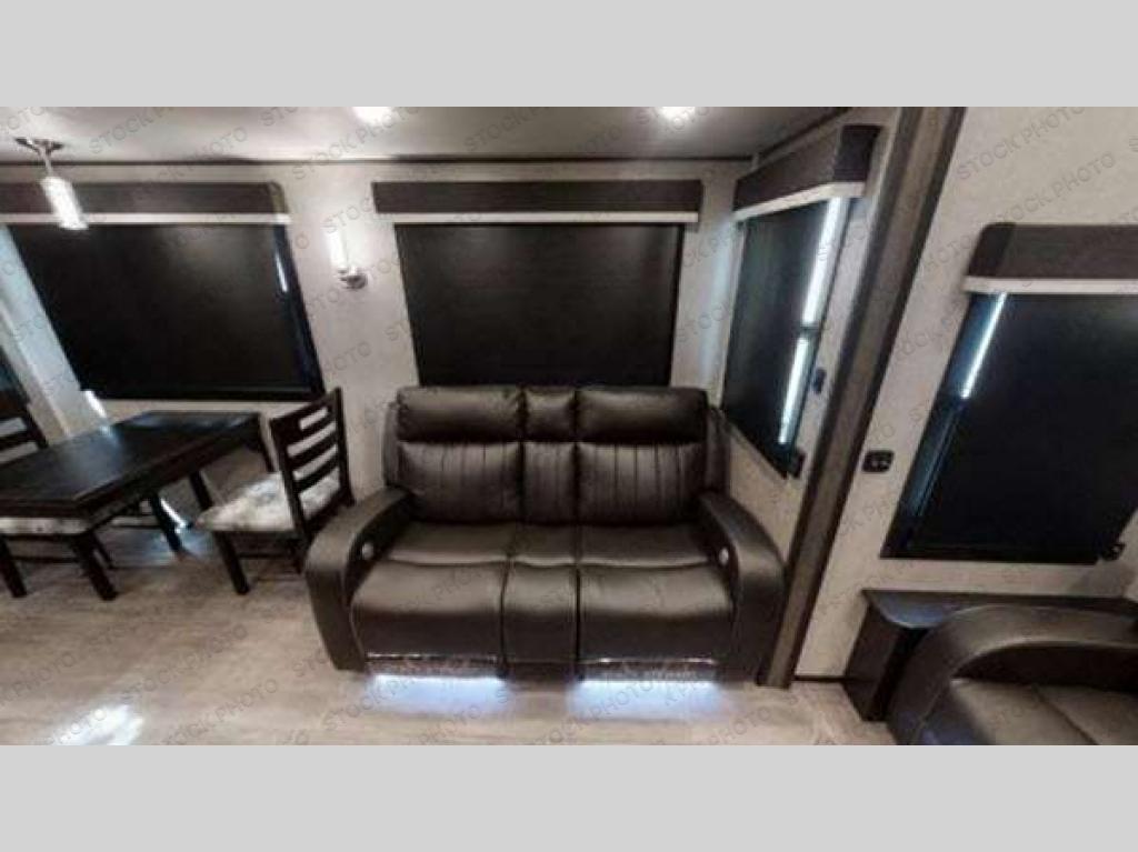 You can bring the whole family with two bedrooms in this fifth wheel! The front private bedroom features a queen bed, a front wall walk-in closet with a hamper and a space prepped to add the optional washer and dryer, and a flip-up dresser with a 32" TV. The second room can be used as a den, an office or a guest room with an overhead loft above a flip-up bunk that has a tri-fold sofa below it, and a desk with a TV. The kitchen is decked out in at-home features like the kitchen island with a double sink and prepped for the optional dishwasher, the large pantry, and a 21 cu. ft. refrigerator to keep your perishables fresh. You can wind down each night by relaxing in the rear living area on either the tri-fold hide-a-bed sofa with flip top side tables to set your drink on or the theater seat which are directly across from the fireplace with a TV on a lift. You can even choose to add the optional tailgate TV next to the outside kitchen with a 17' electric awning with LED lights to keep you protected!