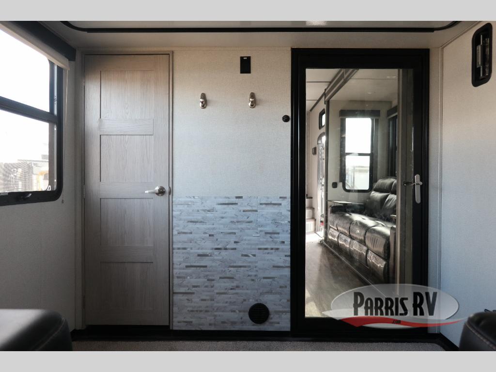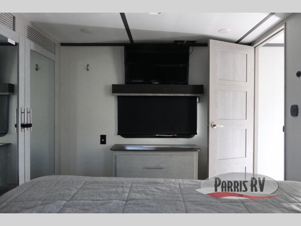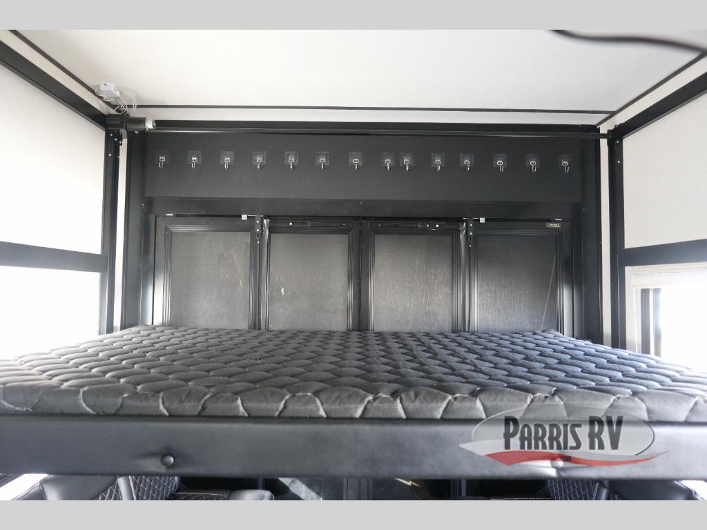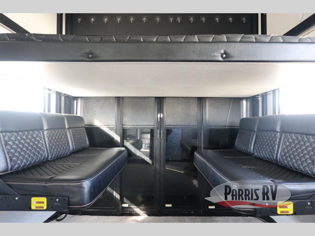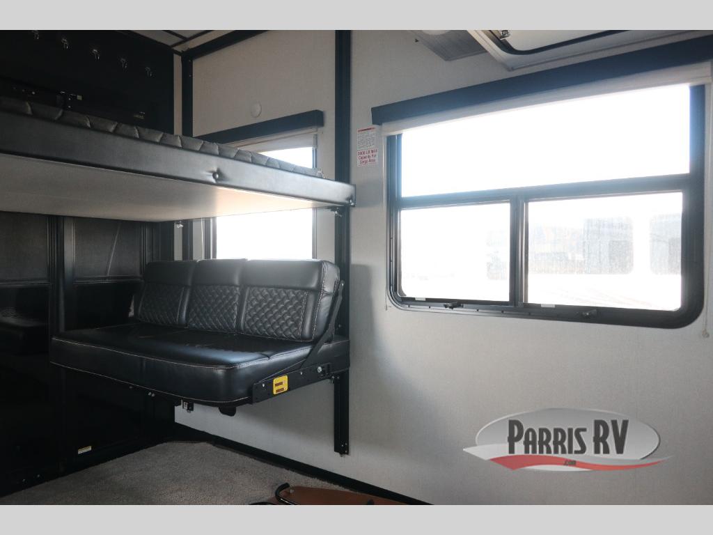 Enjoy open living spaces and convenient features in this spacious toy hauler. The 11' separate garage includes its own exterior entrance door, a loft with a bunk mat, plus a half bath for guests. You can comfortably sleep eight people with the added dual opposing sofas and a top queen bed, and you'll find three LED TV's throughout for your entertainment. The main living area includes a table with swing out stools the kids will love, and the two pantries can hold all the dry goods and snacks. The dual entry full bath will create a front master suite that will feel just like home. Here, you'll enjoy your own LED TV, a dresser and a master closet, plus a space to add an optional washer and dryer if you choose!
