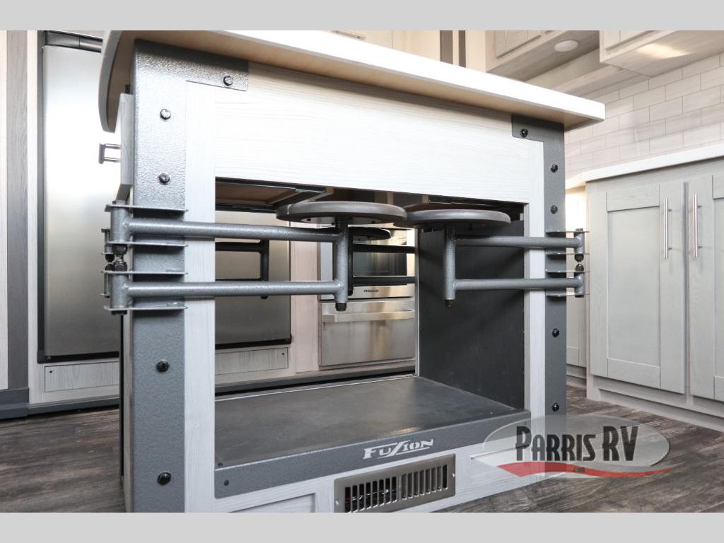 Seek new thrills and see new sights in a Fuzion toy hauler fifth wheel by Keystone. A few of the advantages you'll find with these models are Adjust-A-Track frame-welded tie-downs, Tru-fit slide construction, 12V color-coded wiring, plus much more. The Max Turn technology makes turning and parking easier than ever, and the MORryde CRE 3000 suspension will provide smooth towing to the campground. You will stay comfortable year around with the in-floor heating ducts and the Blade high performance air flow system that gives 20% more air flow. Each model includes many interior comforts, including residential-style furniture, extra tall ceilings with crown molding, and fiberglass backed linoleum floors. The garage features gas and oil resistant tuff-fly flooring, an 8' ramp door, a fuel station with dual 30 gallon tanks, and double electric beds with dual opposing sofas so you can invite more friends along!