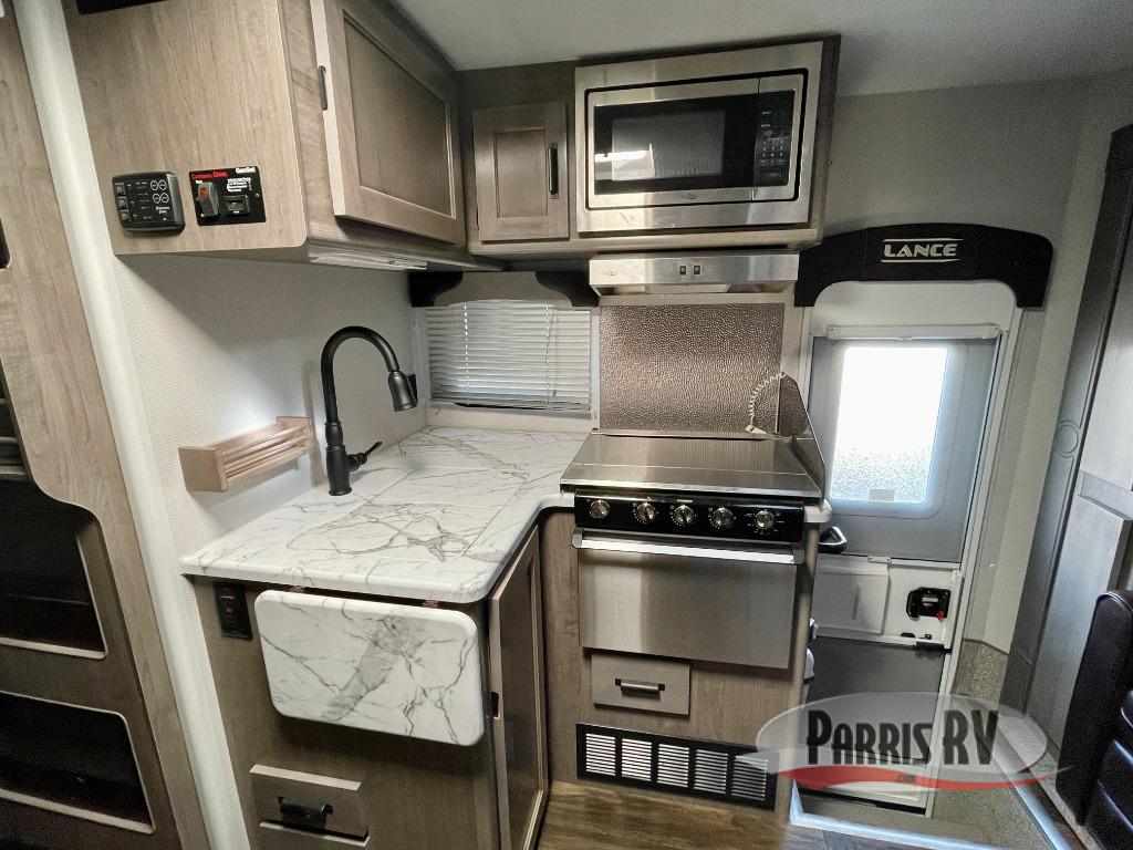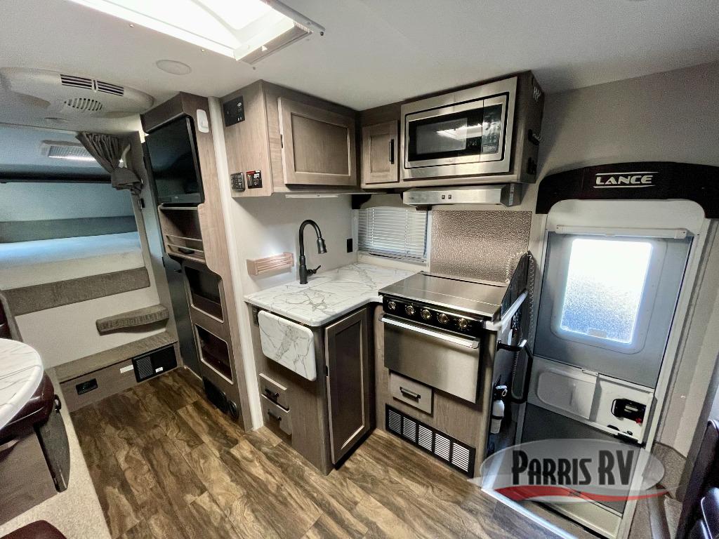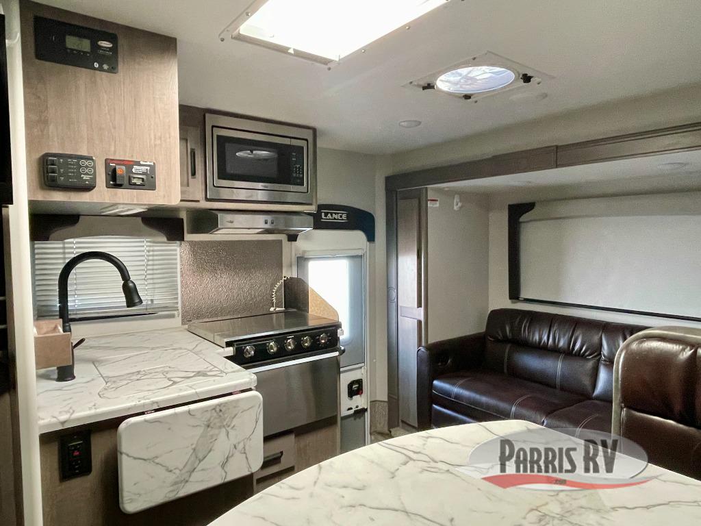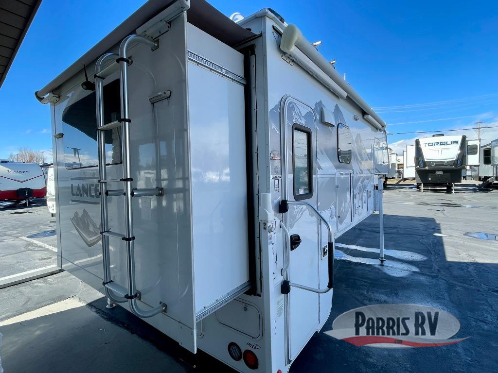 This luxurious Lance truck camper is the most spacious and amenity-packed camper that Lance designs, and it comes with enough room to sleep six people during any adventure between the sofa sleeper, the cab-over queen-size bed, and the booth dinette. You will certainly appreciate the extra space that the large slide brings to this camper, and since this unit comes with a fully equipped kitchen, you will find it easy to prepare dinner each evening while using the stainless steel three-burner range top. Not only does this model come with a beautiful dry bath, but it also contains a skylight in the bathroom which allows the rays of sunlight to stream through each morning.