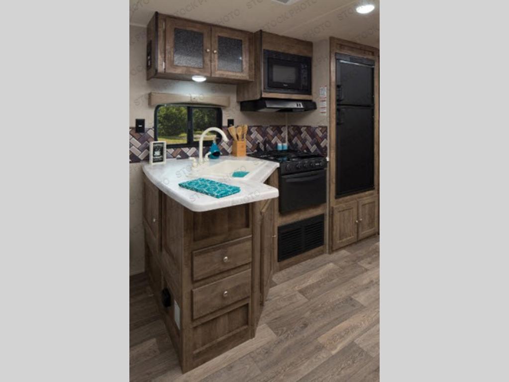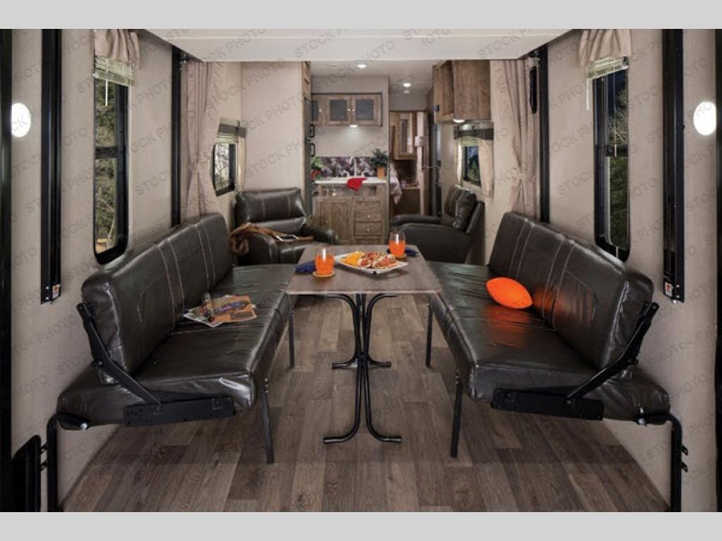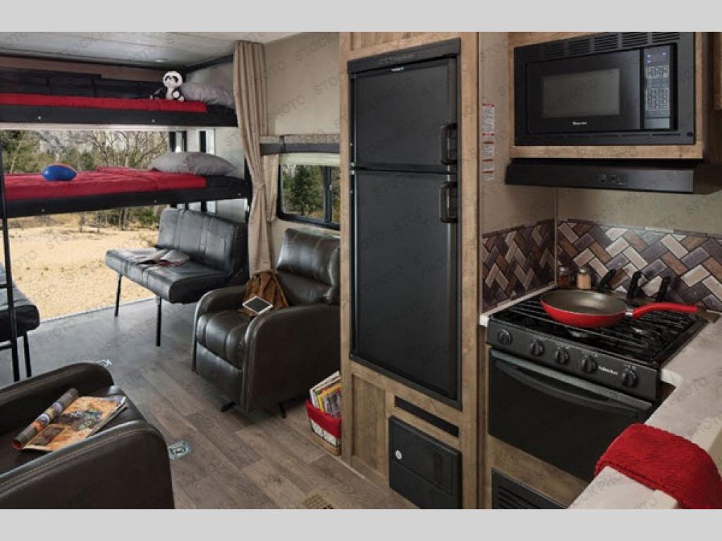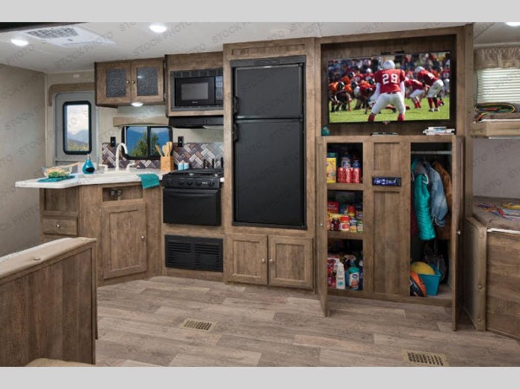 Get ready for your next adventure in this toy hauler. You can easily bring along dirt bikes, a four wheeler, or your kayaks for a fun weekend with friends and family. The pass-through storage allows you to bring along your riding gear plus extra lawn chairs and fishing poles. Once your toys are unloaded from the 15' 10" garage, you can relax on the two roll-over sleeper sofas with a dinette table, or enjoy a cup of coffee on the two swivel chairs. Cook up your best meals on the three burner cooktop, or use the stainless steel microwave. There is plenty of overhead cabinets for your necessities and a residential refrigerator for your perishables. You will appreciate your own space away in the front private bedroom that includes a queen bed and dual shirt closets! You might even like to add the optional electric lift queen bed so this trailer can sleep six instead of four!