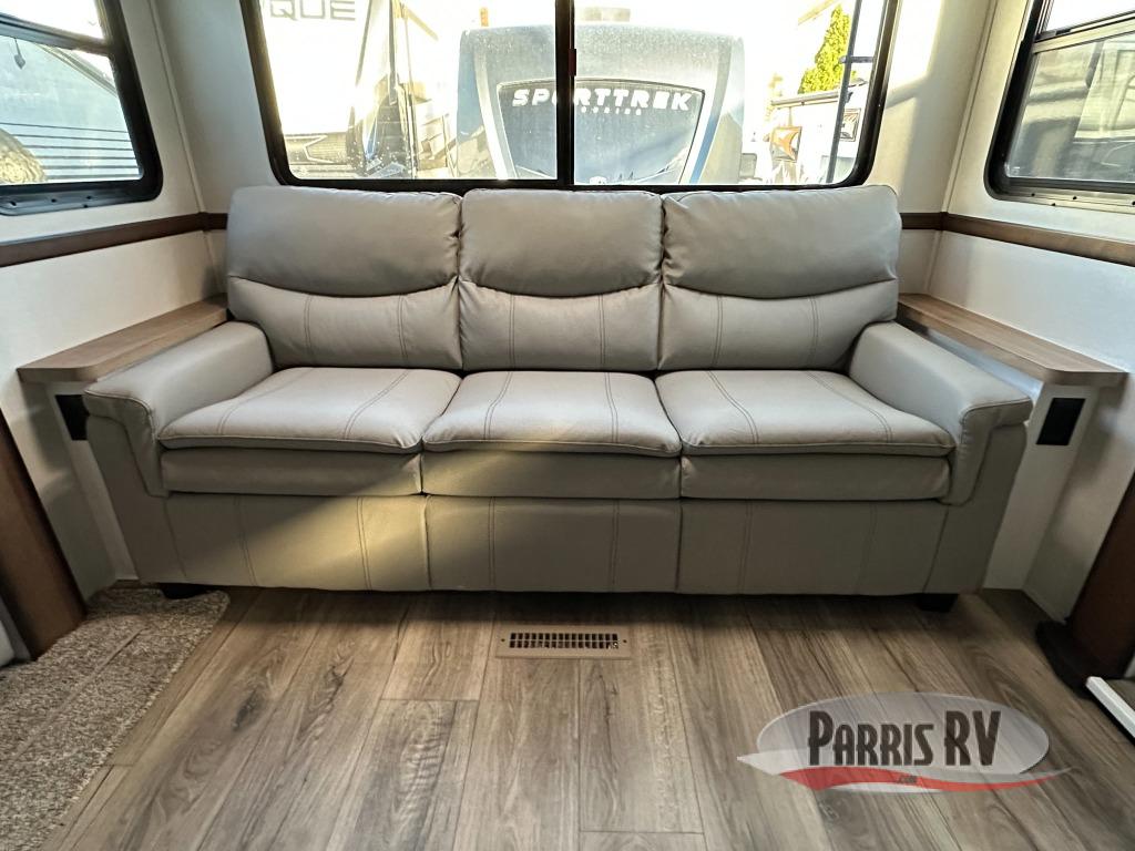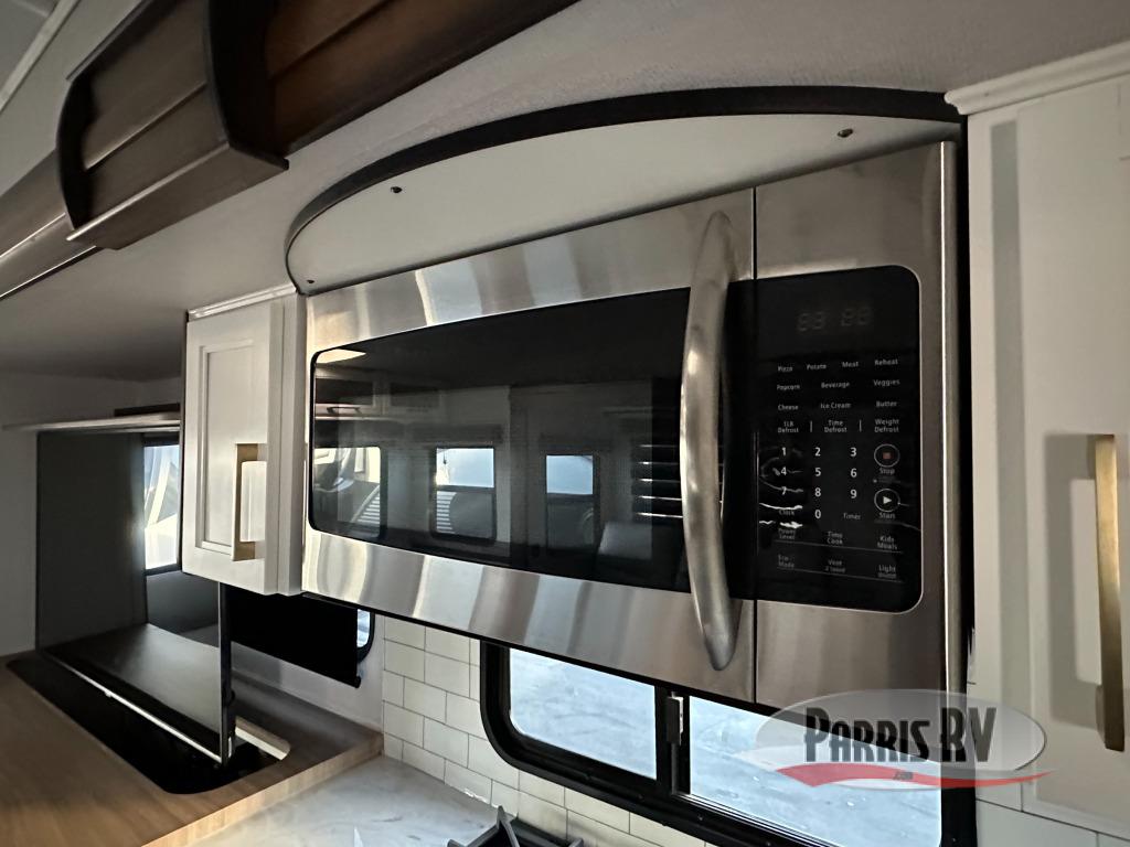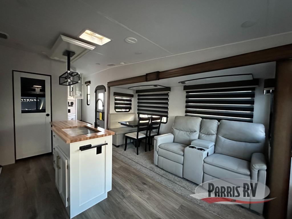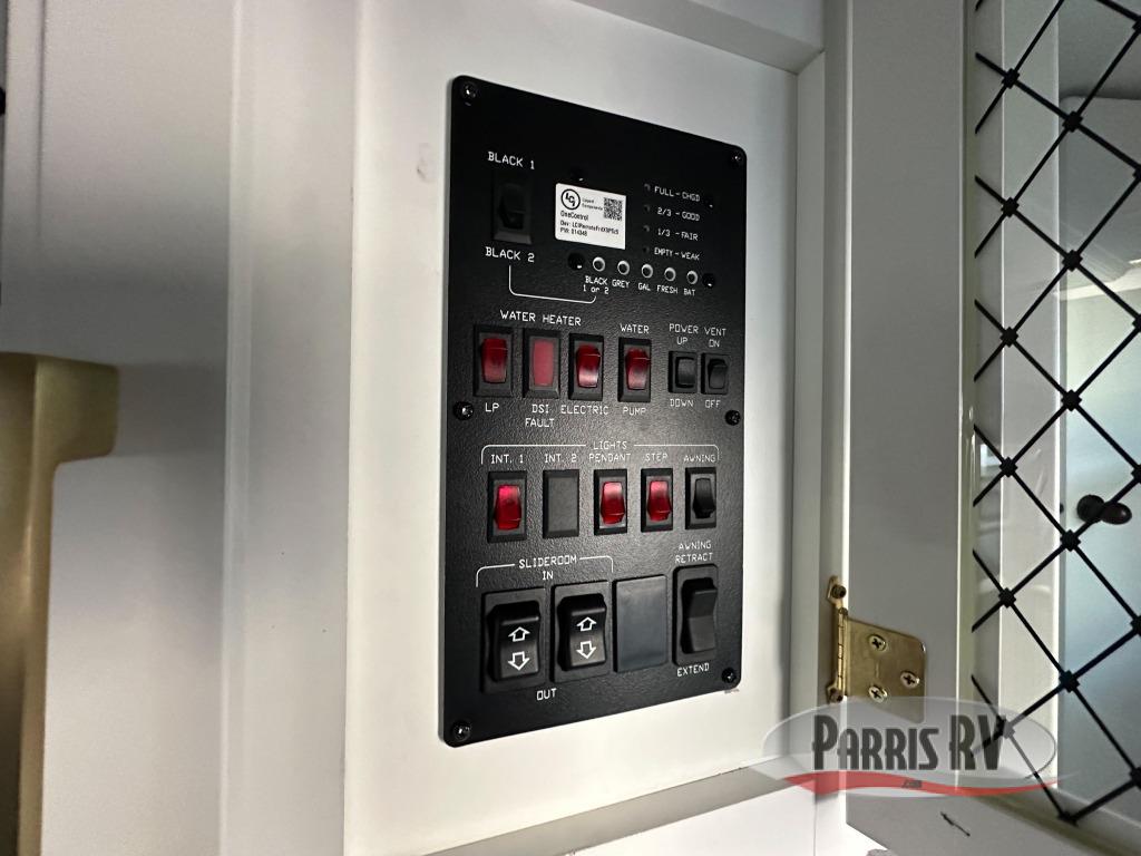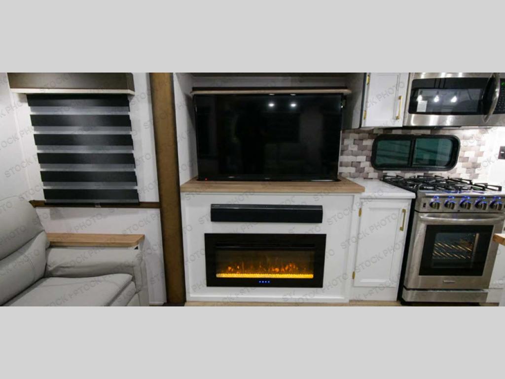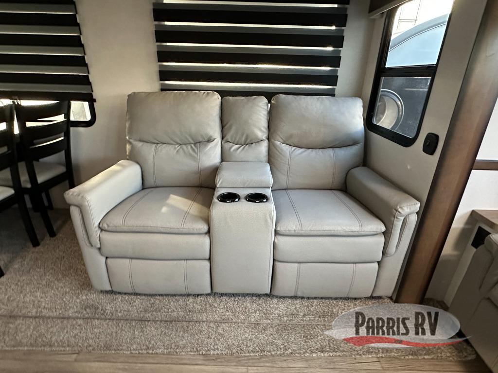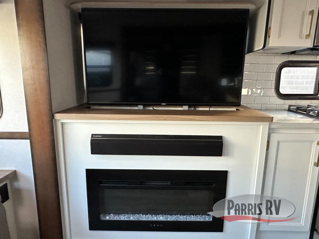 Cozy up on the theater seats or the hide-a-bed sofa to watch the large LED TV on a lift with a fireplace below after a day of exploring outdoors! You and your spouse will have a free-standing dinette to dine or work at and a walk-in pantry to store lots of food for when the grandkids join you, and the gas/electric refrigerator can hold lots of beverages. The cook will love the four-burner cooktop when feeding more than you two, and the kitchen island is useful as well. Head to the full bathroom to get cleaned up before bedtime, and retire on your own queen bed. You will find lots of clothing storage and under-bed storage with struts. The next morning, drink your coffee while you relax under the LED-lit Smart arm awning which offers a living area outdoors that is protected from the elements.