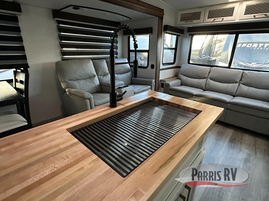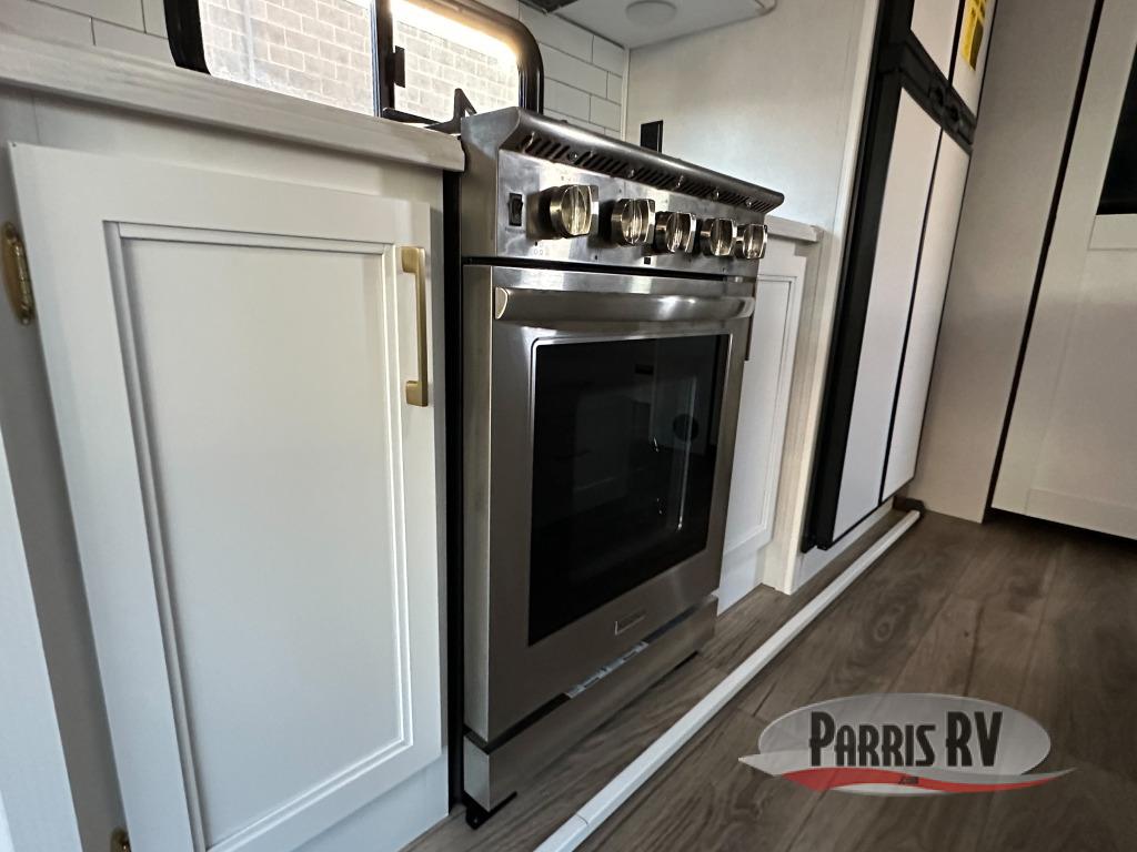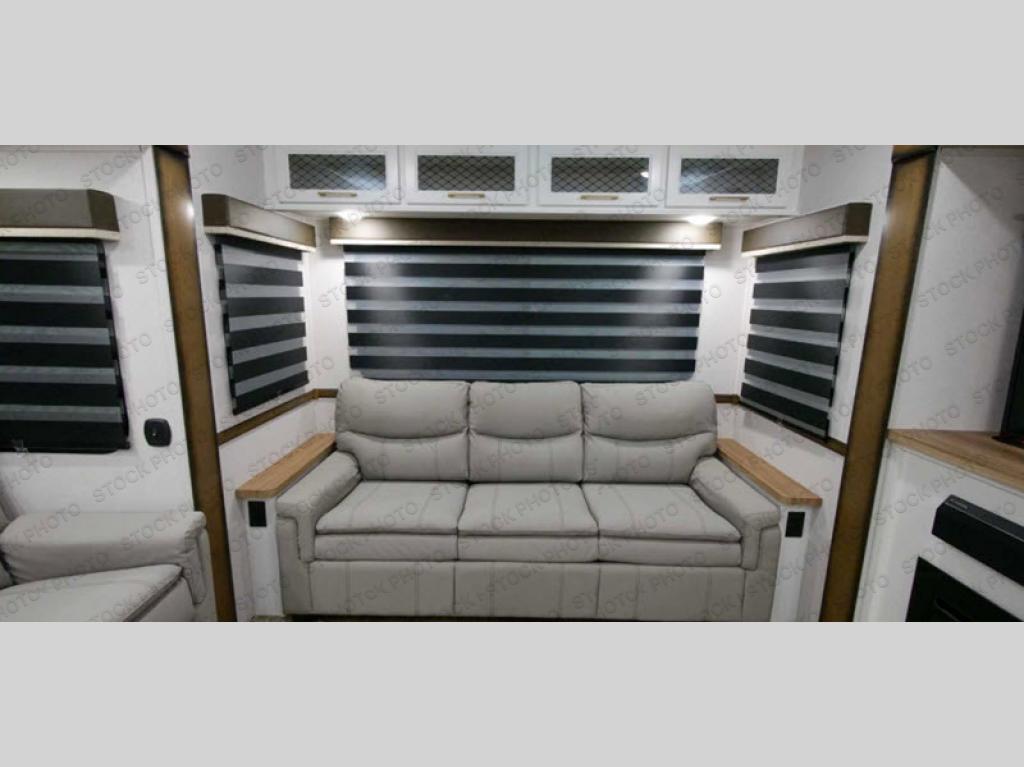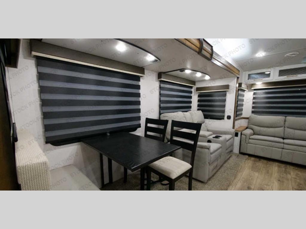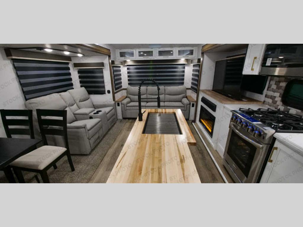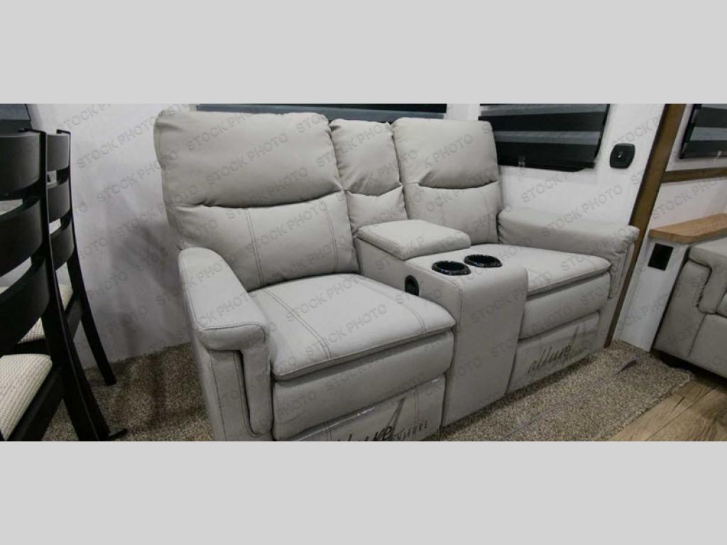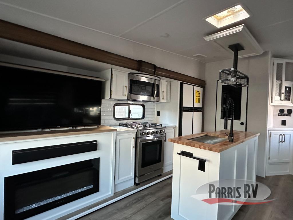 Cozy up on the theater seats or the hide-a-bed sofa to watch the large LED TV on a lift with a fireplace below after a day of exploring outdoors! You and your spouse will have a free-standing dinette to dine or work at and a walk-in pantry to store lots of food for when the grandkids join you, and the gas/electric refrigerator can hold lots of beverages. The cook will love the four-burner cooktop when feeding more than you two, and the kitchen island is useful as well. Head to the full bathroom to get cleaned up before bedtime, and retire on your own queen bed. You will find lots of clothing storage and under-bed storage with struts. The next morning, drink your coffee while you relax under the LED-lit Smart arm awning which offers a living area outdoors that is protected from the elements.