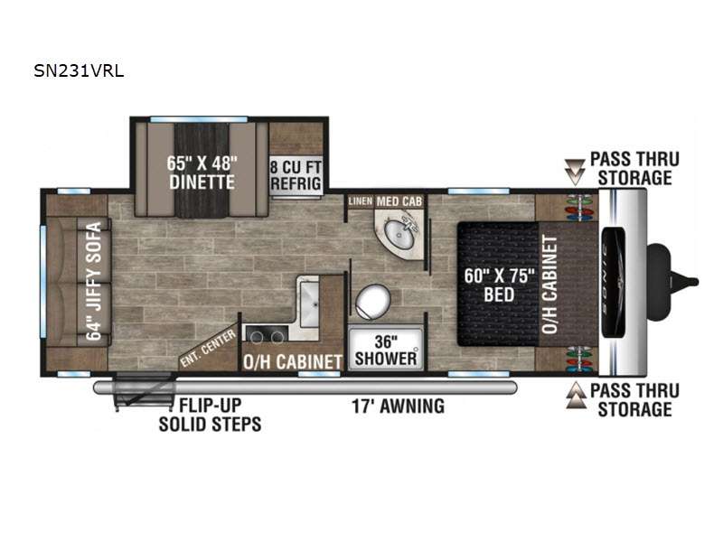 Imagine having your own RV to travel to state parks, RV resorts, or to see the grandkids. With this Sonic travel trailer, you will have your own private bedroom with an RV queen bed, StorMore bedside nightstands with a 110V outlet and USB charging to keep the electronics ready, dual wardrobes, and access to the walk-through bathroom. The grandkids or your guests can sleep on the furniture at night giving them their own room. The cook will surely love the kitchen that features a two-burner cooktop and an 8-cu. ft. refrigerator that can hold your food for the week. You might like to relax under the 17' power awning after being in the sun all day, and take a shower in the walk-through bathroom just before bedtime. There is more to see, so take a look!