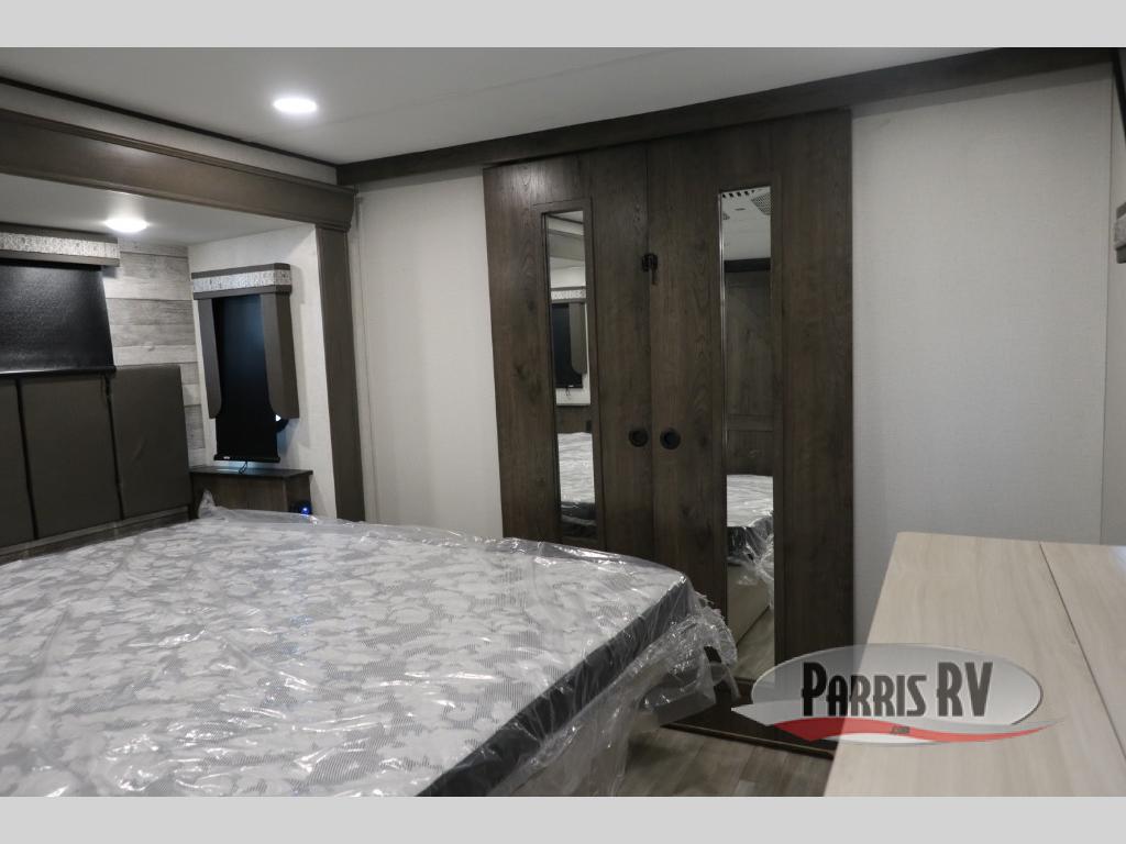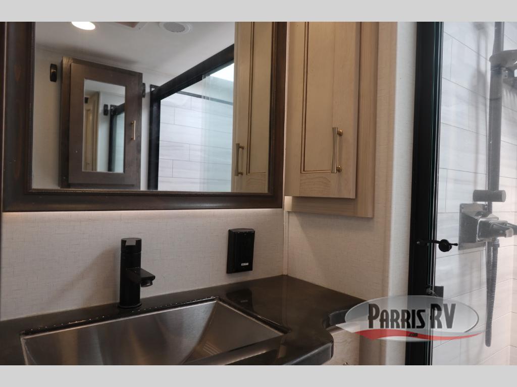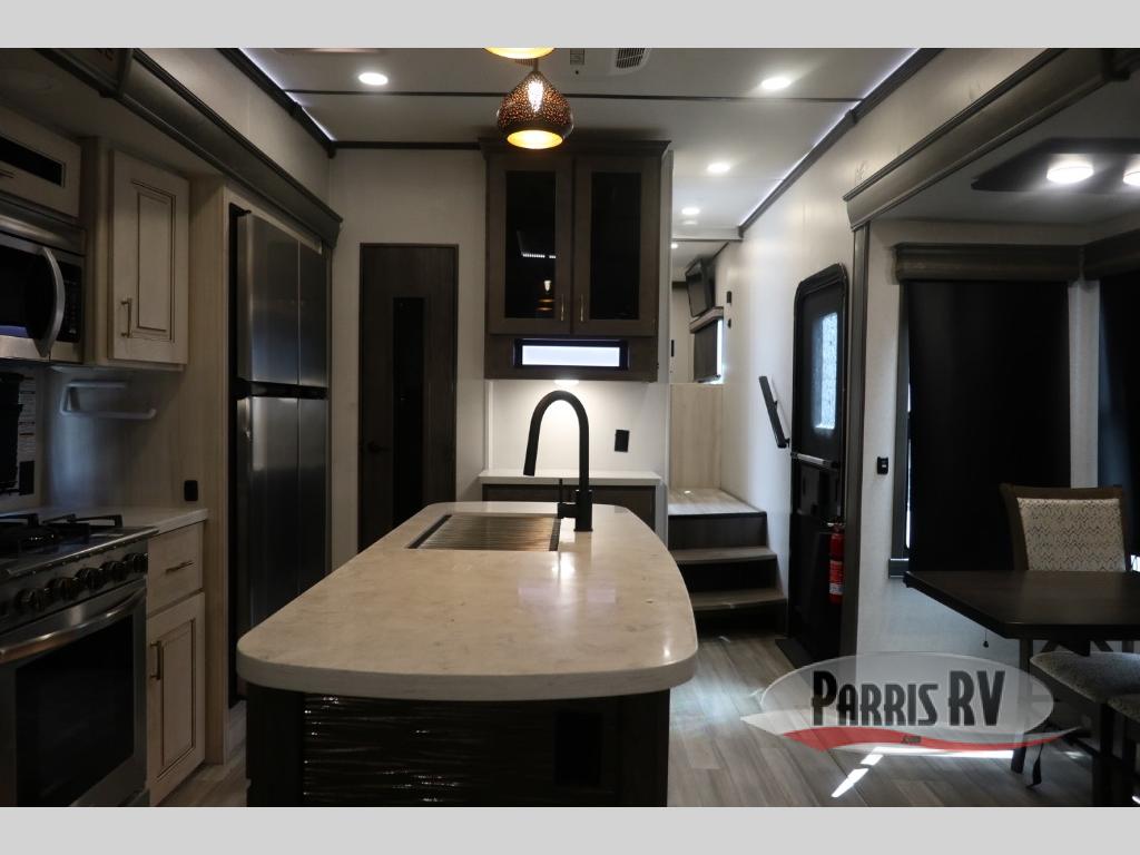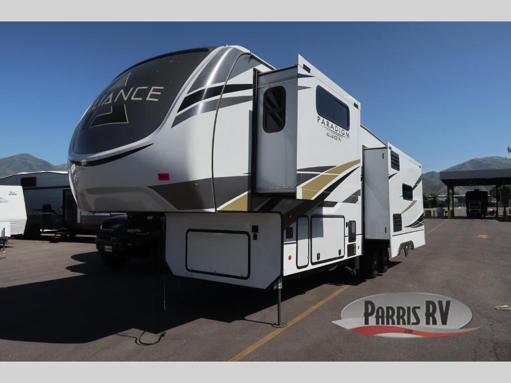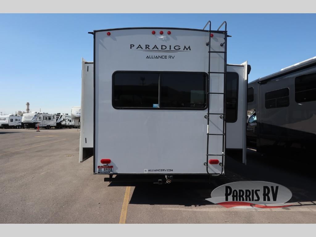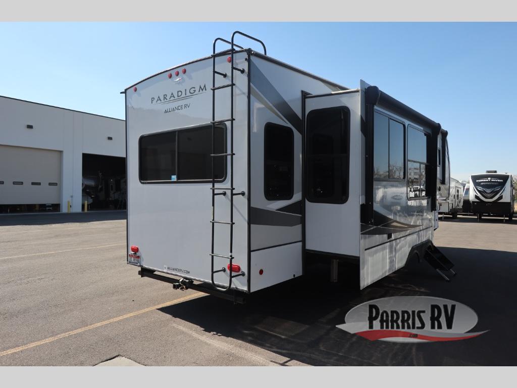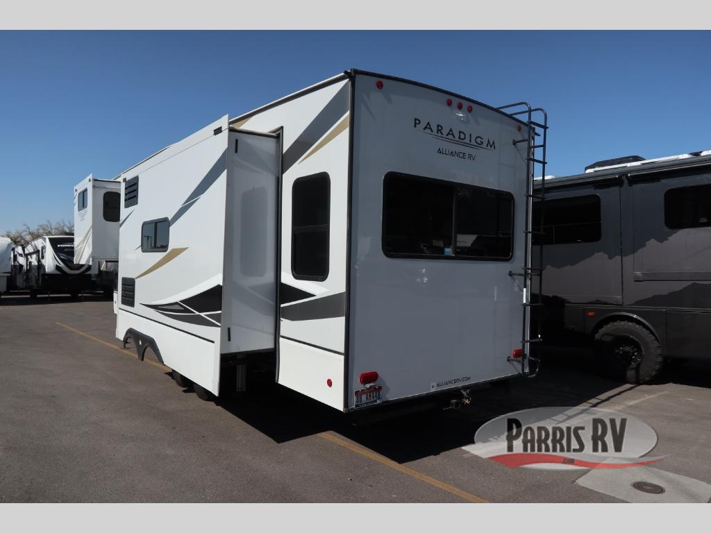 Search for the best views, the nicest RV park or a place you haven't seen for years with this Paradigm in tow! From the king bed slide in the master bedroom, the Smart TV, the dresser with flip-up hidden storage and the front wardrobe to the rear living area with a sleeper sofa near the pull-out fireplace with storage, you might decide to live in this fifth wheel. The full bathroom offers a large residential shower, a porcelain toilet with soft close seat, and storage for your linens, while the kitchen gives you two pantries, an island with a stainless steel farm sink and a space prepped for a dishwasher option, plus a residential microwave, range and oven to make meals. And you will love the dual recliner love seat and the floating dinette table. There are so many more features included, take this fifth wheel home today!