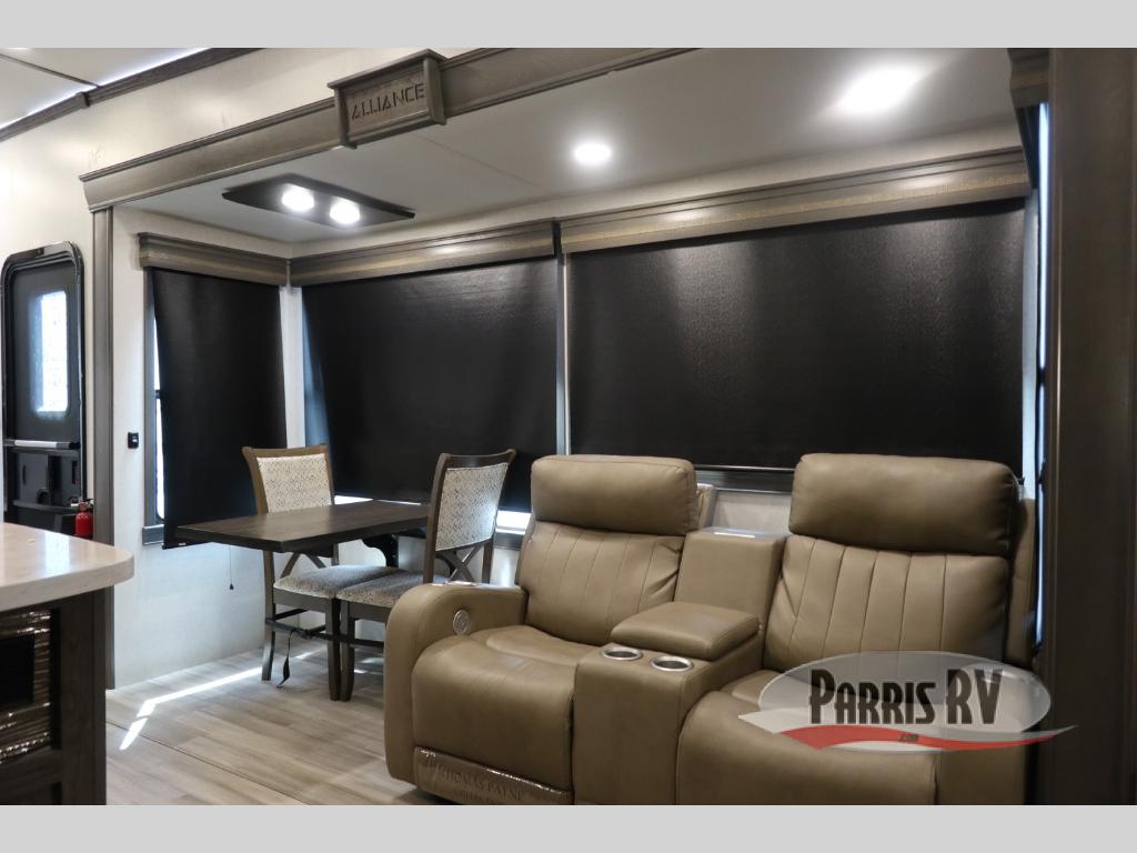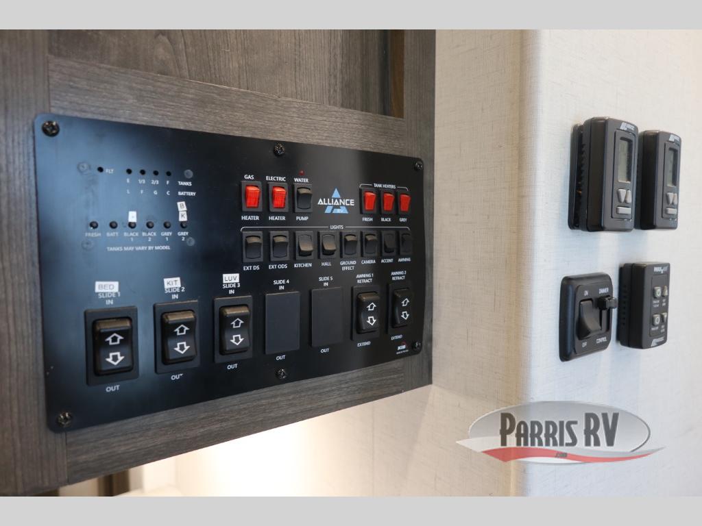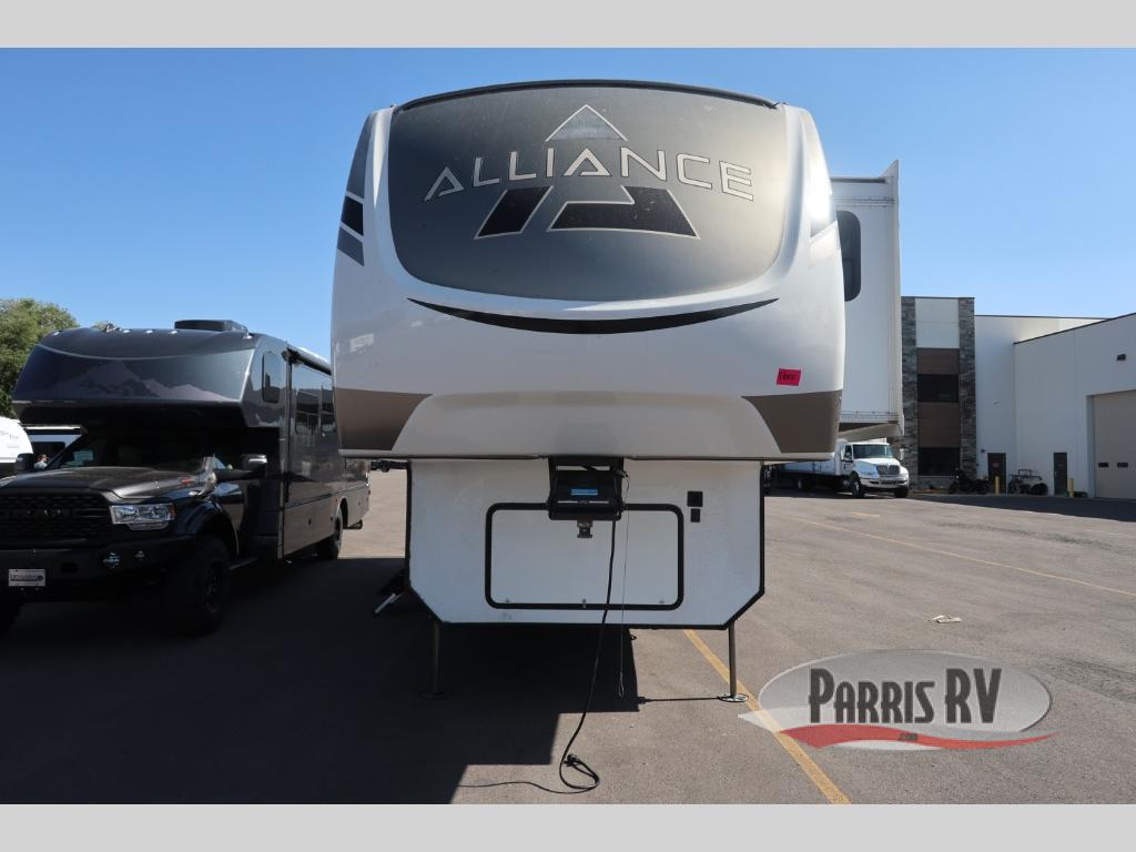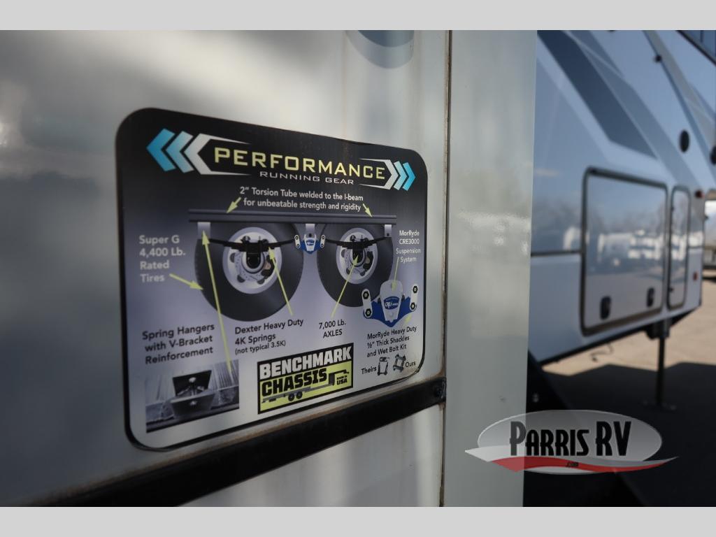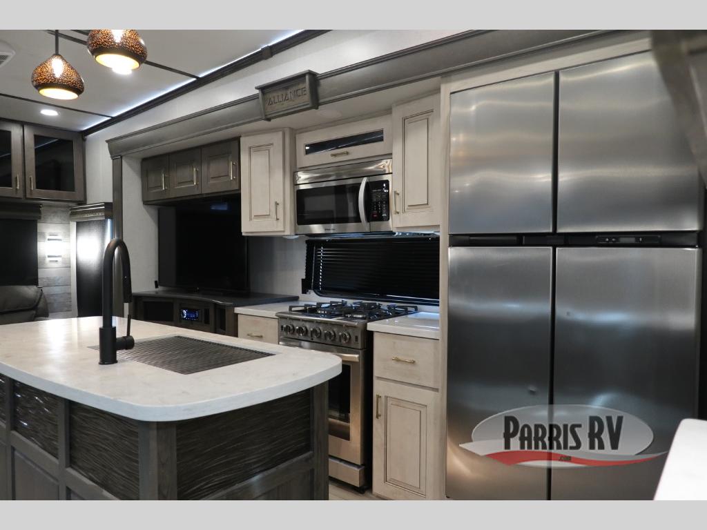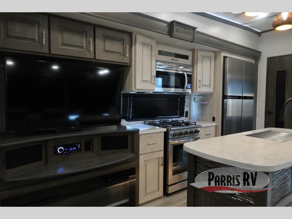 With any Paradigm fifth wheel by Alliance RV, you will experience the next generation advanced frame technology with heavy duty performance running gear. The Benchmark chassis features solid steel 10" l-beam main rails with a 2" torsion tube welded where the running gear attaches, drop frame storage area, flush upper deck design, reinforced goose neck area and a Rota-Flex pin box. The six-point hydraulic auto leveling is faster, stronger and quieter allowing you to enjoy more time away, and the PVC roof is more puncture resistant, ultra bright white and more solar reflective to help keep your fifth wheel cool. The triple 13,500 BTU A/Cs are ultra quiet, independently controlled direct flow A/C units that maximize cooling capacity, plus the 40,000 BTU furnace has flex ducts connected to formed ducts in the floor, and there are dedicated heat vents into the basement and underbelly to keep the tanks and your gear cozy warm during the cooler seasons. Choose luxury, choose convenience, choose to own the best, a Paradigm!