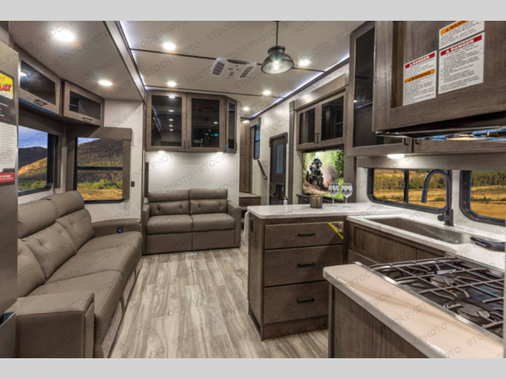 There is room for your off-road toys and the whole family in this toy hauler! The bath and a half makes life more convenient and the dual entry doors create a smooth flow of traffic in and out of the unit. Aside from 13' of garage space, an air compressor, and an entrance/exit door there are also opposing HappiJac sofas with a queen bed above them, a loft that opens to the living room, and a half bathroom. The chef can prepare their best meals with the four burner cooktop while two others sit at the flip up counter with two bar stools. After a fun day on the trails, wash up in the full bathroom with the 48" x 30" shower, grab your pajamas from the front wardrobe or flip top dresser in the front private bedroom then relax on one of the two sofas by the fireplace and Smart TV!