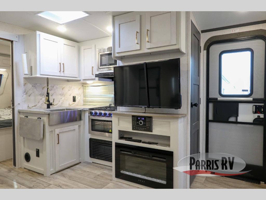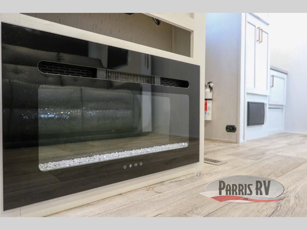 This travel trailer is perfect for two people looking to getaway for the weekend! It features a front private bedroom with a king bed to lay your head at night with wardrobes and nightstands on either side. You can prepare your best meals with the glass top three burner cooktop with a 17" oven and the 8 cu. ft. double door refrigerator then enjoy them at the 78" chaise lounge with a removeable table. The lounge is also conveniently across from an entertainment center with a 30" glass fireplace and a 40" LED TV. Inside the full rear bathroom is a shower to freshen up in each morning and a closet to keep your linens close.