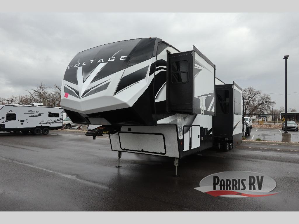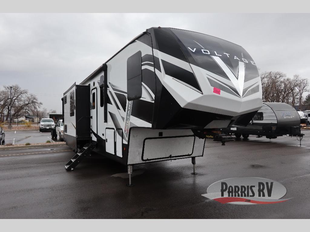 The Dutchmen Voltage toy hauler is an amazing RV that won't disappoint! These elegant units have more durability and luxury than you ever thought possible. They include an All Weather Package, 16" custom wheels, a gel-coat fiberglass exterior finish, MorRyde CRE 3000 suspension, Secure Stance entry steps, and a second fuel tank for a total of 60 gallons. There is a second power awning over the garage entry door, and you will even find a third awning above the ramp patio. The tinted frameless windows will protect you from outside prying eyes and harsh sunlight, and the interior solid-surface countertops in the kitchen will withstand many years of chopping and dicing. You'll also have a 12" diamond plate in the garage for protection, and there is an aluminum four-step entry that leads right into the garage.