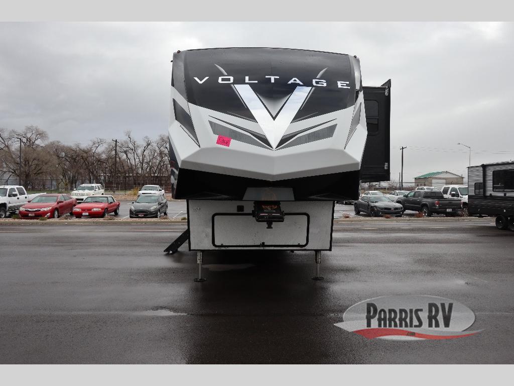 You'll love this Voltage toy hauler because it offers you high-class luxury! There is a full and half bathroom so that everyone can easily get cleaned up when needed, and there is a king-size bed for true relaxation. Two entry doors make it easy to get in and out of this unit, and you'll have an excellent kitchen ready for all types of chefs. There is a range with oven, a residential microwave, an 18-cubic foot refrigerator, and a pantry. Across from the heated/massaging residential sofa is where you will find the fireplace and entertainment center, and you can enjoy all of your meals seated on one of the two sofas with table top in between in the garage.