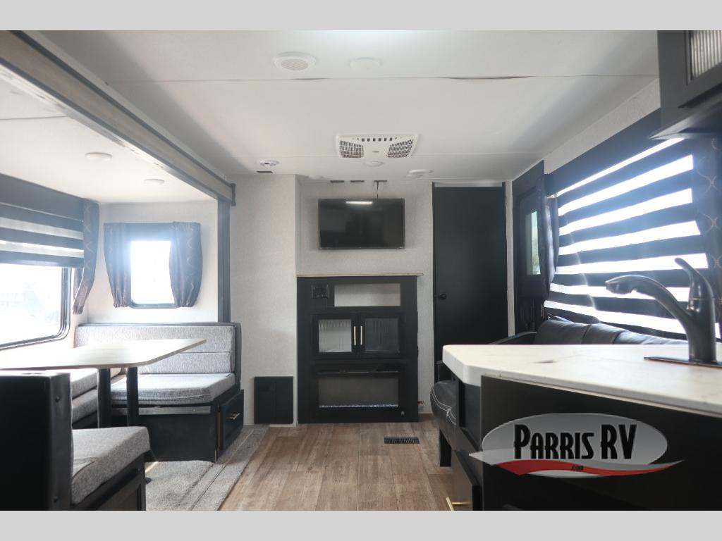 You won't believe all that is included with this travel trailer! Starting with the dual entry doors for a smooth flow of traffic to the outside storage areas, the outside TV mount, the outside kitchen, and the rear storage rack. The kiddos or guests can sleep on the set of double bunk beds with a ladder which are conveniently next to the rear corner bathroom that has a tub/shower and an entrance/exit door. The U-shaped dinette and sofa can also transform into extra sleeping spaces if needed. Lay your head at night on the walk around queen bed with wardrobes on either side, a TV mount area, and a linen closet for your clothes. There is even a fireplace below the TV mount at the entertainment center for a cozy evening indoors!