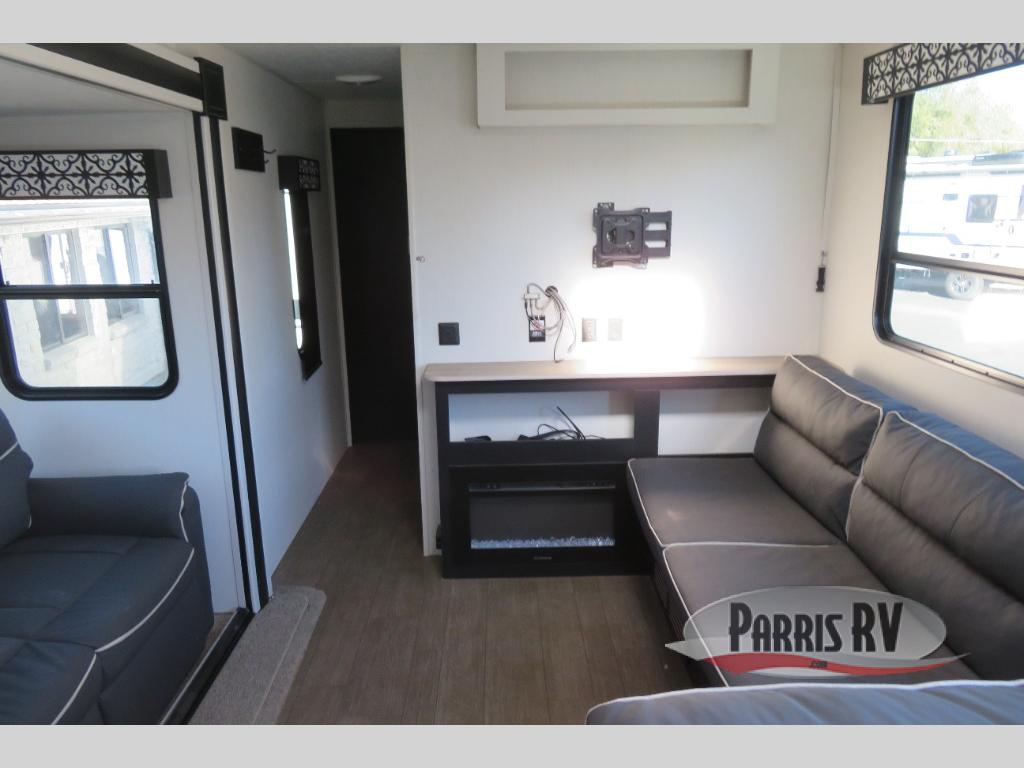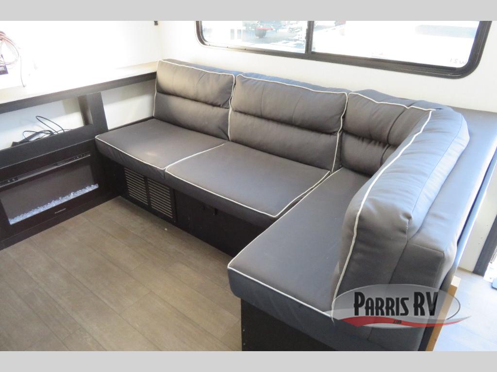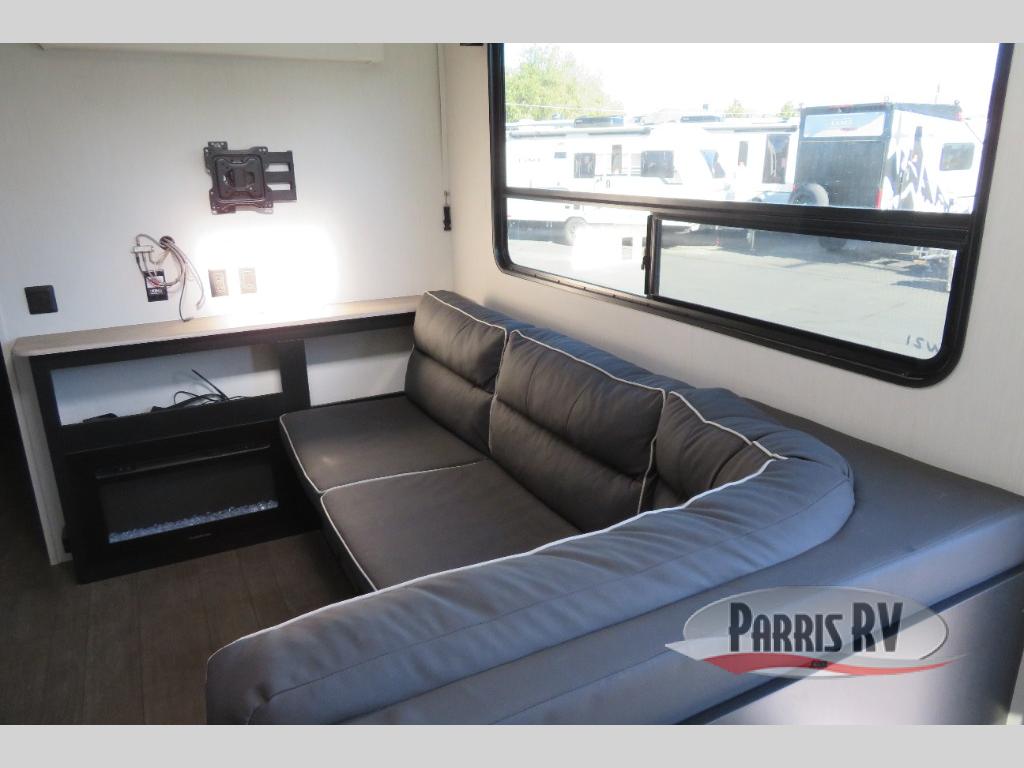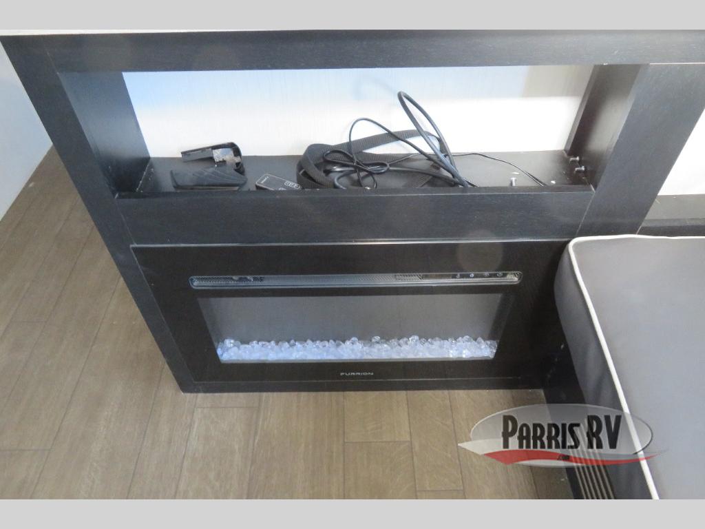 Eat, sleep, relax, and play in this feature-packed travel trailer. The rear kitchen includes a full-width counter with a huge window for a great outdoor view, and your guests can gather around the party lounge once lunch is served. There is also a 50" TV here with storage space below and a cozy fireplace. The full bath will allow everyone to clean up each day, and the front private bedroom will feel just like home. Here, you'll enjoy a king bed with under-bed storage, plus three closets to store all your belongings.