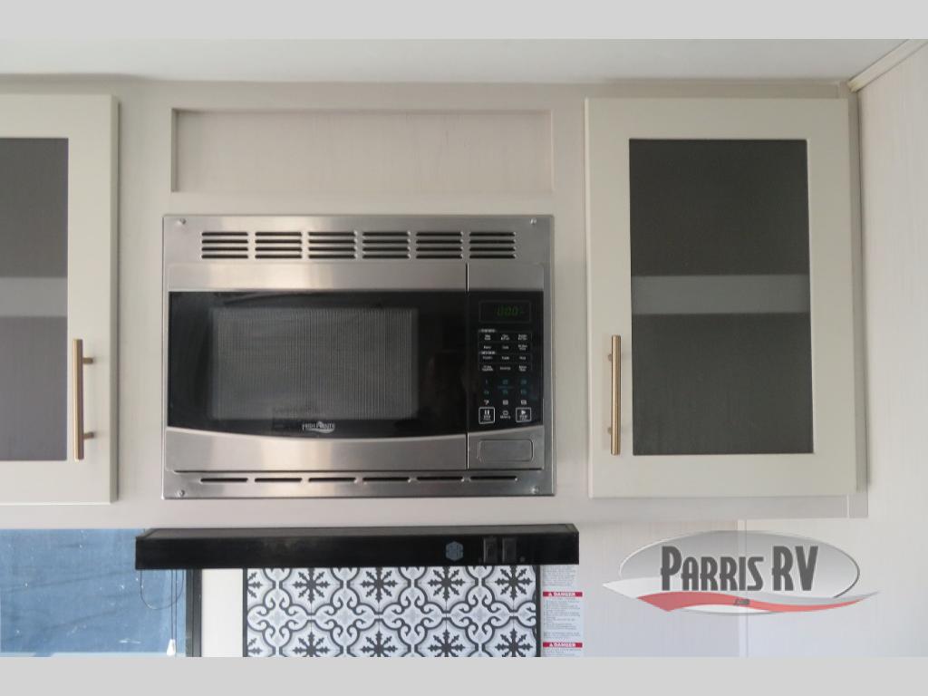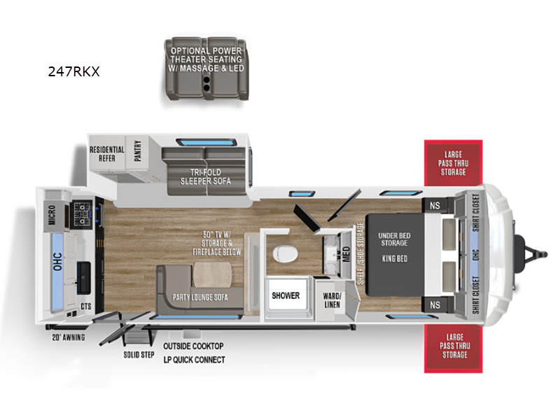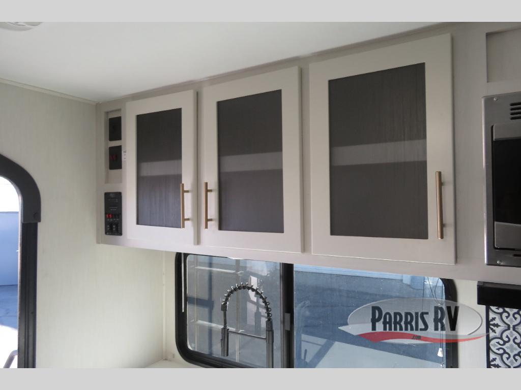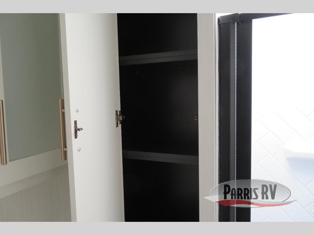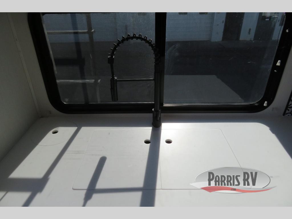 Eat, sleep, relax, and play in this feature-packed travel trailer. The rear kitchen includes a full-width counter with a huge window for a great outdoor view, and your guests can gather around the party lounge once lunch is served. There is also a 50" TV here with storage space below and a cozy fireplace. The full bath will allow everyone to clean up each day, and the front private bedroom will feel just like home. Here, you'll enjoy a king bed with under-bed storage, plus three closets to store all your belongings.