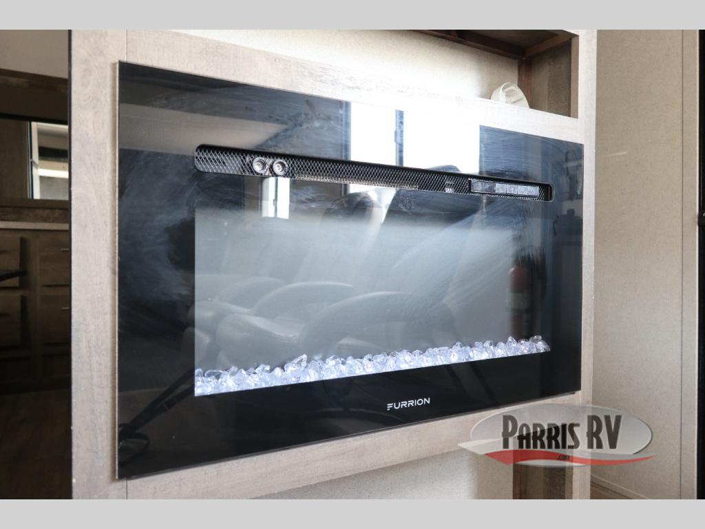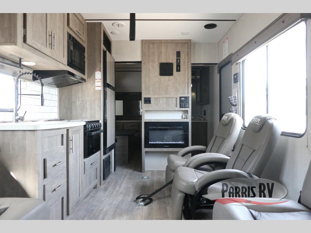 Answer the beckoning call of the outdoors with this toy hauler! You can easily store your toys in the 14' 2" garage area then set up the Sit N Sleep quick release sofas with a table in between to enjoy your meal prepared with the 17" black oven and glass cooktop. Relax in comfort in one of the two barrel chairs next to the fireplace and TV prep area or replace them for the optional Euro recliner chairs instead. Freshen up after a fun day on the trails in the front corner bathroom with the shower that has a skylight above for more headroom and natural lighting. When you're ready to head to bed, you can set up the Sleep N Store manual bed system above the sofas in the garage area and enjoy a good night's rest on the RV queen bed in the front corner private bedroom. You will be the talk of the campground with your patio deck too!