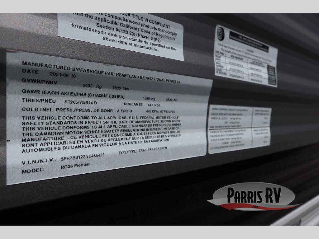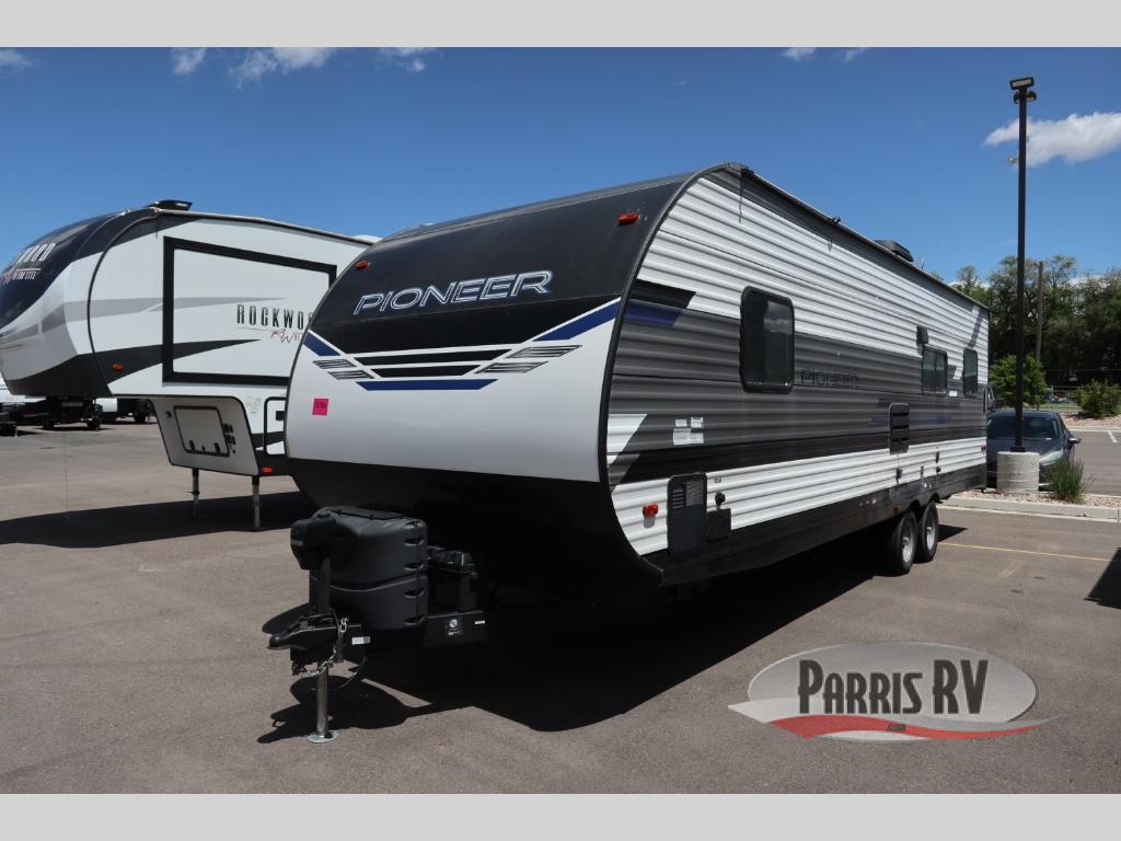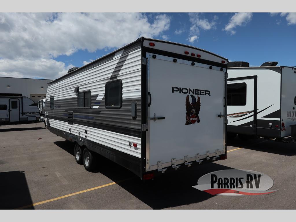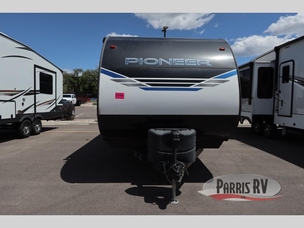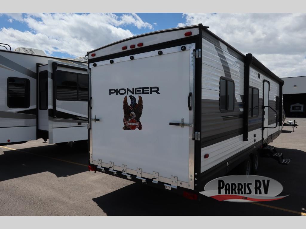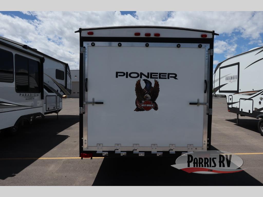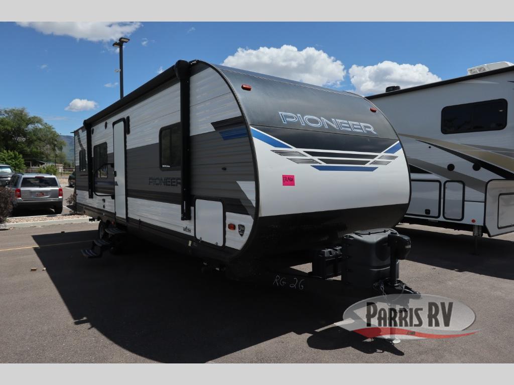 With any Pioneer dual axle travel trailer or toy hauler by Heartland, there is a hybrid aluminum front profile with aerodynamic radius front cage structure for better wind and water deflection, adding strength and reducing tongue weight. The Pioneer Power Pack provides power stabilizer jacks, a power tongue jack and a power awning, plus the EZ Camp package gives you a black tank flush, an outside shower with hot and cold water, LP quick connect, an outside TV hookup and a flip-down secure step with an XL handle. The interior offers solid surface countertops and a large stainless steel sink with high rise faucet in the kitchen, full linoleum on the main floor and no carpet in slide outs, cable TV hookup with RG6 coax cabling, and crossflow windows allowing the fresh air to circulate through the extra large windows. Make your selection today!