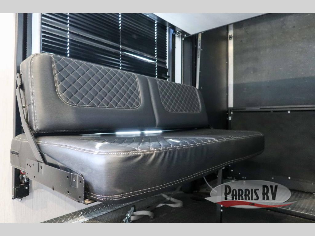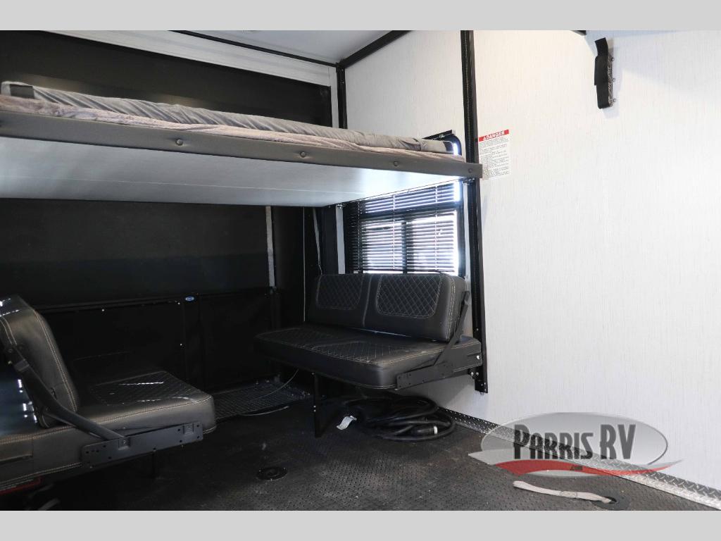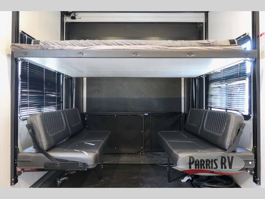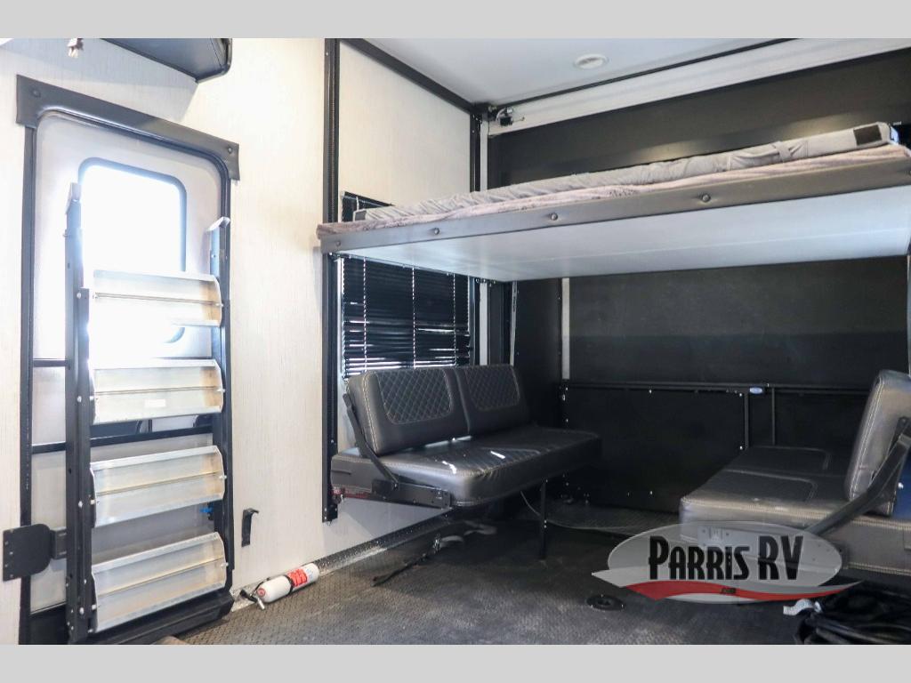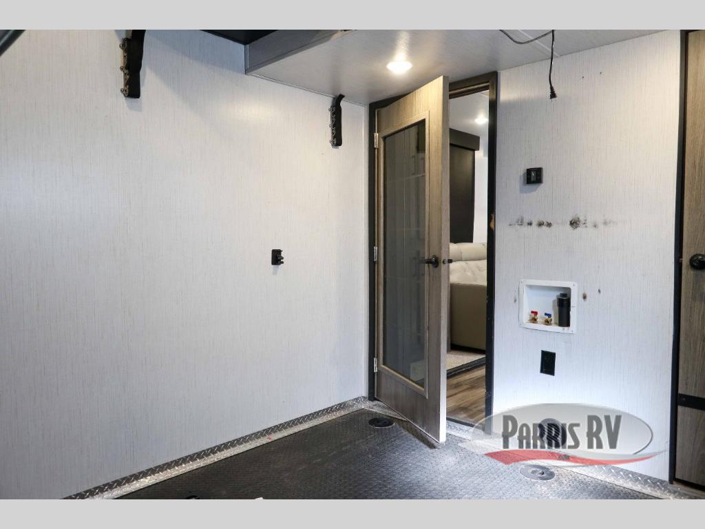 It's time to seek adventure and stay in luxury in this fifth wheel that allows you to bring along your toys be it mountain bikes, motorcycles and/or an ATV! After easily loading up the ramp door into 13'8" of garage space, you can head out. You will appreciate having dual entry for easy access to your toys and the main living and kitchen area, plus having a half bath in the garage is super convenient. You might even like to add the electric queen bed-split bench seat/bed option for more dining and sleeping space. Relax inside the main area on the large sofa and dine at the drop down dinette with flip-up bench. The cook will have full kitchen amenities to make meals, plus a peninsula counter with as sink to prepare and serve meals. The full bathroom has double access, and the front bedroom offers a king bed, plus a slide out with a wardrobe and dresser for more floor space and storage. And the 30 gallon fuel station with a second 30 gallon aux tank will keep the fun going!