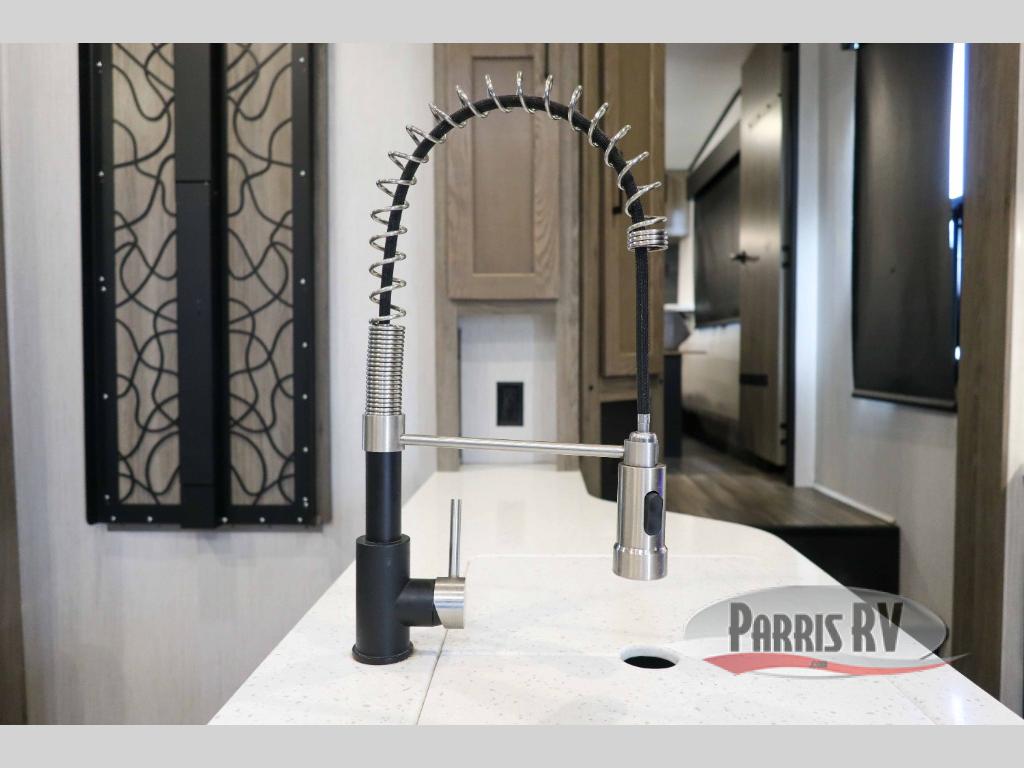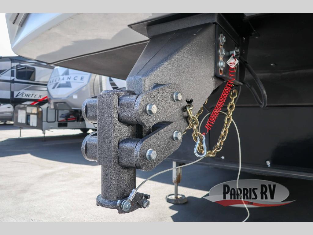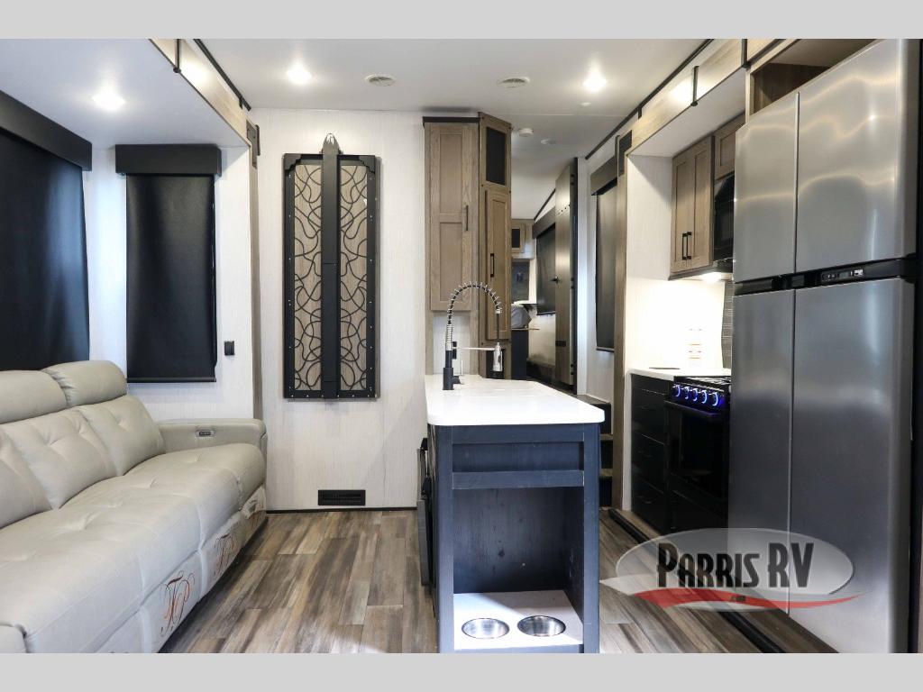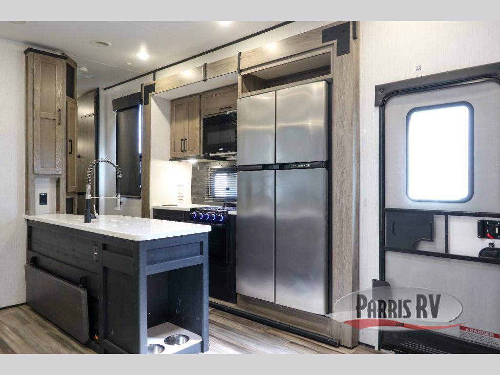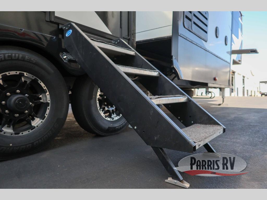 It's time to seek adventure and stay in luxury in this fifth wheel that allows you to bring along your toys be it mountain bikes, motorcycles and/or an ATV! After easily loading up the ramp door into 13'8" of garage space, you can head out. You will appreciate having dual entry for easy access to your toys and the main living and kitchen area, plus having a half bath in the garage is super convenient. You might even like to add the electric queen bed-split bench seat/bed option for more dining and sleeping space. Relax inside the main area on the large sofa and dine at the drop down dinette with flip-up bench. The cook will have full kitchen amenities to make meals, plus a peninsula counter with as sink to prepare and serve meals. The full bathroom has double access, and the front bedroom offers a king bed, plus a slide out with a wardrobe and dresser for more floor space and storage. And the 30 gallon fuel station with a second 30 gallon aux tank will keep the fun going!