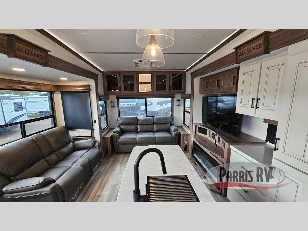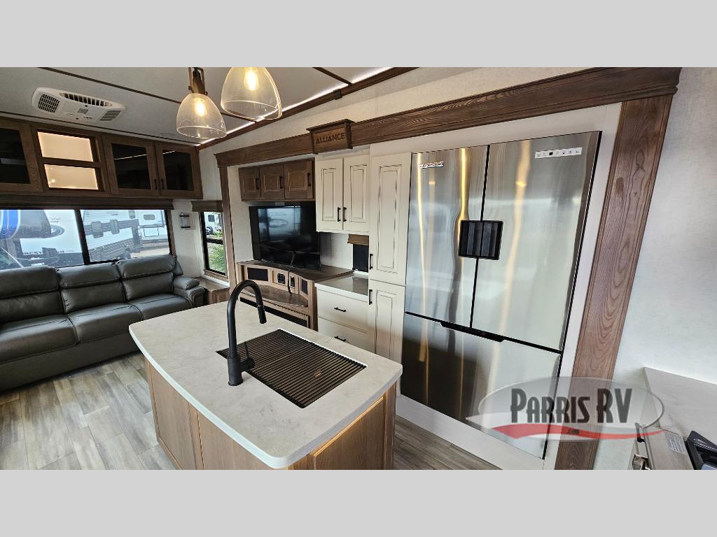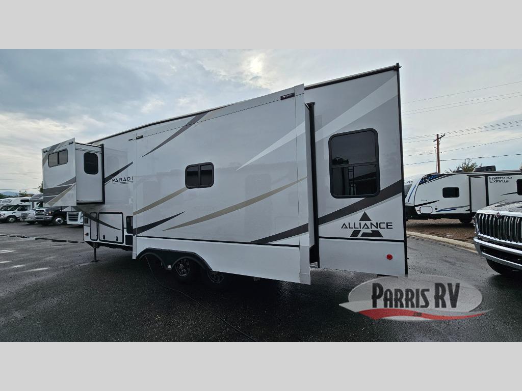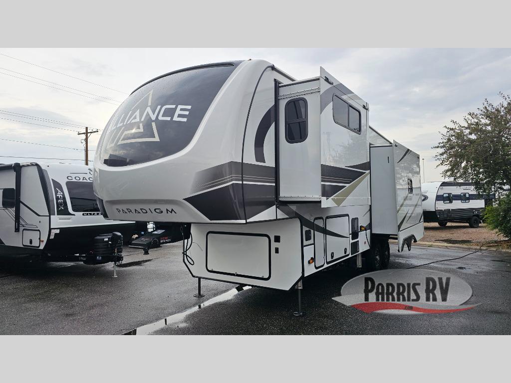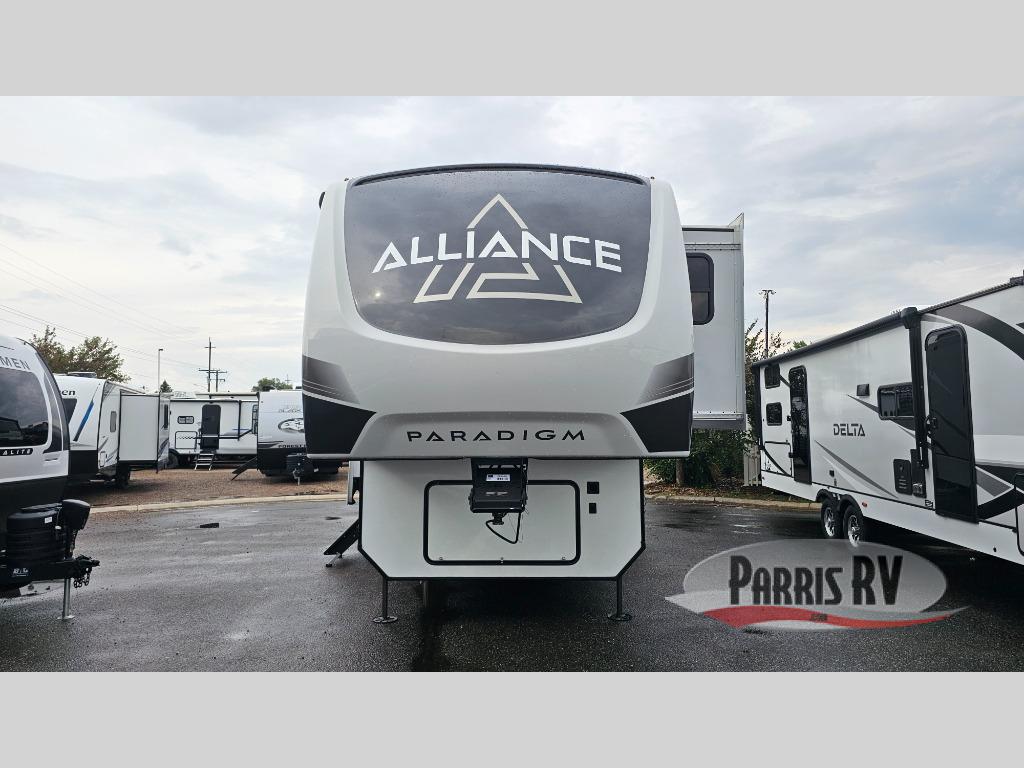 The Paradigm fifth wheels by Alliance RV are functional, high-quality, and luxurious for an unforgettable camping experience. There are three A/C units and a 40K BTU furnace to keep you comfortable year around, and you'll appreciate additional convenient amenities, like the all-in-one enclosed/heated utility center and the color coded and numbered wiring. A Roto-Flex pin box comes standard for hassle-free towing, along with Super-G 4,400 lb. rated tires and Dexter 7,000 lb. axles. You'll love the kitchen with its LG solid surface countertops and Insignia range, plus there is LED motion lighting in the pantry and a Maxx fan with a rain sensor to keep everything fresh when making dinner. Each model also includes an HD Smart TV in the living room and bedroom, plus a Winegard Air 360 antenna to keep you connected to the outside world. And of course there are a variety of options you can choose from to further customize your fifth wheel; dual pane windows, Super Solar Plus, slide out awning toppers, and generator prep or a generator to name a few!