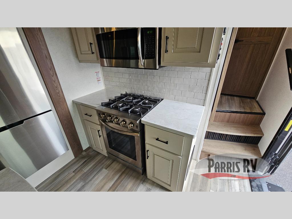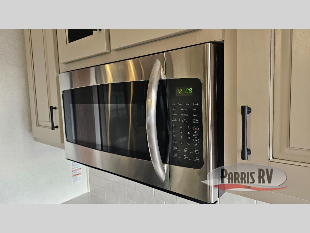 This middle kitchen will be the cook's favorite area with the Insignia range with a 12,000 BTU burner, a 3.73 cu. ft. oven, and an Insignia residential microwave. There is also a kitchen island with a stainless steel farm sink and extra counter space to prepare and serve meals. The rear living area offers a sleeper sofa next to the pull-out fireplace with storage and a 50" Smart TV. You can also relax on the dual recliner love seat, dine, or work or play games at the floating dinette table. The bedroom is up front and offers an oasis with a king bed slide, or choose the queen option. These is also a flip top dresser, a seat with storage, and a front wardrobe with a space to add an optional washer/dryer. And the double entry bathroom includes a large residential shower, a porcelain toilet with a soft close seat and more. One walk through, and this will be the one!