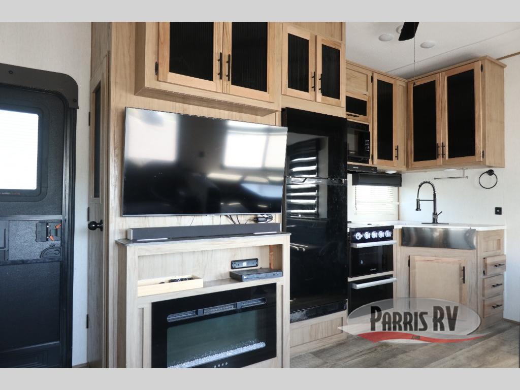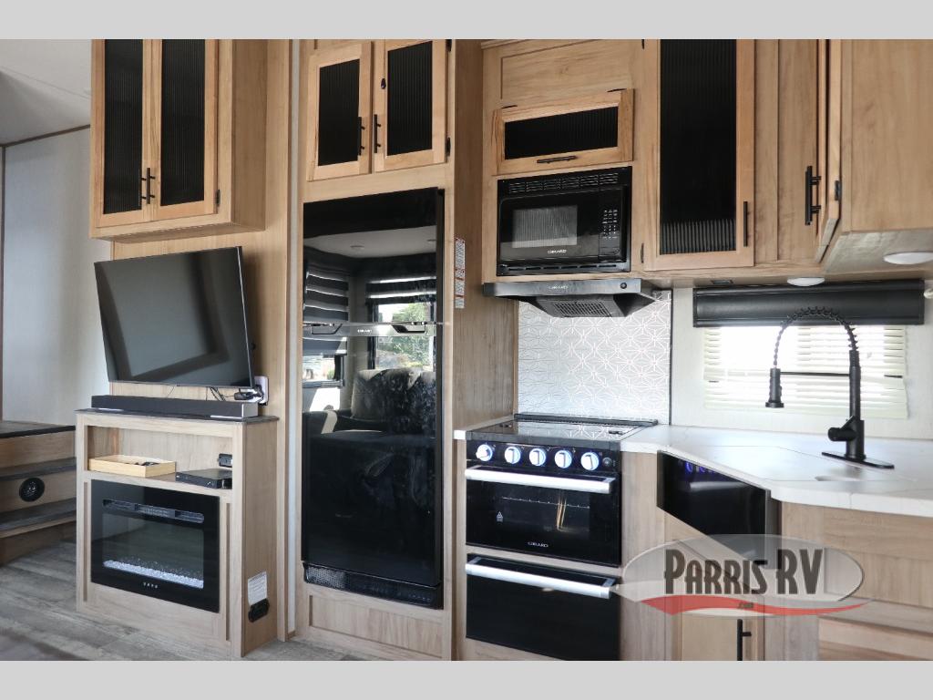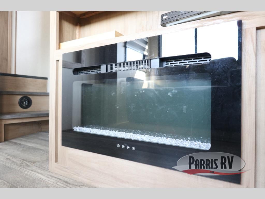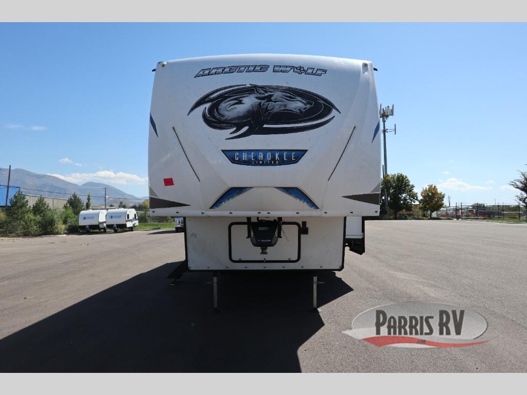Let the fun times begin with the purchase of this Cherokee Arctic Wolf fifth wheel! You'll have loads of sleeping space for ten tired travelers with the front private bedroom, rear private bunkhouse, U-shaped dinette, and tri-fold sofa. You'll also have excellent storage space with the storage below the lower bunk in the bunkhouse, the large walk-in pantry next to the entry door, the 11-cubic foot residential refrigerator in the kitchen for your perishables, the under-bed storage and large wardrobe in the bedroom, and the exterior open pass-through storage. You'll also have a large slide in the main living area for more living space, and the ceiling fan will cool you down as you are relaxing. Or, if you need to heat things up a bit, you can just switch on the fireplace.