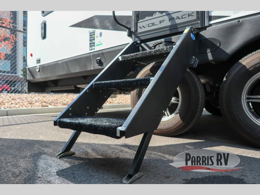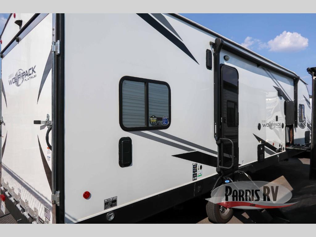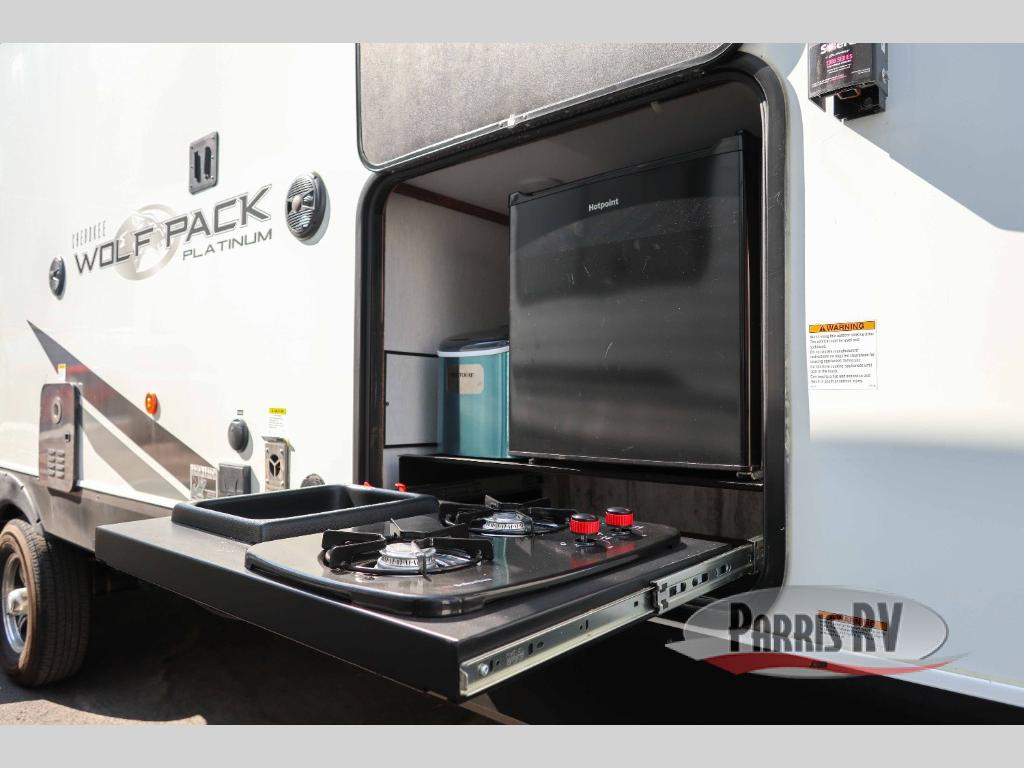 Run with the pack in any one of these Forest River Cherokee Wolf Pack toy haulers! They are affordable and versatile with a 102" widebody design to pack in all of the necessary features for a great adventure with your family and toys. The grey high gloss gel exterior will turn heads on the highway and the LED interior/exterior lights will make life easier. An outside shower with hot and cold water helps to keep the mud outside where it belongs. With an external 30 gallon fuel station, you won't have to worry about your toys being low on fuel. The Platinum package adds extra conveniences like a ramp door patio deck railing system, a Happijac bed lift system, and an industrial rubber garage floor on enclosed garage models. Come find the perfect model for you today!