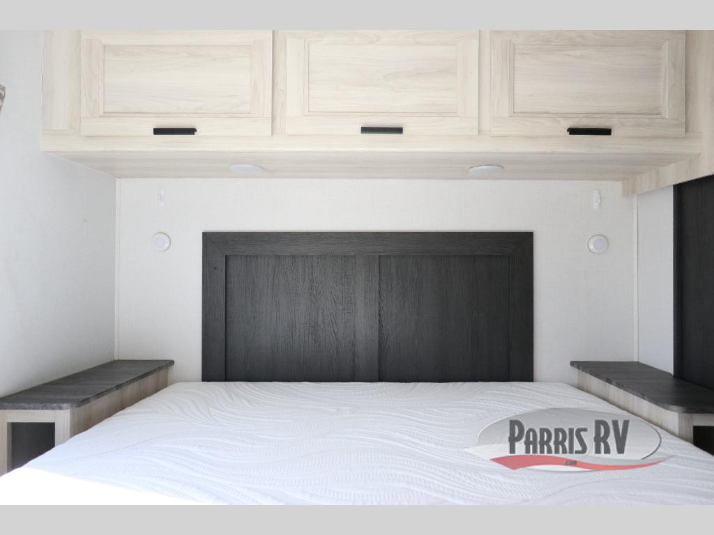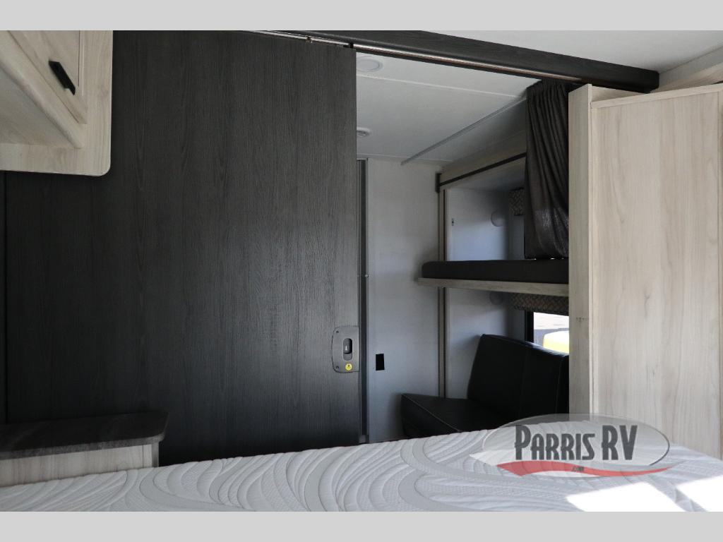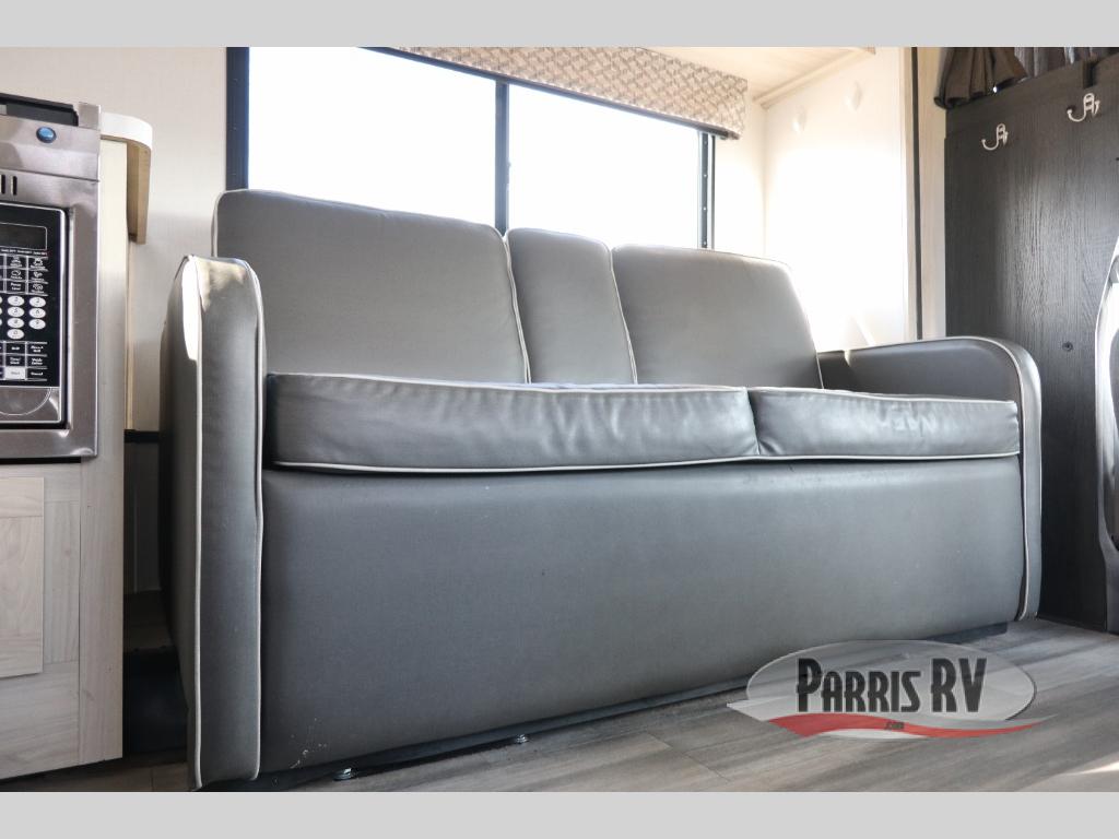 This family friendly coach allows the kids to have their own space either on the flip-down bunk above the kid's sofa sleeper that is across from the full bathroom or on the cab-over bunk. You will have the rear bedroom all to yourselves with a queen bed and a large wardrobe for your things. Everyone can visit while relaxing on the sofa and booth dinette while watching the LED TV or even while sitting under the 11' power awning outside when you add your camping chairs. The kitchen offers a corner area to make meals with a convection microwave and recessed three-burner range, plus a round sink and flip-up counter extension, and you can store cold items in the 10.7 cu. ft. 12V refrigerator near the entry, and the soft touch self-closing drawer guides and cordless 12V charging plate are features you will love.