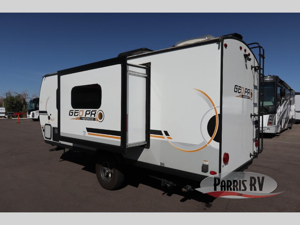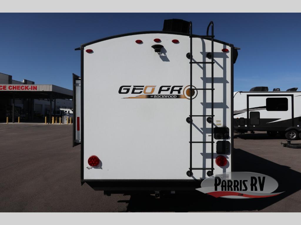 The Rockwood GEO Pro travel trailers and toy hauler by Forest River are ready for all your adventures. The interior and exterior Azdel construction, along with the vacuum laminated roof and walls provide a durable trailer, and the Dexter torsion axles with aluminum wheels make towing easier than ever. There are many convenient amenities, like the 13,500 BTU A/C, the Bluetooth system control panel, and the all-in-one Teton HD TV/WiFi/FM antenna with LTE prep. Each model includes frameless windows, fabric valances and roller shades, and a modern interior that will make you feel right at home. Everything you're looking for in your next RV is in a Rockwood GEO pro by Forest River!