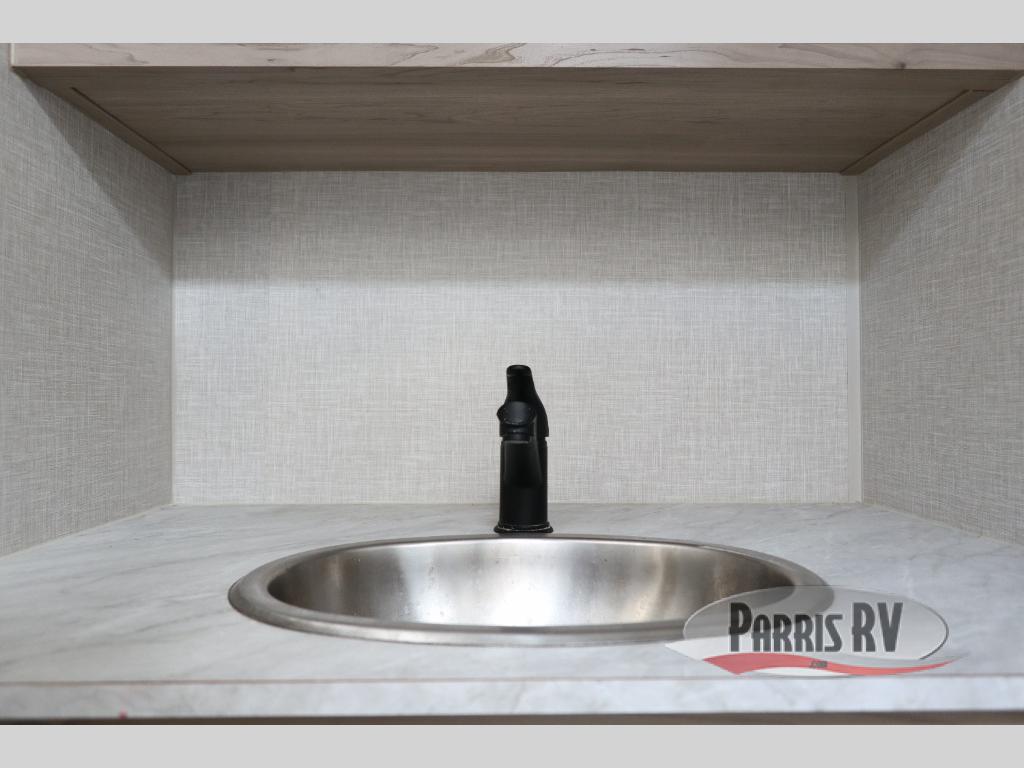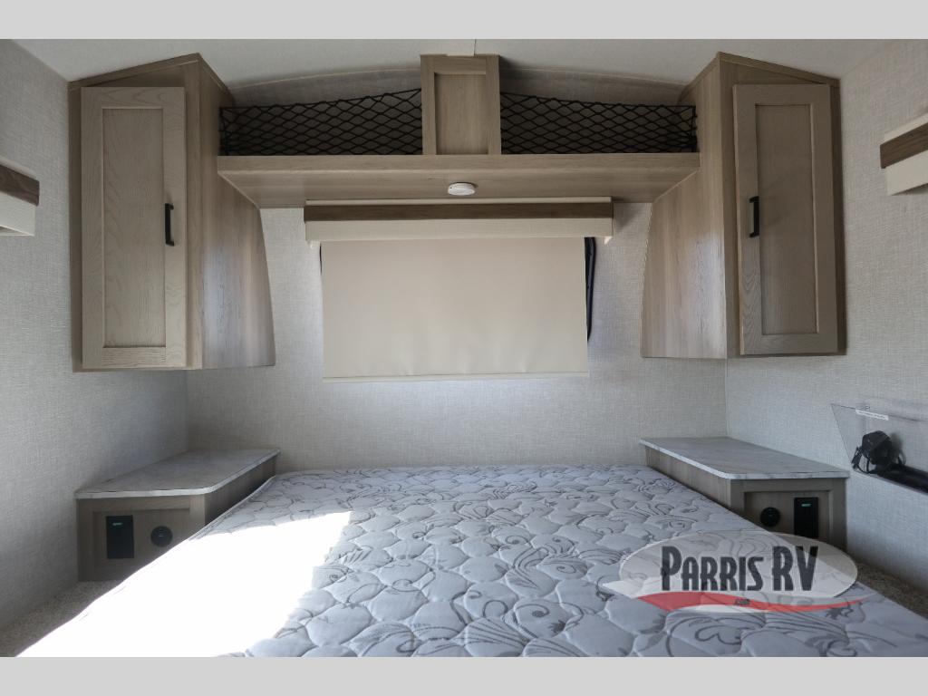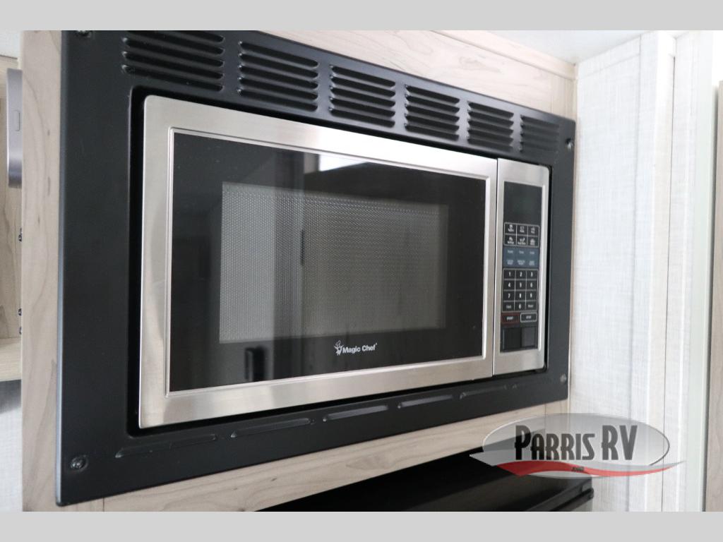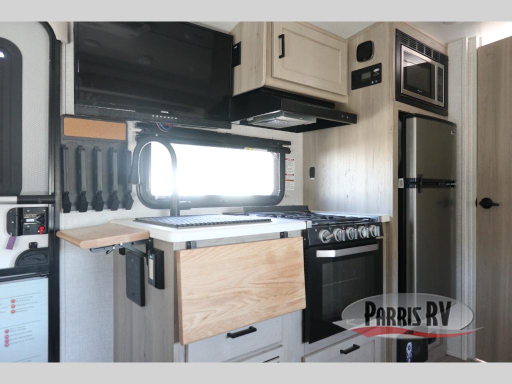 This travel trailer will feel more like home with its front bedroom and walk-around full-size bed. You'll enjoy the 12V TV as you relax on the 72" sofa with a table. The full rear bath includes an oversized shower to clean up in each day and there is a linen closet for clean towels. When you're ready to prepare dinner you'll have a three burner cooktop and microwave oven indoors, and a griddle outdoors! And don't forget the exterior storage allows you to bring along beach toys and tackle boxes!