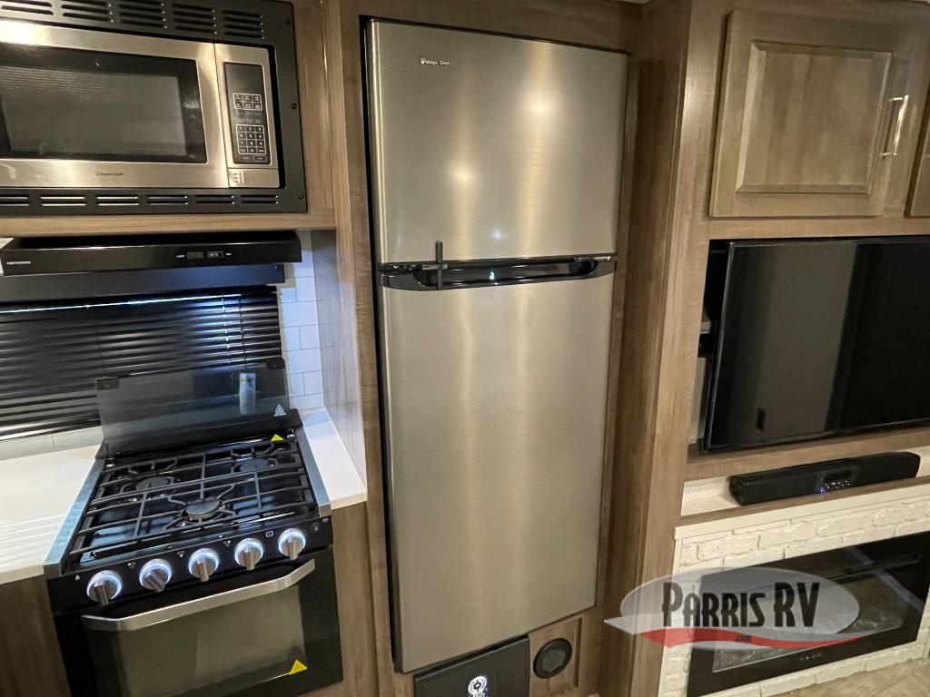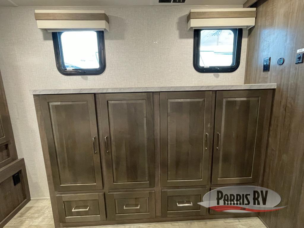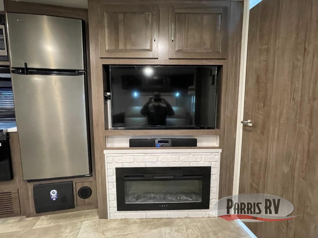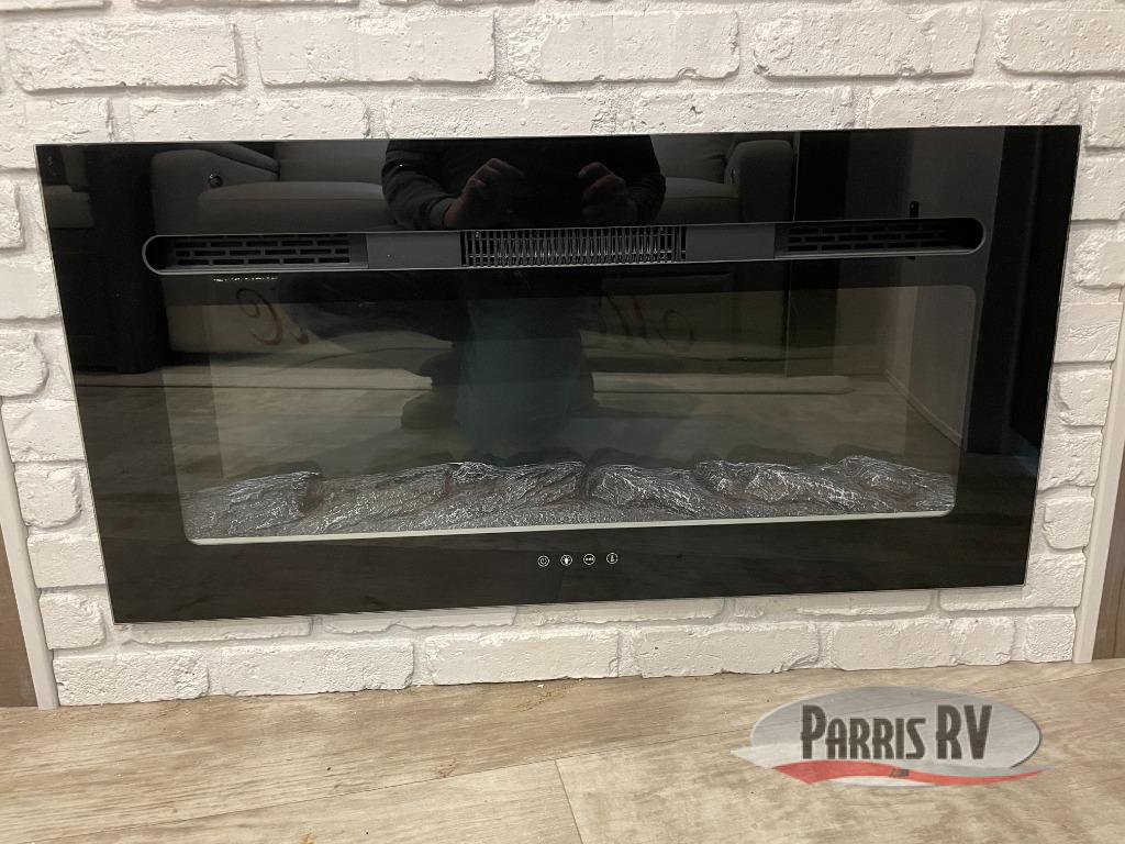 Looking for a trailer that you might like to take extended trips in? This trailer offers a spacious rear full bathroom with a closet as well as a large walk-in-closet that you can add a washer/dryer option. The main living and kitchen area includes a slide out with theater seating and 44" booth dinette that you can enjoy sitting on while watching the LED TV with a fireplace below. The cook will have a choice to make meals using the interior kitchen with full amenities including a counter extension for more prep space, and a large pantry and entry closet for storage, or the outside kitchen and griddle. The front master bedroom offers unique window seating that allows you to sit while putting on your shoes or relax while reading a book. And the 21' power awning includes LED lighting so you can enjoy the outdoors either during the day or night with some protection from the elements.