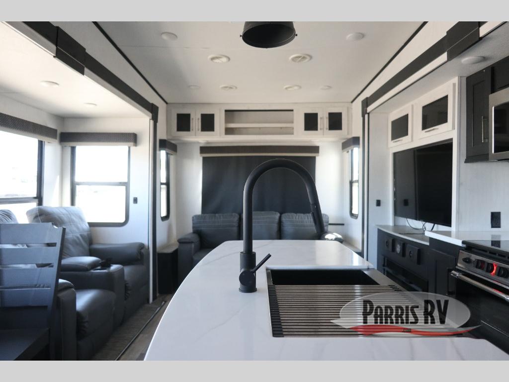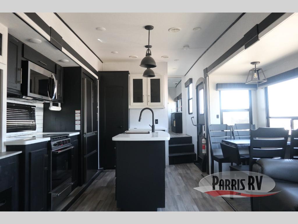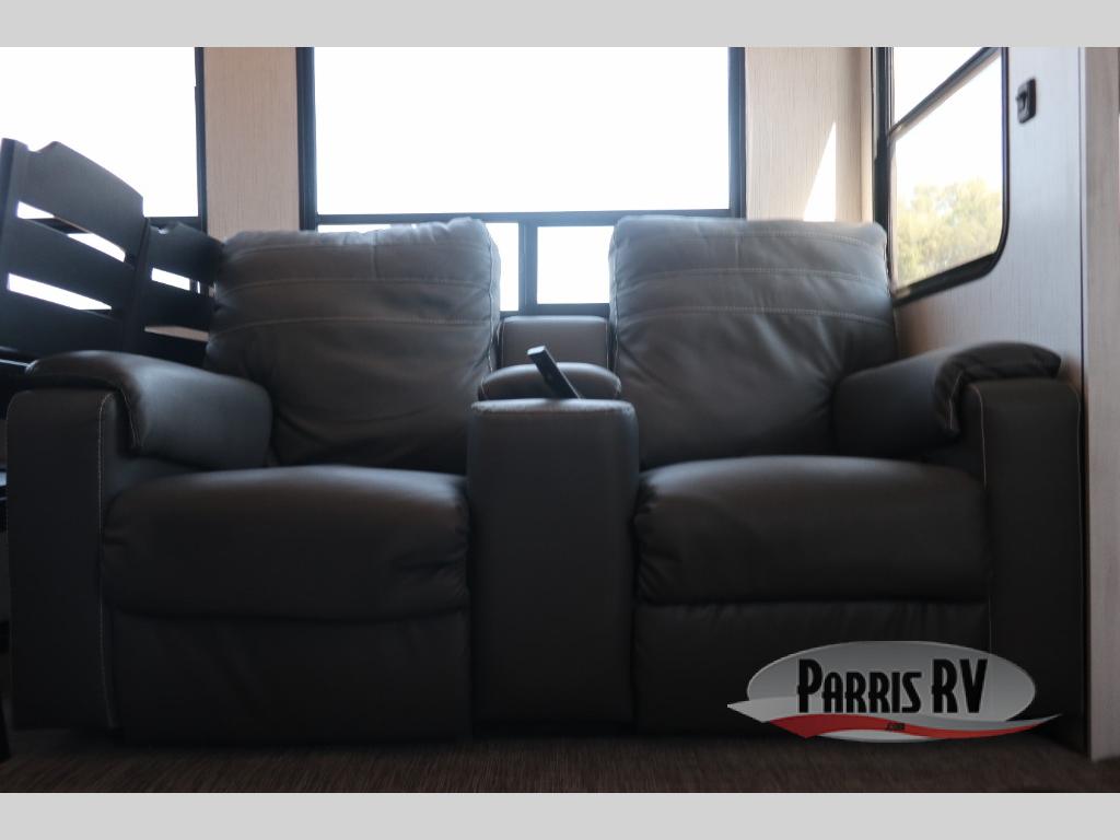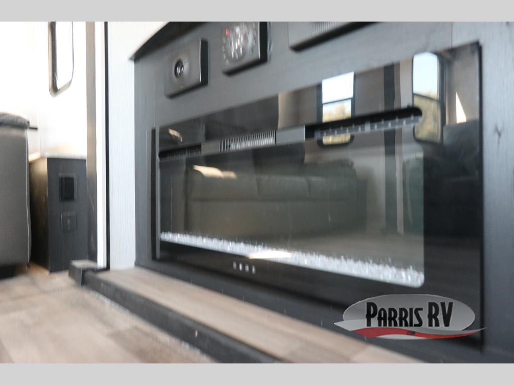 Take your best camping trip in this fifth wheel! When mother nature rains on your parade, you can relax in the rear living area on either the rear sofa or the theater seating across from the entertainment center with a 40" electric fireplace. Prepare your best home cooked meals with the three burner cooktop and 22" stainless steel oven, and the kitchen island will make your meal prepping much easier. You can play games and eat your meals at the free standing table and chairs, and store your favorite snacks in the pantry. Take a nice, hot shower in the full bathroom, then head to the front private bedroom to change into your pajamas stored in the front closet or dresser then lay down on the king bed slide. The front closet even has an area prepped to add an optional washer and dryer!