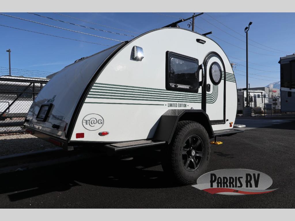 When you are looking to upgrade from a tent, this cute retro look TAG XL Limited Edition might be your solution to outdoor fun with inside sleeping arrangements for two, and an outdoor kitchen! You can enter from either side to enjoy your own queen bed as you look at the stars each night through the large front stargazer window. The interior also offers an air conditioner, under-bed storage, LED lights, and stylish green accents and cabinets. So easy to hitch up and go in your own TAG XL Limited! If you prefer a little Boondocking off-road, choose the optional Boondock package. Please note: standard model specs. shown, Boondock package features 116 lb. dry tongue weight, 1,506 total gross dry weight, and 15" tires instead of standard 13", and the Boondock model is two inches wider at 7'10".