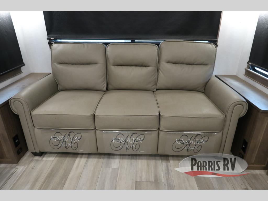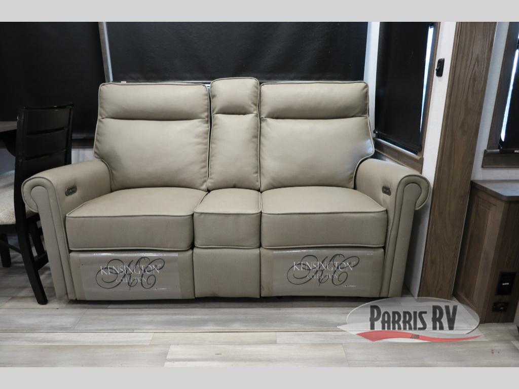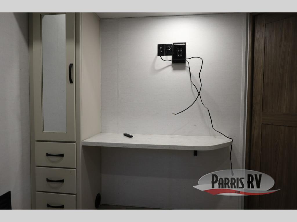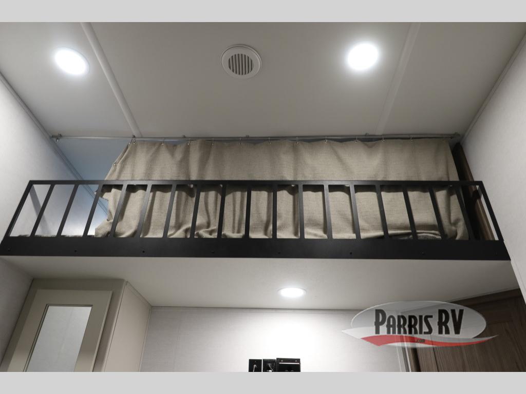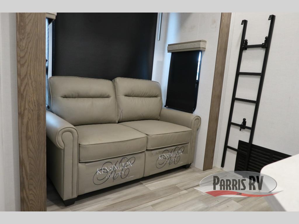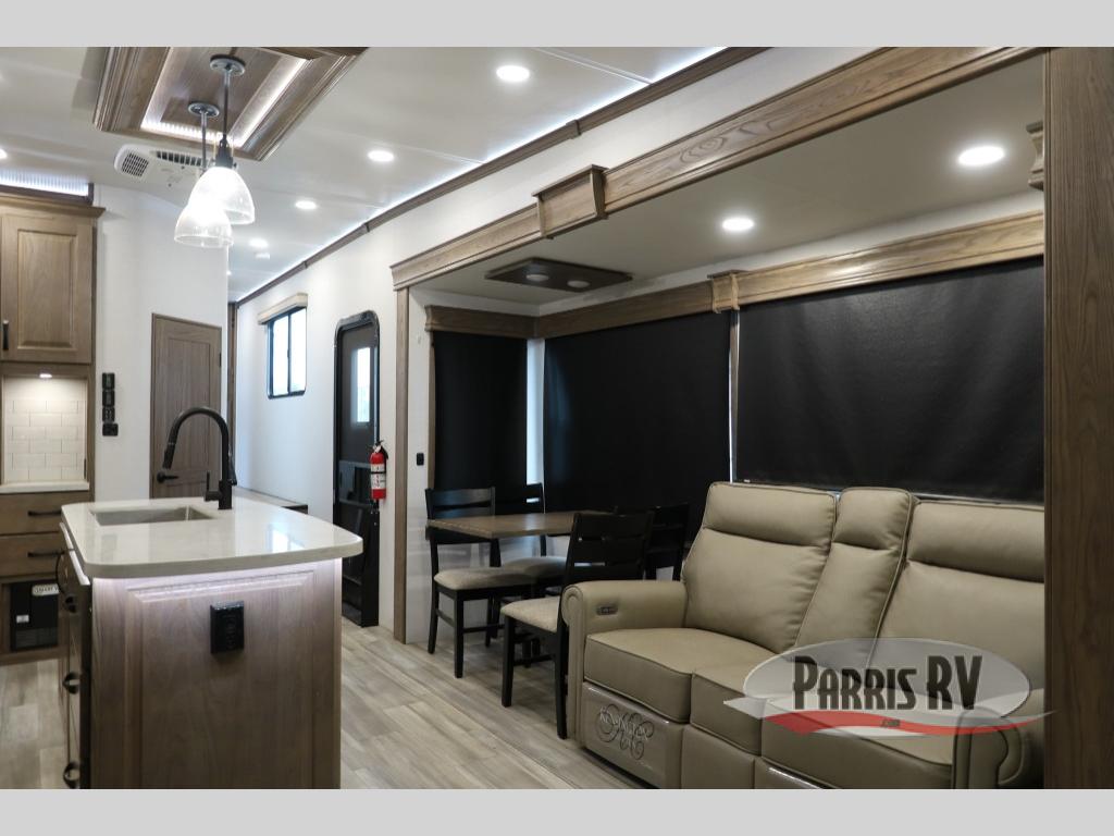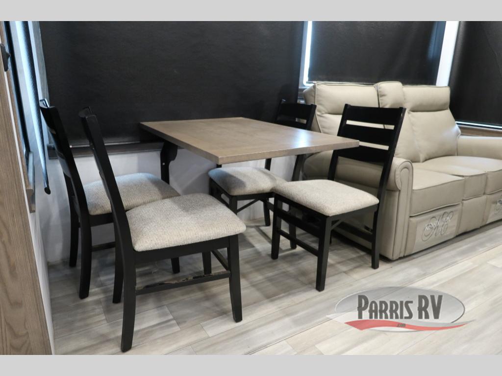Looking to work while traveling, or prefer to have a guest room when friends and family stay overnight? This fifth wheel might just be the answer thanks to the versatile room with a sleeper sofa, overhead storage, and a countertop to work from if you wish. You will find a loft above with a ladder for more sleeping or storage space. The full bathroom is between this room and the front master bedroom which offers a king bed slide or queen bed option, a large front wardrobe with a space for a washer/dryer option, and a flip-top dresser for your clothes. Everyone can gather in the main living and kitchen area that offers residential appliances with a kitchen island with a dishwasher option, two pantries, a hutch, and plenty of seating. You can choose from the sleeper sofa, the dual recliner love seat and/or the floating dinette table with four chairs.
