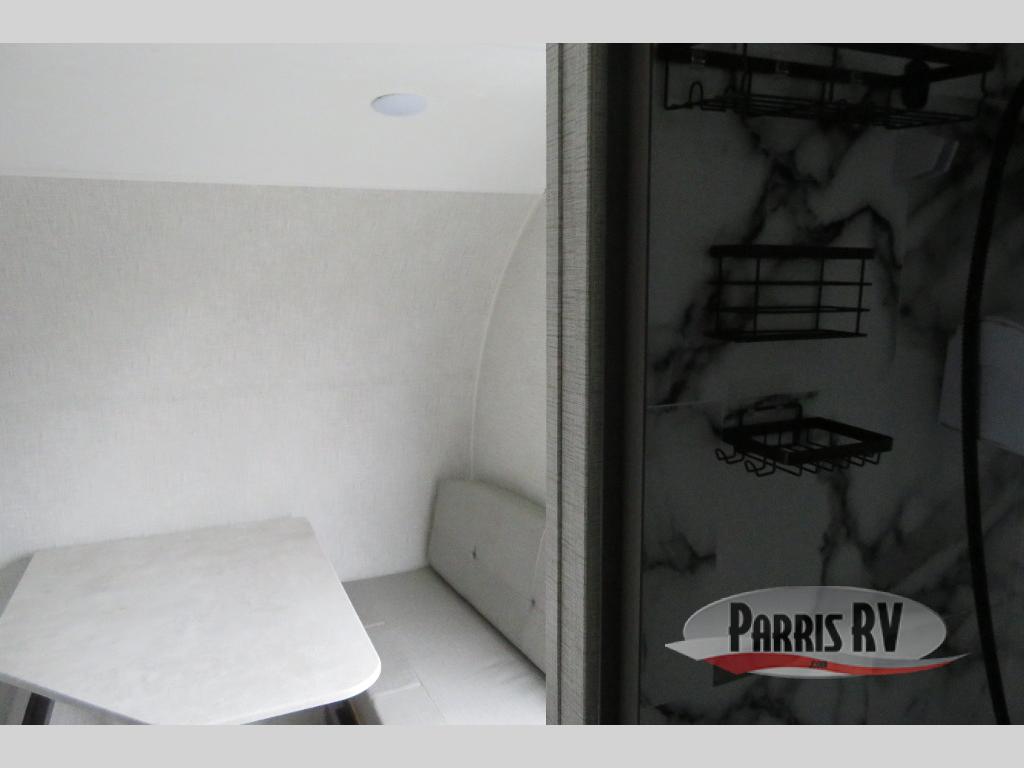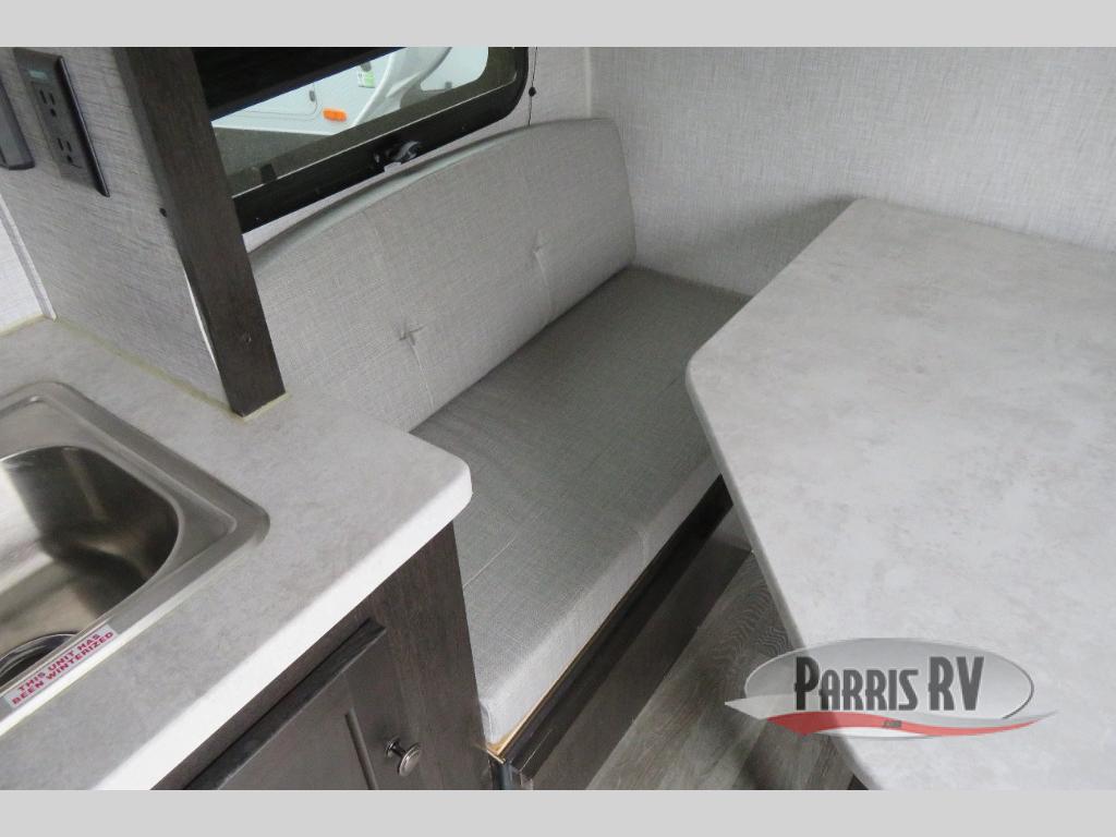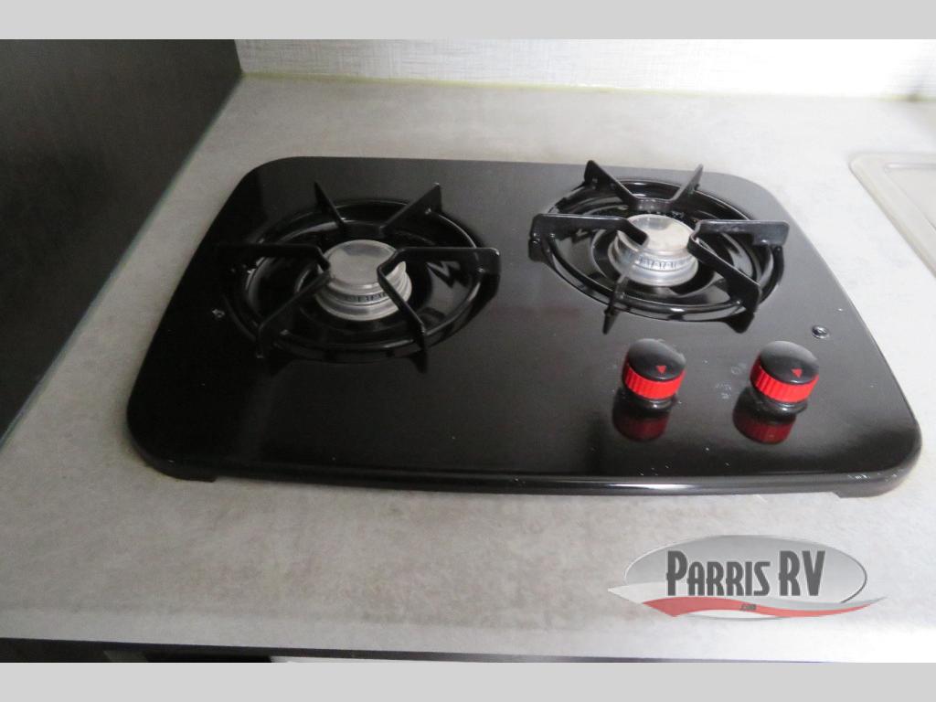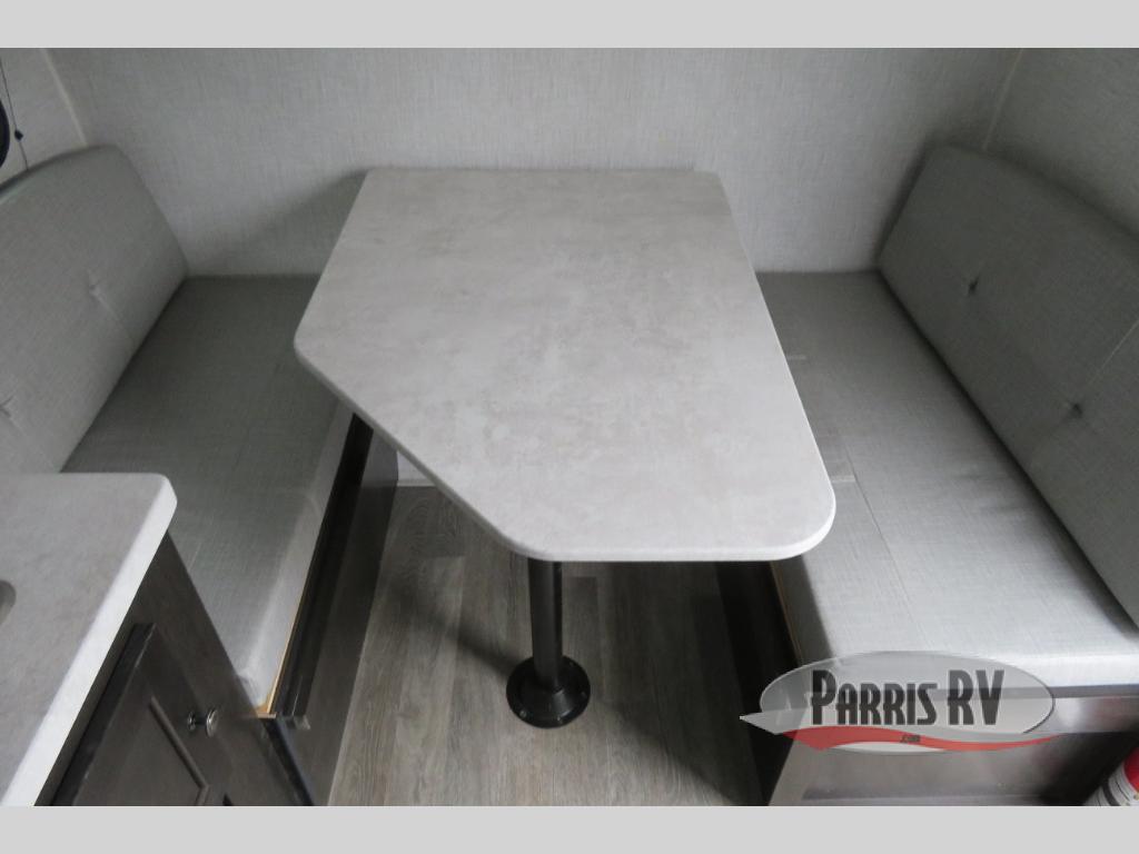 This trailer will feel a little more like home with its queen-size bed! You'll find a convenient wet bath to clean up in each day, plus full kitchen amenities, including a two burner cooktop and a microwave oven. The front dinette with sofas on either side will be perfect for dining, playing games, and sleeping an extra guest. And since there is a 9,000 BTU A/C included you may just decide to camp all summer!