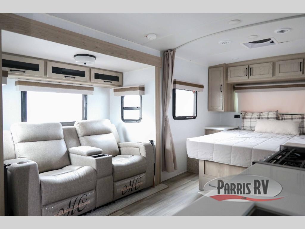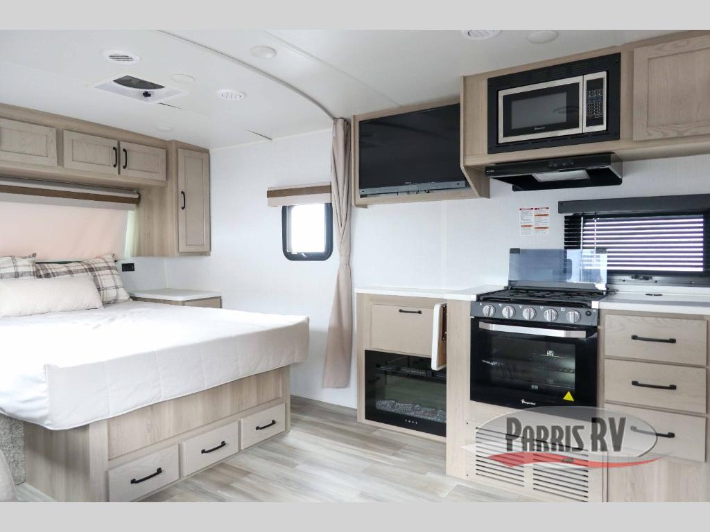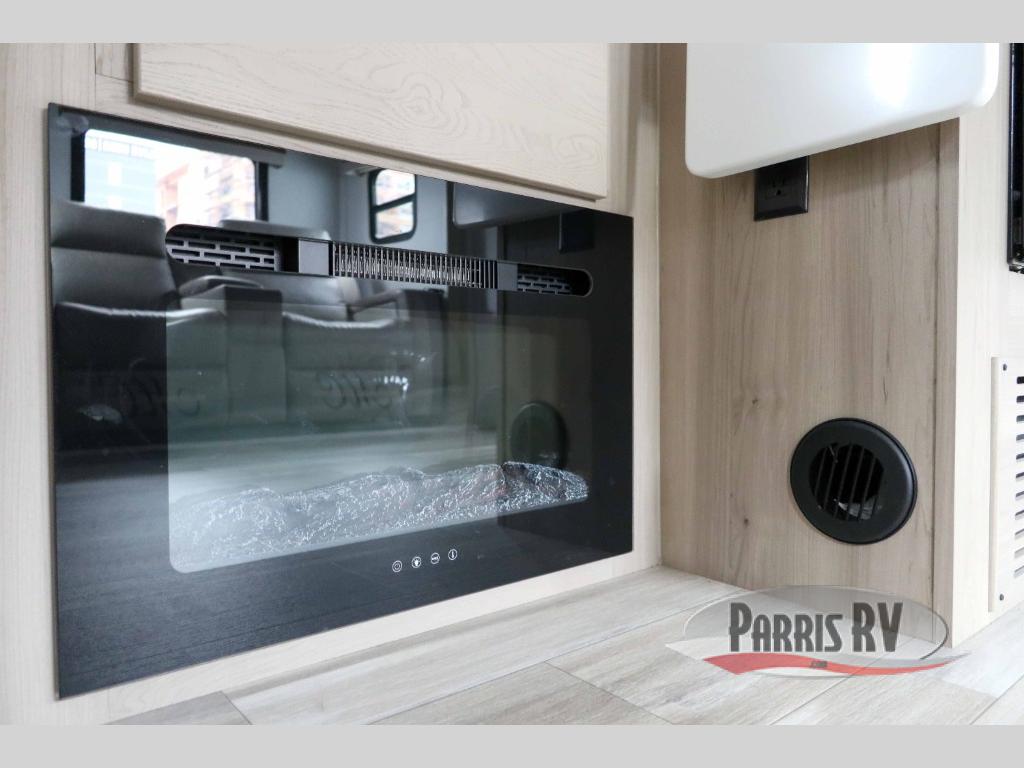 Enjoy the camping season with your spouse, friend, or significant other in this cozy travel trailer for two. Each morning, you can have your coffee on the 67" theater seats with a table within the slide out, then head outdoors to make pancakes on the outdoor griddle with an LP hookup. The interior kitchen includes a three burner cooktop, a microwave oven, plus a 12 volt refrigerator for perishables. An entertainment center with a fireplace will make your space feel more like home, and what's better than sleeping on your own queen bed with dual bedroom wardrobes for your clothes!?