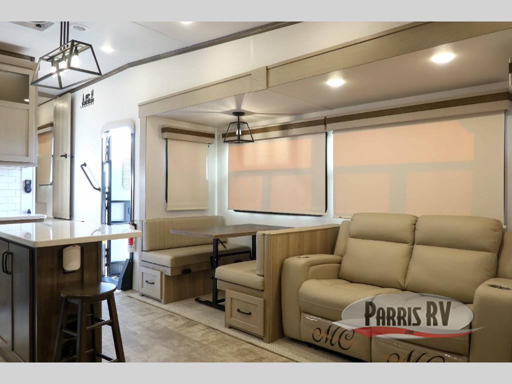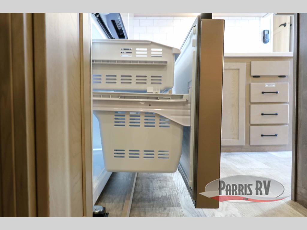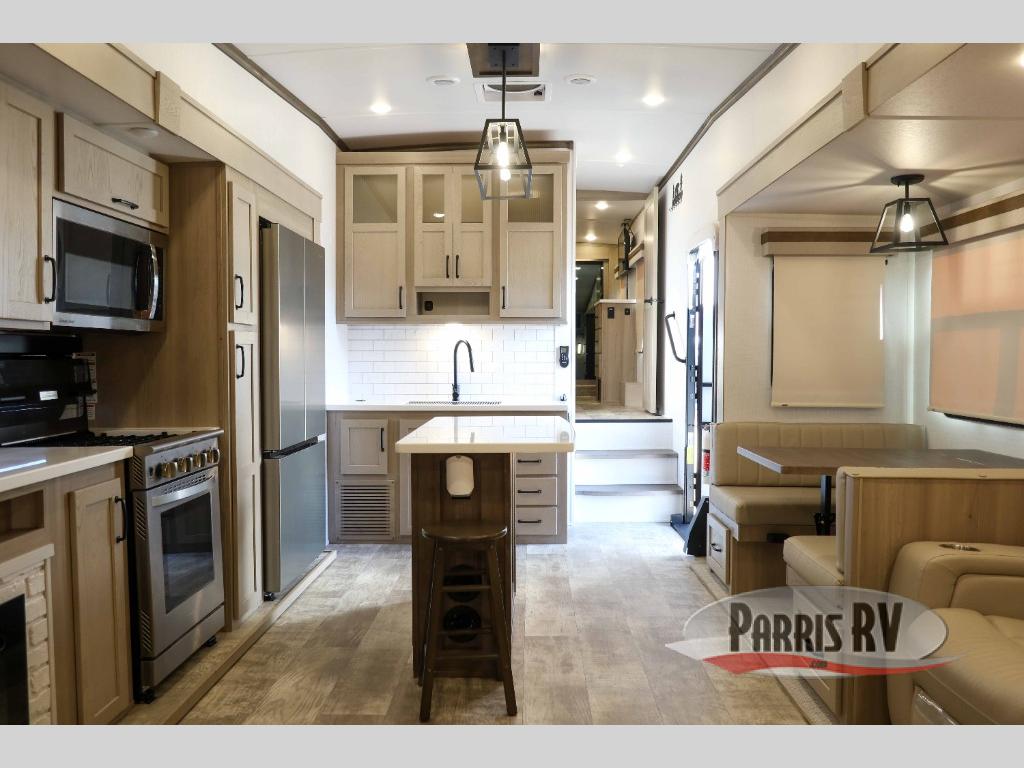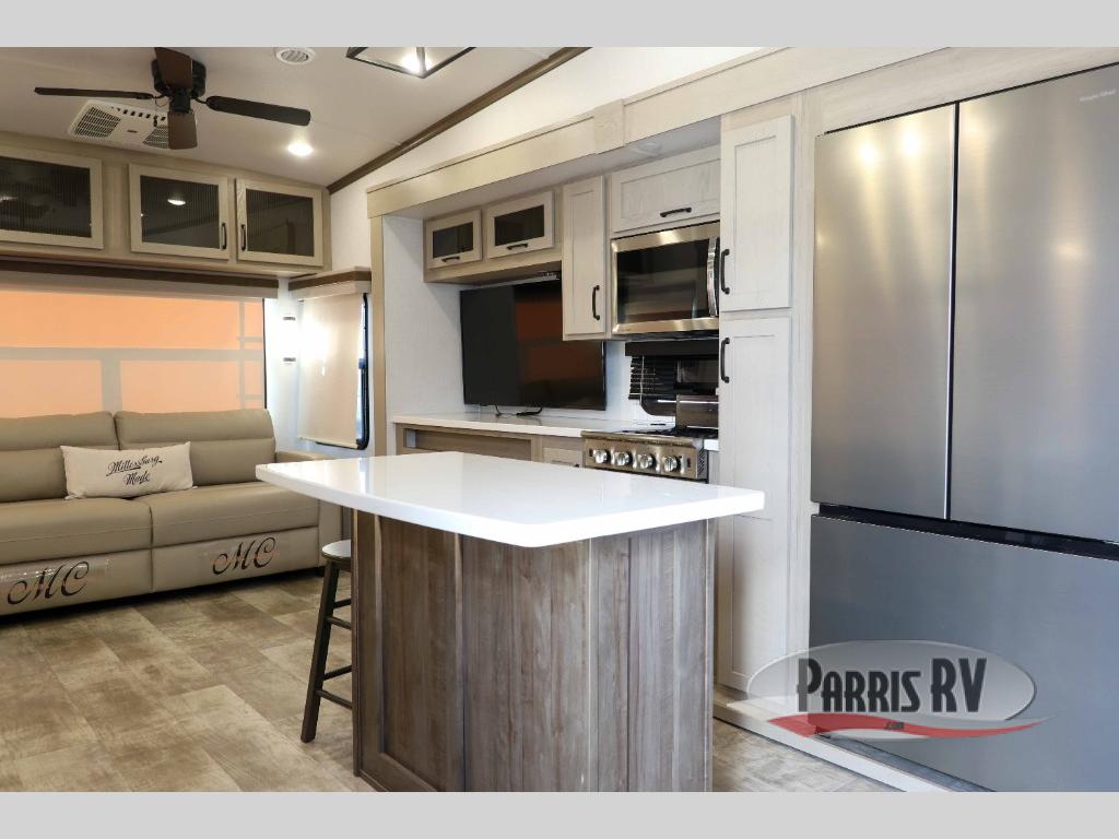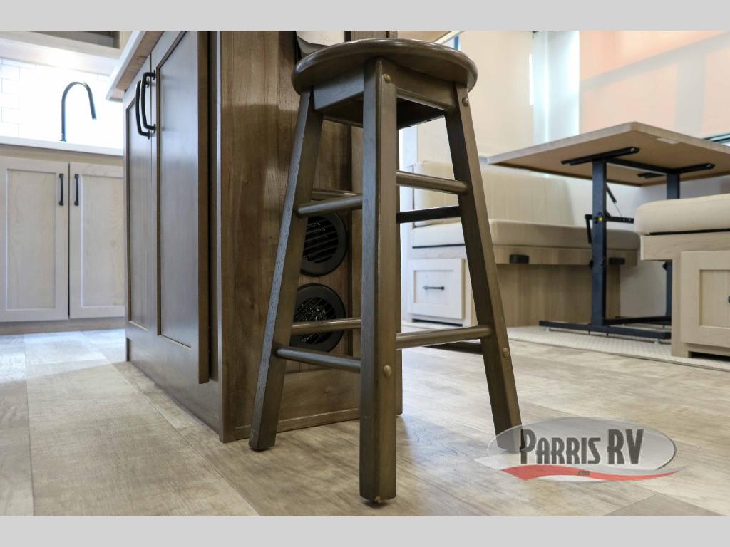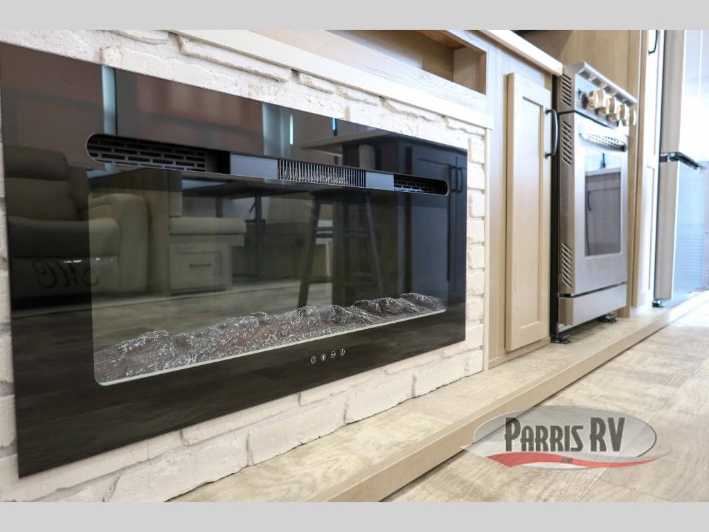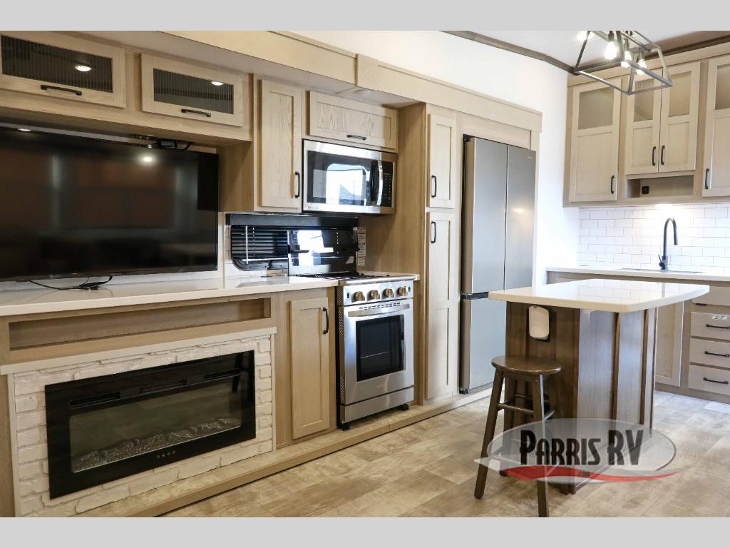 You can enjoy views from inside or outside each day once this RV is set up at the campgrounds! The large windows in the furniture slide and the windows throughout allow you to take in the scenery, and the three slide outs give you a spacious main living and kitchen area as well as front bedroom. You will find lots of seating for guests on the hide-a-bed sofa in the rear, and on the theater seats and booth dinette in the slide, plus there are two stools to use at the kitchen island. The cook will love the residential refrigerator and large pantry to store food, and everyone can enjoy the Smart TV and fireplace when visiting and relaxing. And the front bedroom offers a queen bed slide, a front wardrobe, a shirt closet and a space prepped for a washer/dryer option.