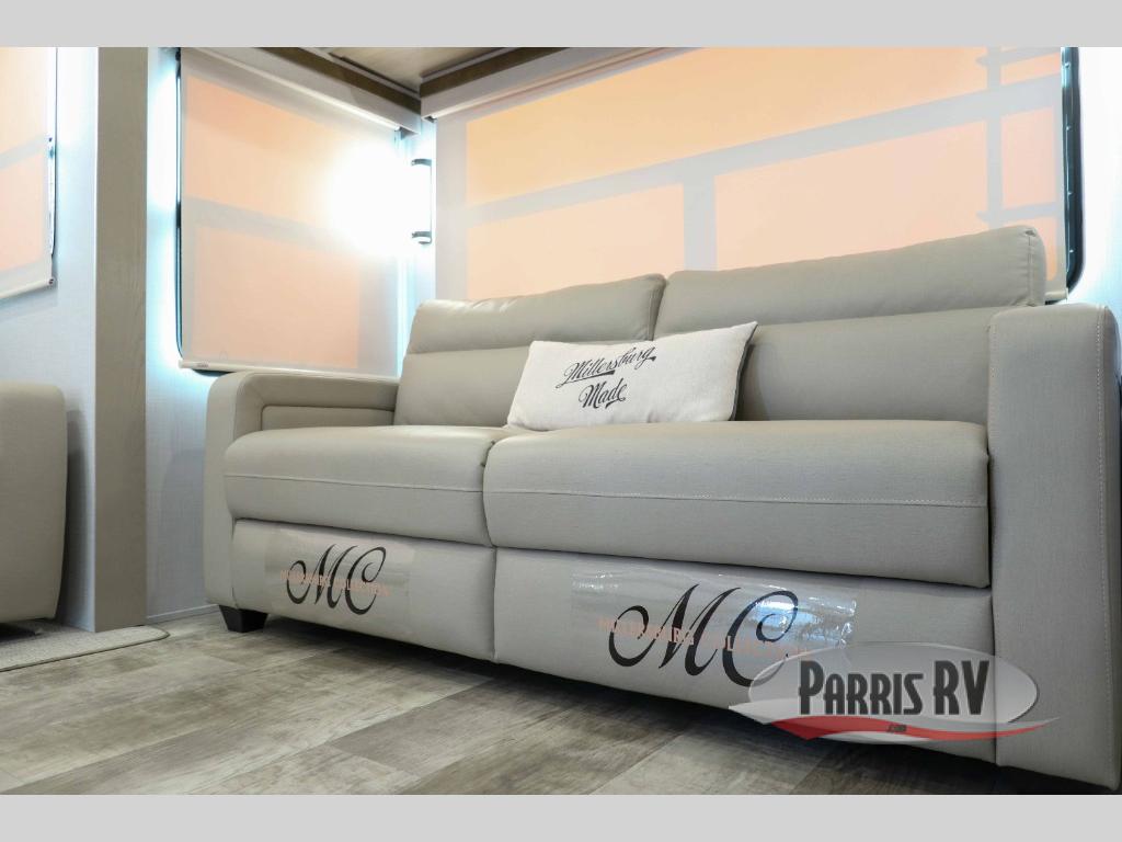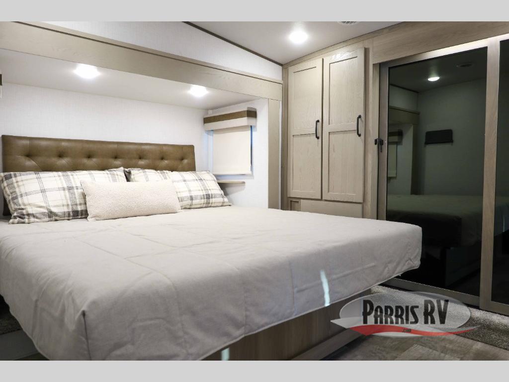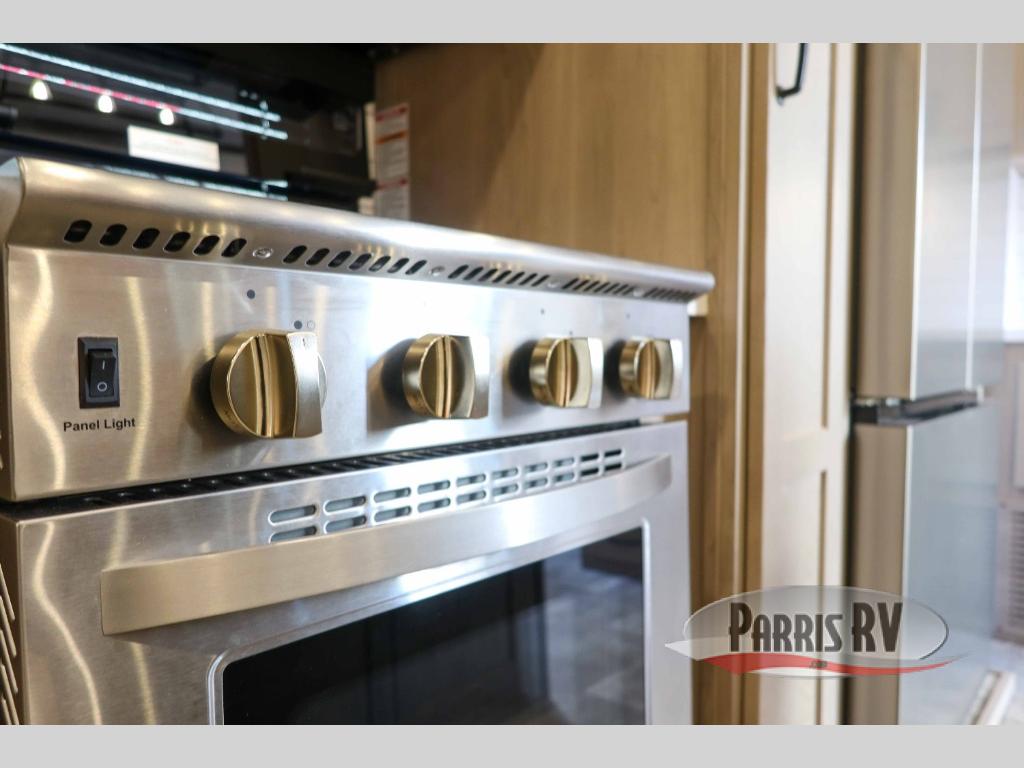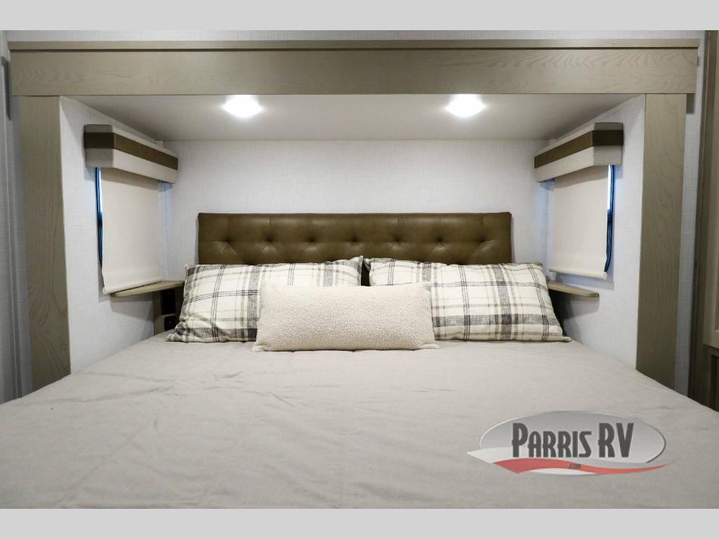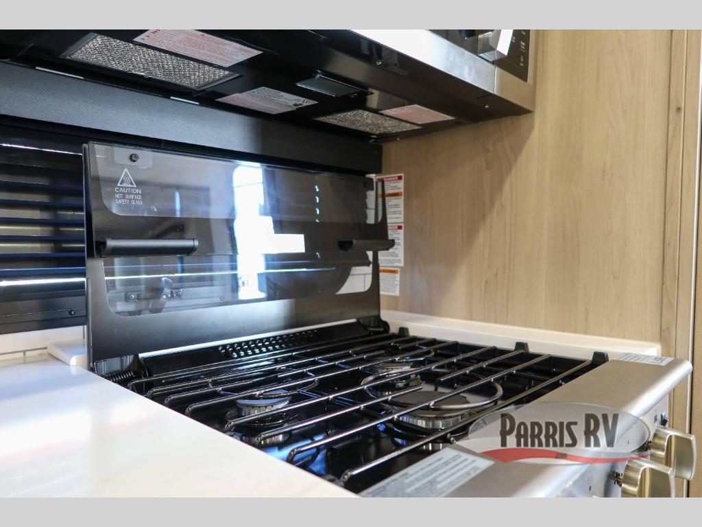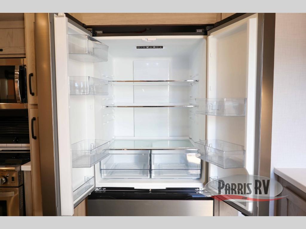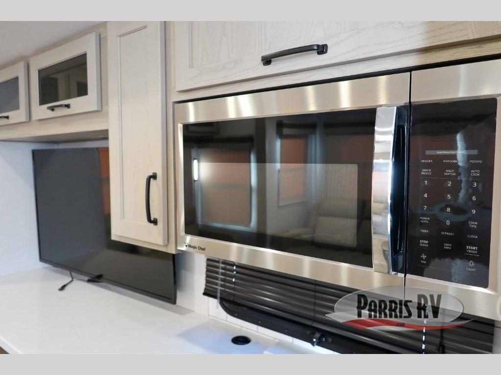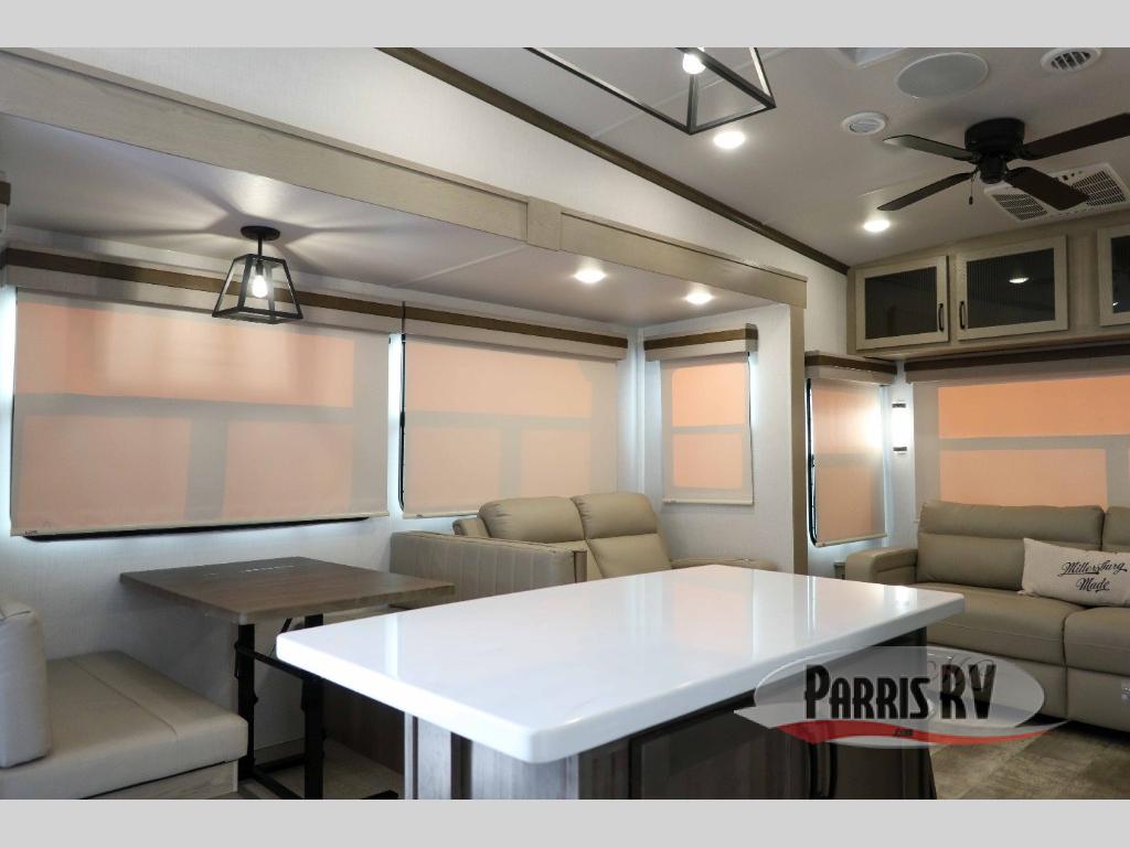 You can enjoy views from inside or outside each day once this RV is set up at the campgrounds! The large windows in the furniture slide and the windows throughout allow you to take in the scenery, and the three slide outs give you a spacious main living and kitchen area as well as front bedroom. You will find lots of seating for guests on the hide-a-bed sofa in the rear, and on the theater seats and booth dinette in the slide, plus there are two stools to use at the kitchen island. The cook will love the residential refrigerator and large pantry to store food, and everyone can enjoy the Smart TV and fireplace when visiting and relaxing. And the front bedroom offers a queen bed slide, a front wardrobe, a shirt closet and a space prepped for a washer/dryer option.
