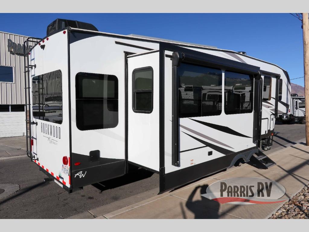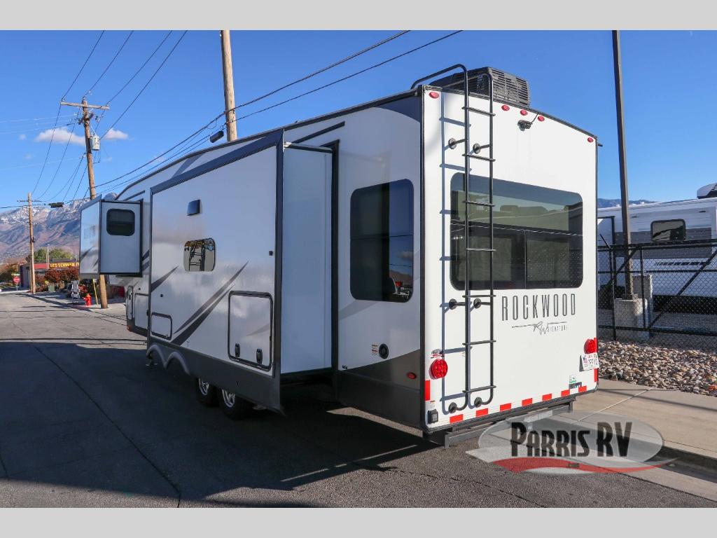 With any Rockwood Signature fifth wheel or travel trailer by Forest River RV, you will enjoy superior construction that includes laminated white fiberglass sidewalls, a radius roof with vaulted interior ceilings, plus radiant foil insulation and an enclosed underbelly for use in all types of weather. Some convenient exterior features include a power tongue jack, a torsion axle, Rubber-Ryde suspension, and a tire pressure monitor system with a monitor for added safety. The interior offers a One Touch OneControl panel with WeRV app control, for lights, awning, slides, water heater and more, and the Air 360+ omnidirectional antenna with WiFi prep lets you work while away from home if needed. You will also appreciate the interior vaulted ceilings, residential soft close doors and drawers, solid surface kitchen countertops, and designer kitchen backsplash!