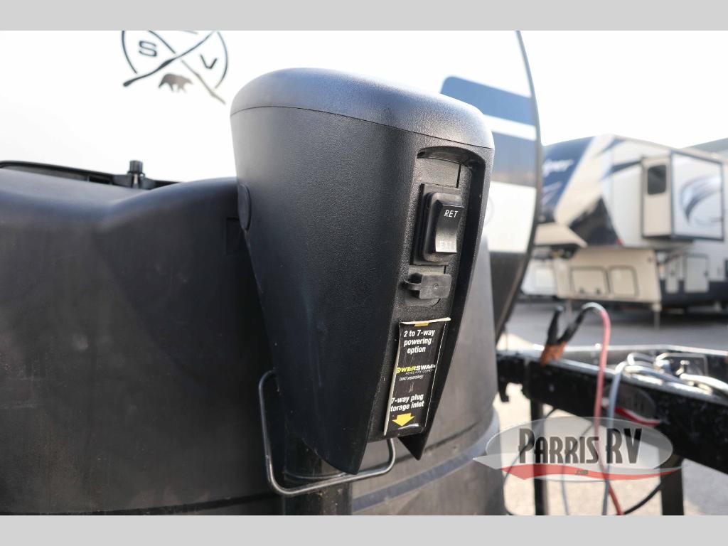 With any Surveyor Legend travel trailer by Forest River you will enjoy quality craftsmanship, convenient amenities, and at-home comforts. The Azdel composite walls provide a longer-lasting trailer, and the power tongue jack with a hitch light will get you back on the road in no-time. There are also Goodyear tires and a tire pressure monitoring system for hassle-free towing. Each model includes the Surveyor Legend Package that comes standard with oversized dinette storage access doors, front slam latch baggage doors, plus an automotive style tinted front windshield. You'll appreciate camping with a tankless water heater for endless hot showers, a 2" accessory hitch to bring bikes along, plus carpet-free interiors and a central vacuum system for easy clean up.